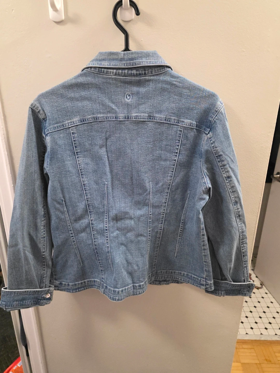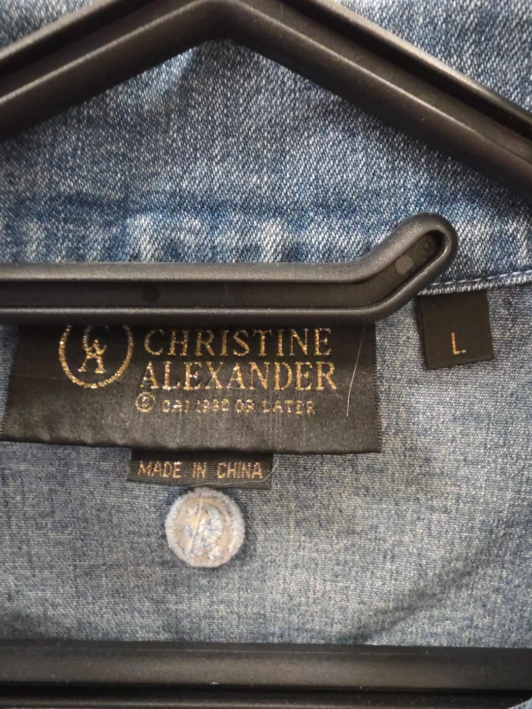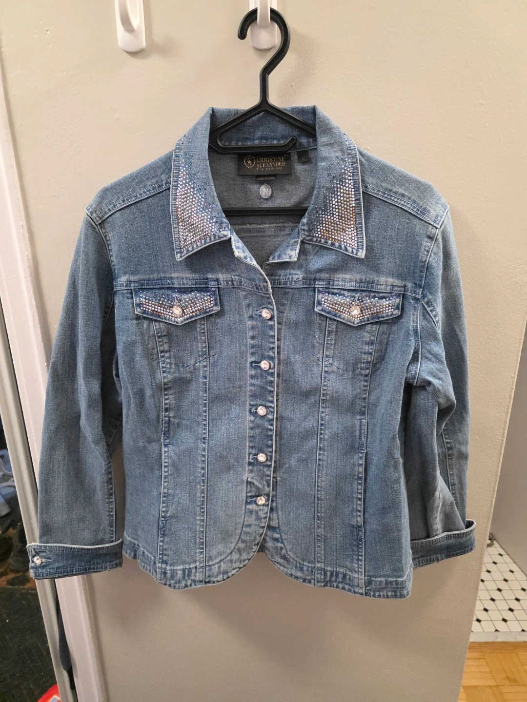 Selling a Christine Alexander denim jacket in size L. It's a light wash denim with some embellishments on the collar and pockets. Perfect for adding a bit of sparkle to your outfit!