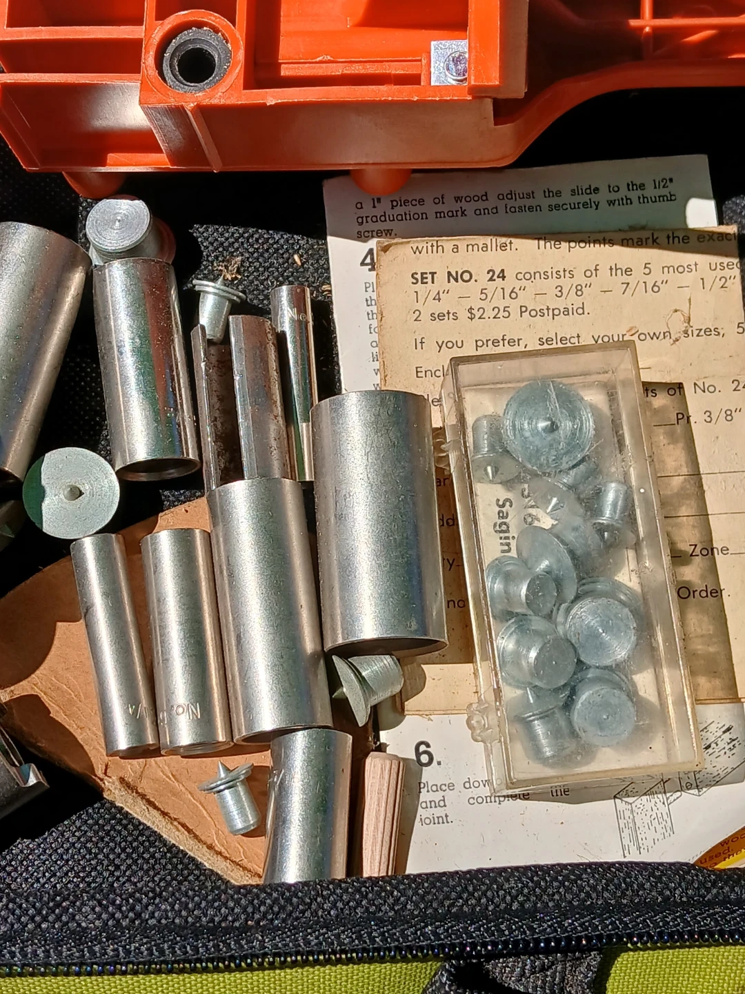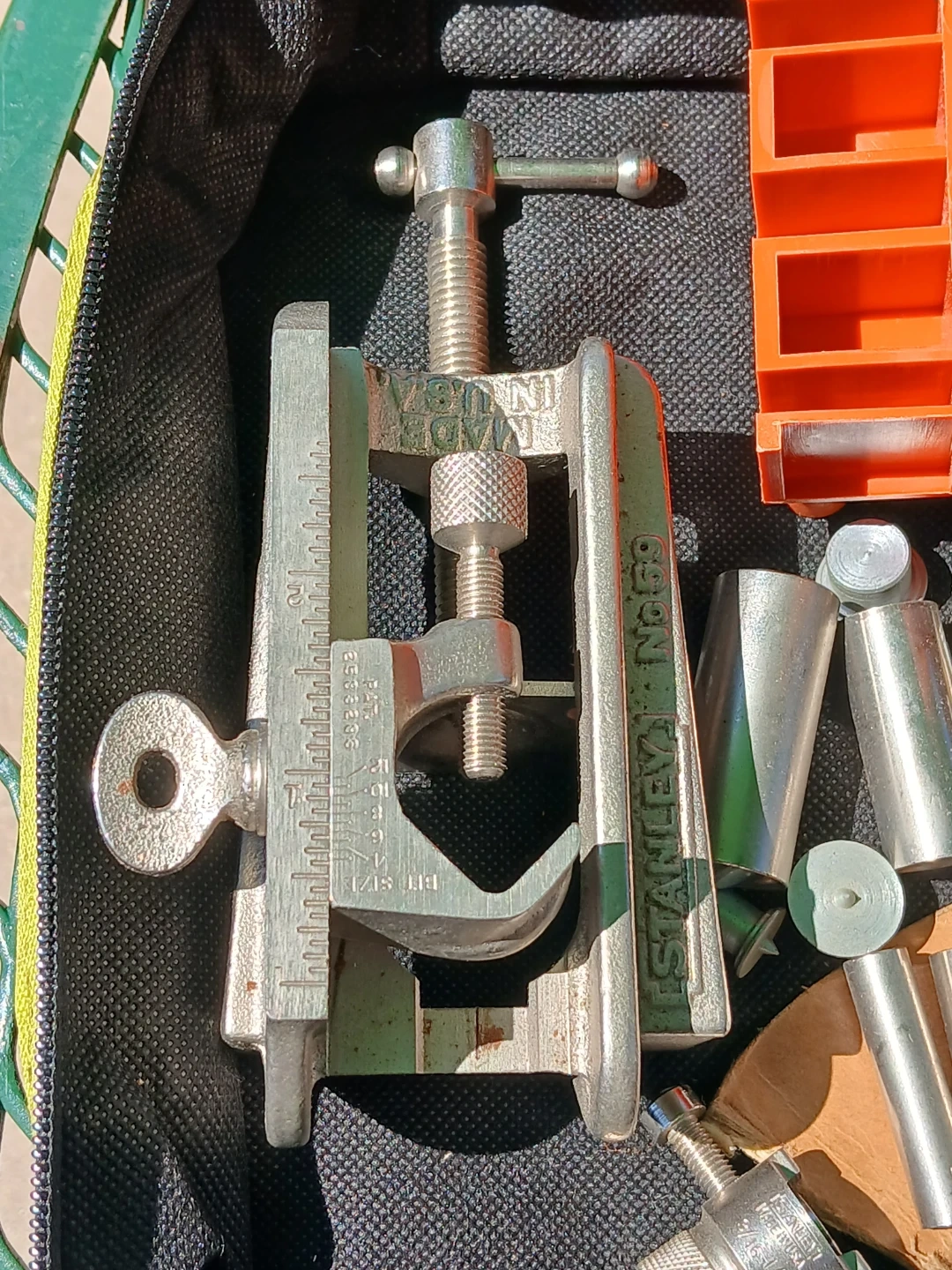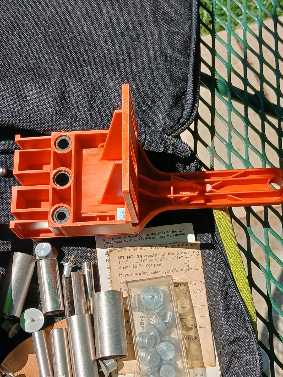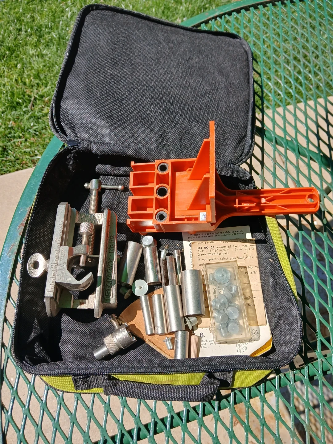 This is a Stanley drill jig kit. It includes various metal drill guide bushings and screws. Also includes a metal clamp guide and what appears to be a pocket hole jig component. All items are contained within a zippered bag. Used in good condition. CASH only, no zelle, no Paypal.
