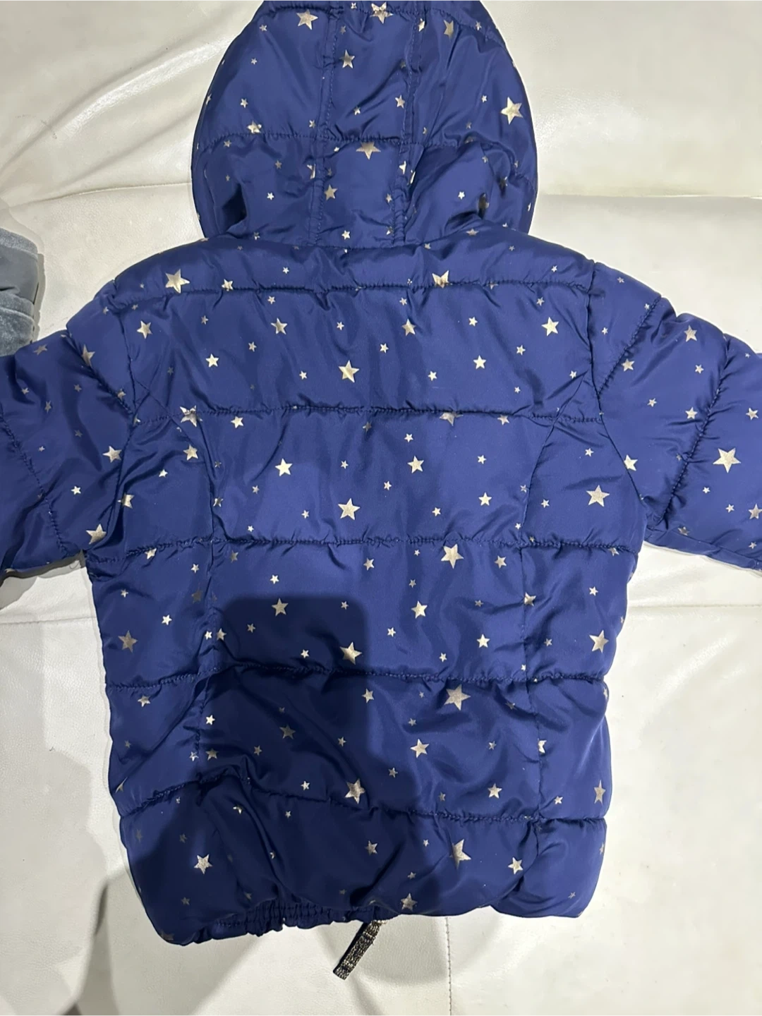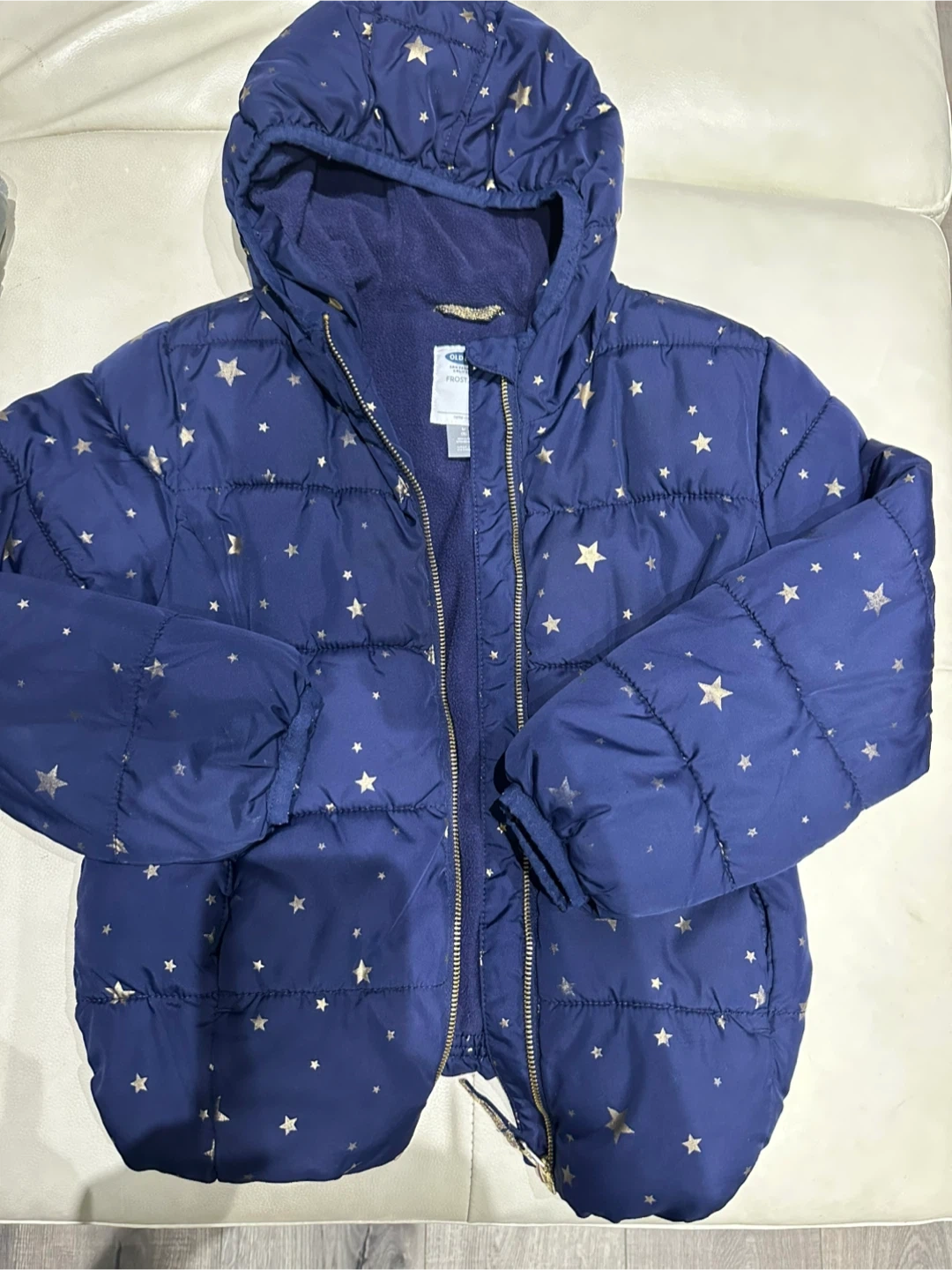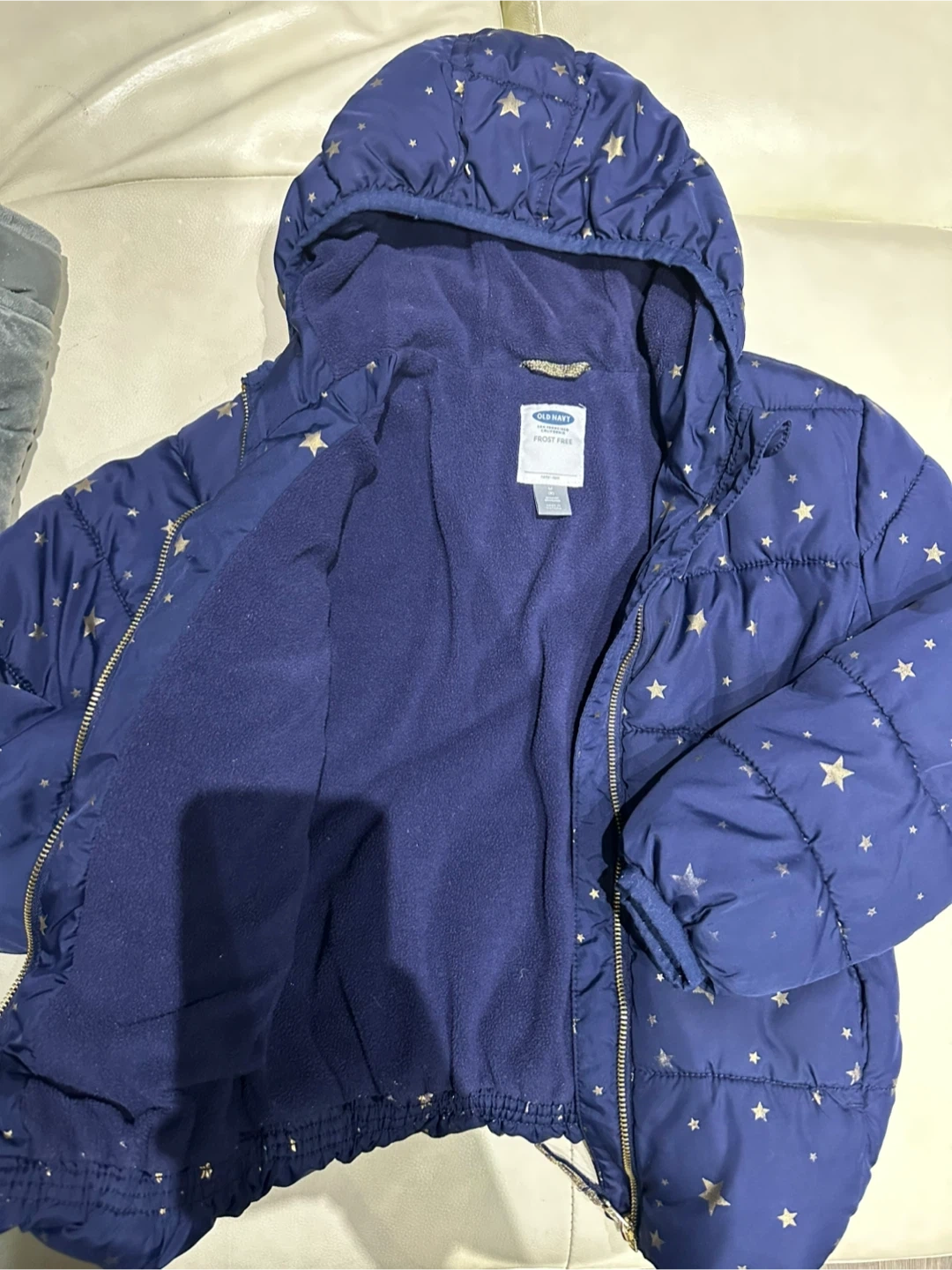 A cute Old Navy puffer jacket in size 5T. It's navy blue with gold stars all over. Perfect for keeping your little one warm and stylish!