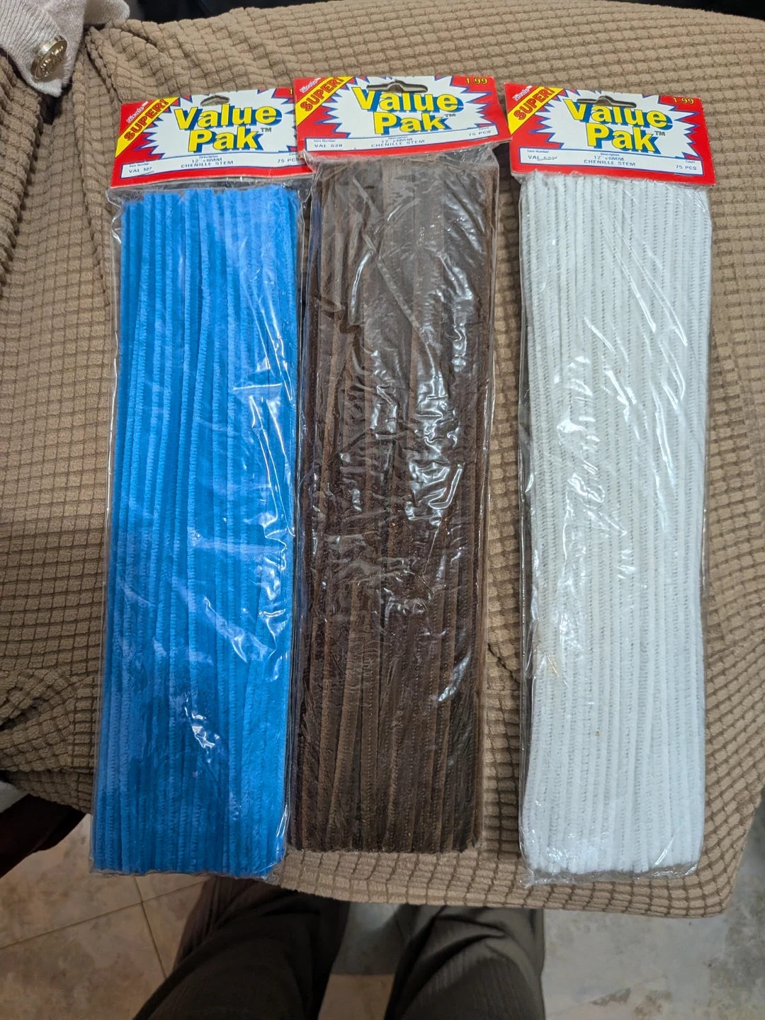 This listing includes three value packs of chenille stems. Each pack contains 75 stems. Available colors are blue, brown, and white.
