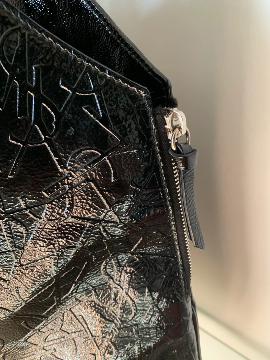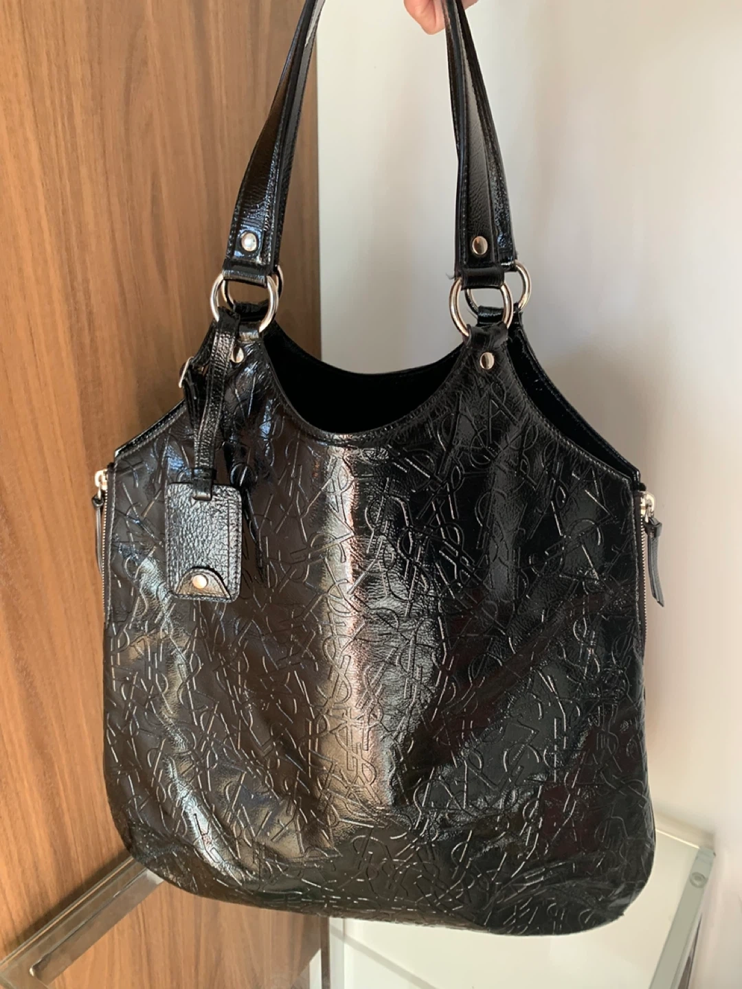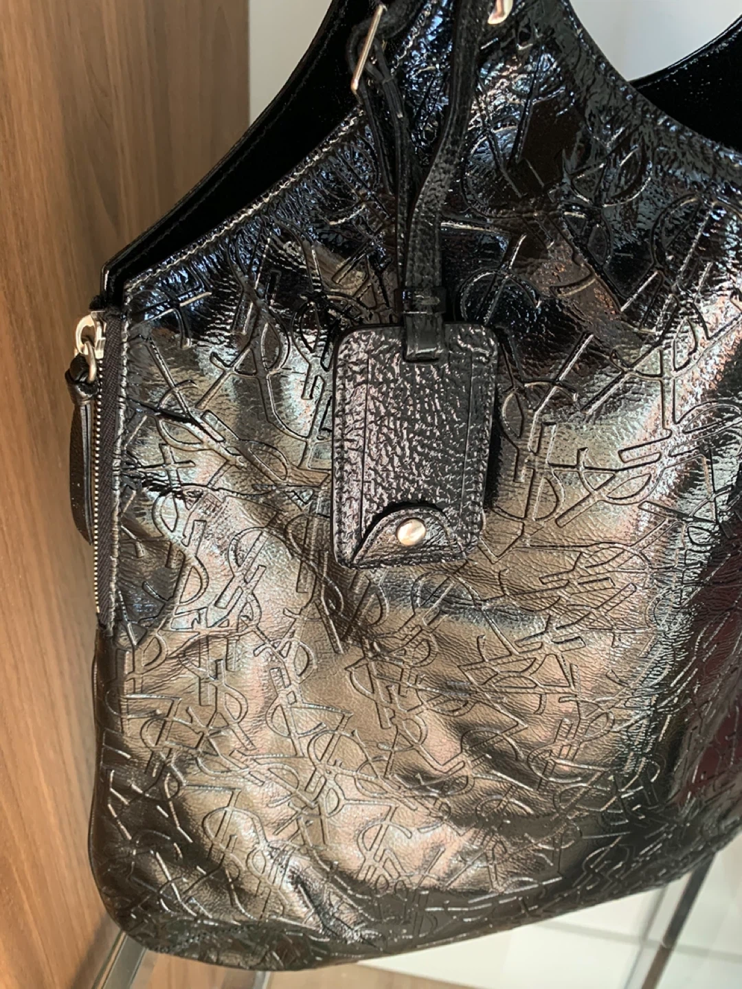 This is an Yves Saint Laurent black patent leather tote bag. It features a classic YSL logo pattern embossed on the exterior and a zippered closure. The interior has a zippered pocket and a fabric lining. Bag is a shoulder style with leather straps.