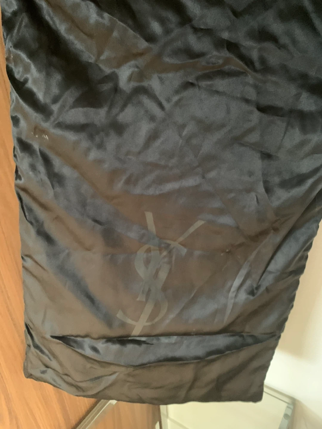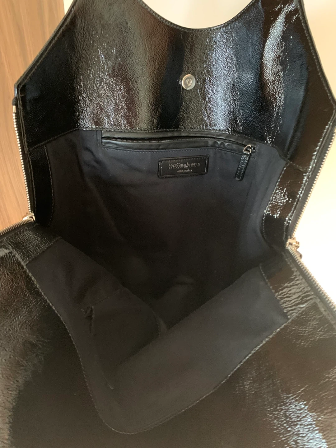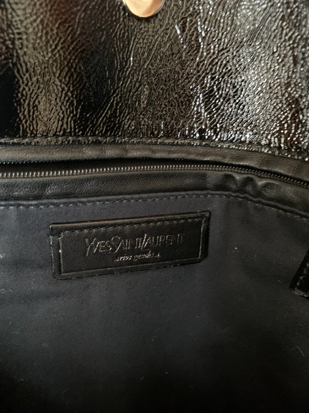 This is an Yves Saint Laurent black patent leather tote bag. It features a classic YSL logo pattern embossed on the exterior and a zippered closure. The interior has a zippered pocket and a fabric lining. Bag is a shoulder style with leather straps.