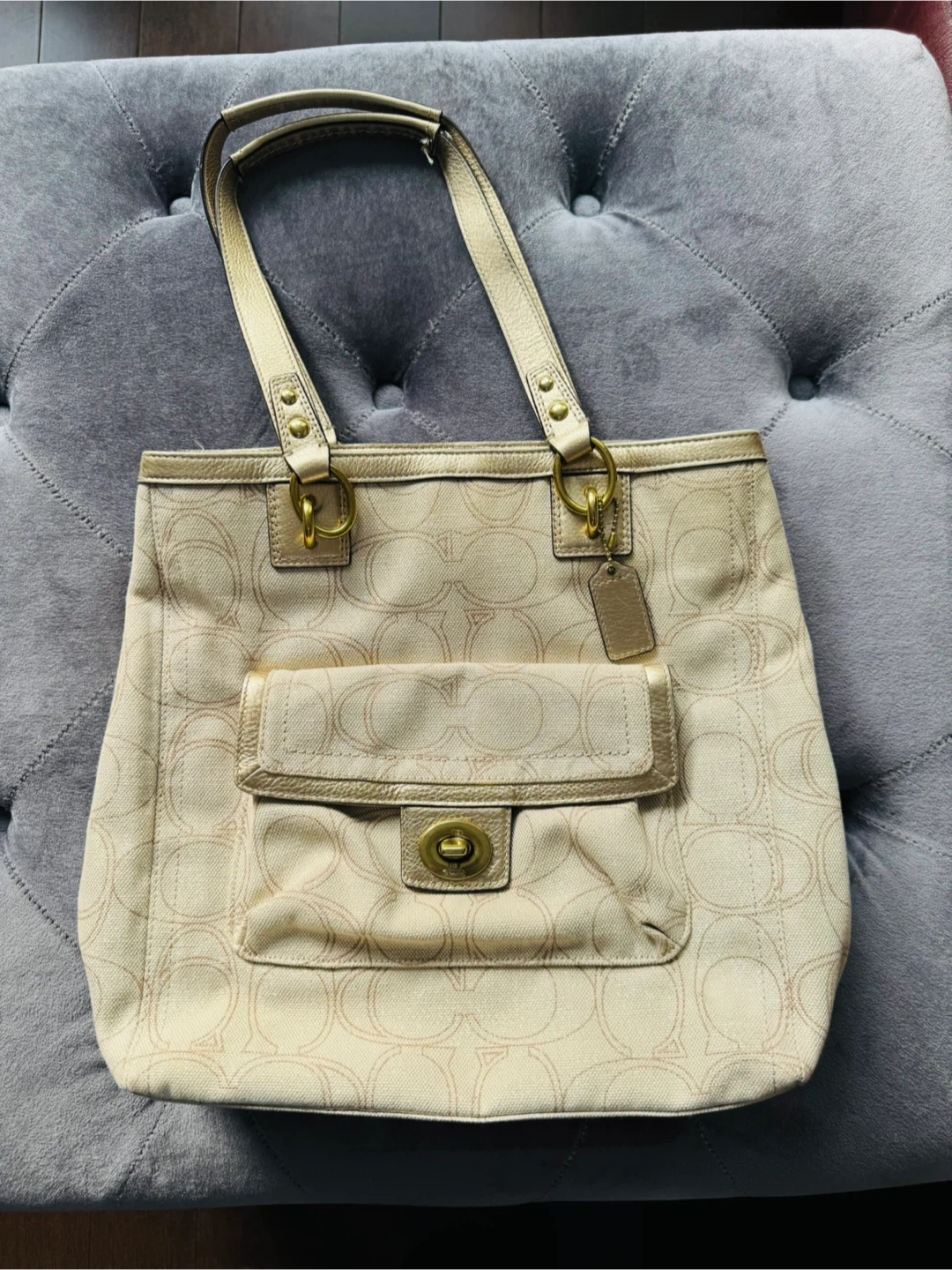 94Gently used Coach tote bag in a lovely beige (shimmer) and gold colour combination. It's a stylish and practical canvas bag for everyday use! The bag features a secure closure and multiple pockets inside to keep your belongings organized.