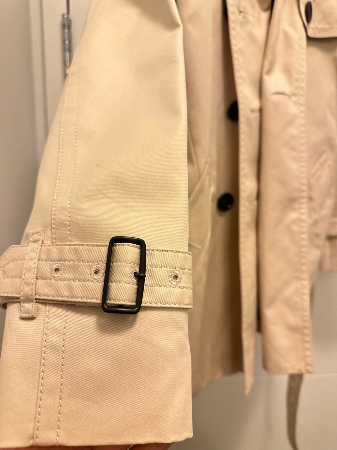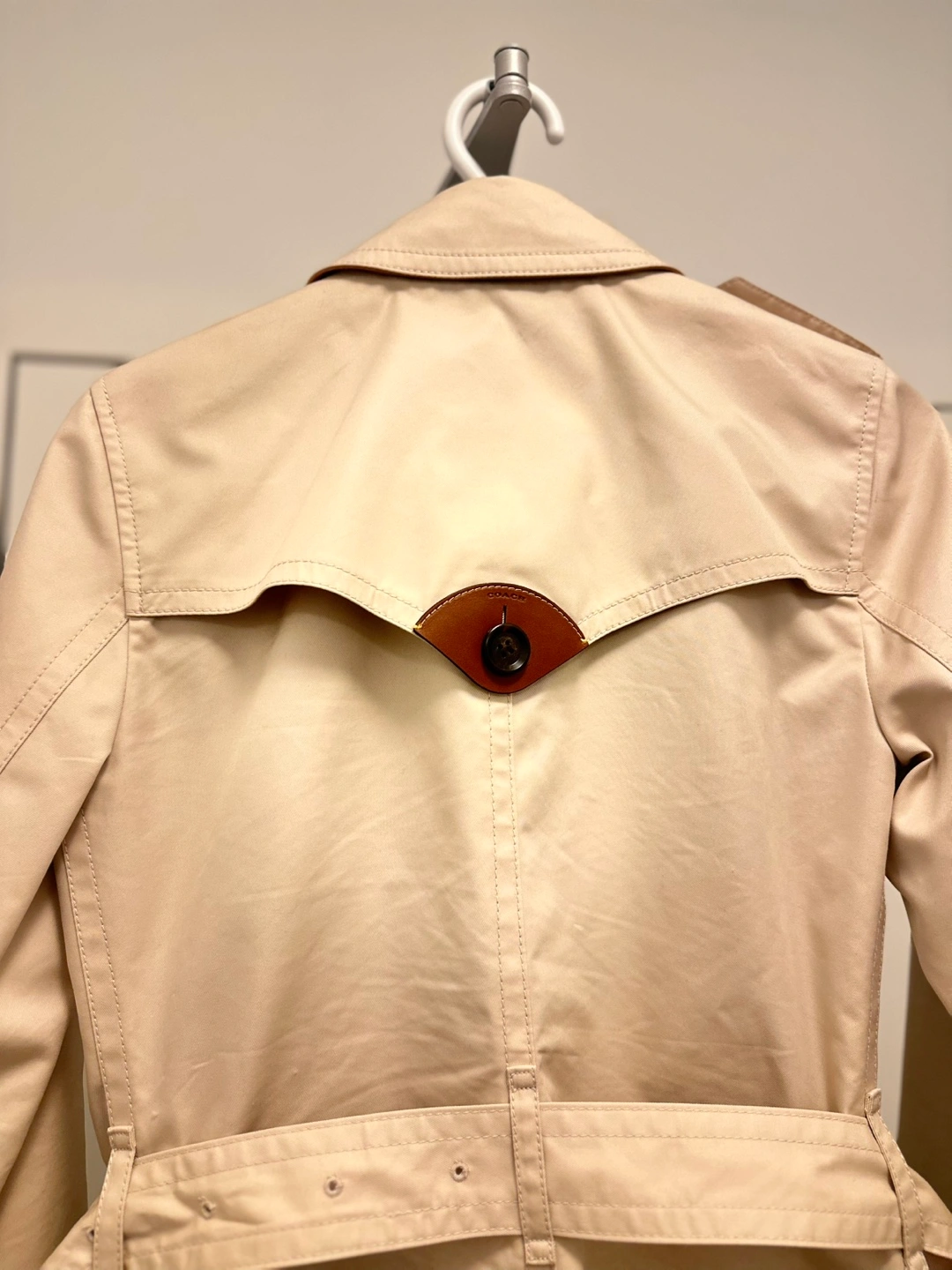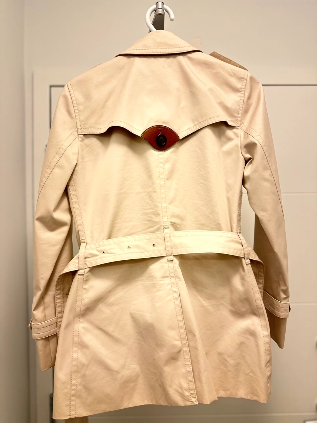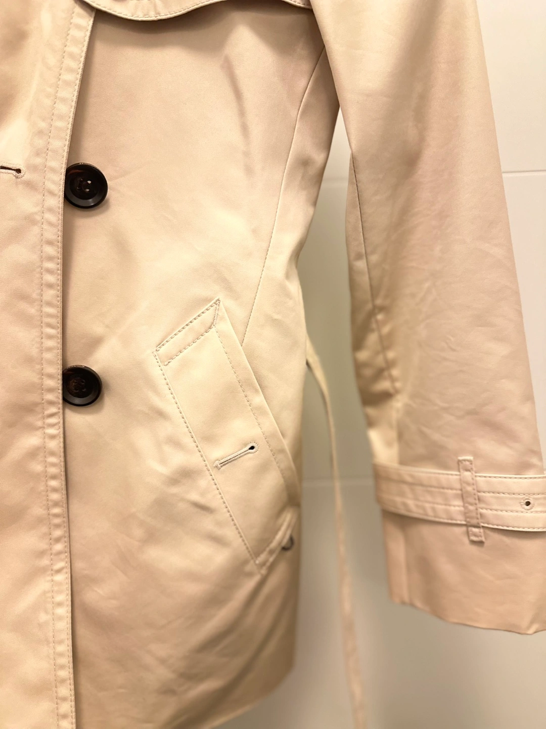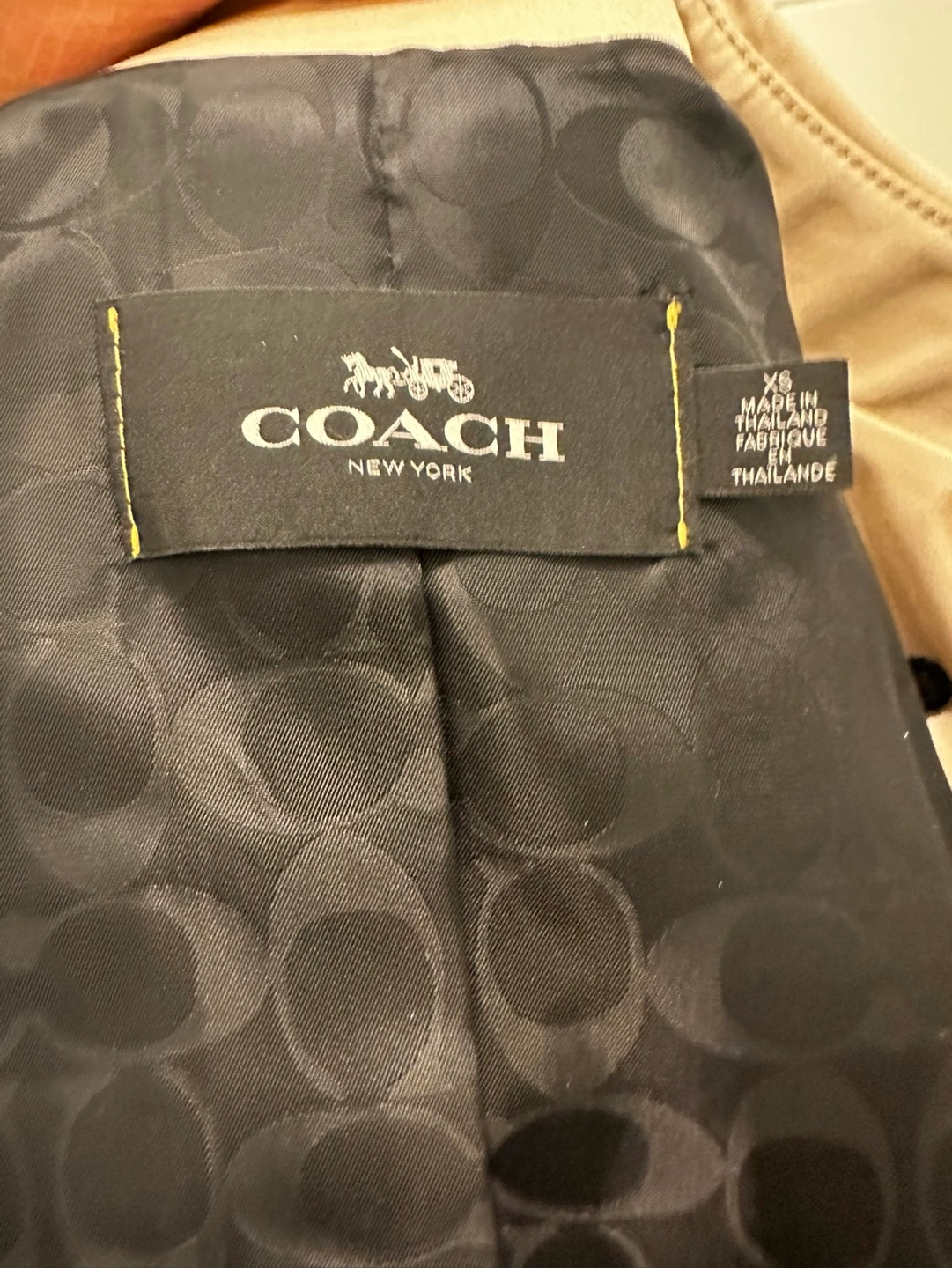 94Coach Women's beige trench coat. Classic style. Features a belt, button closures, and a yoke detail at the back. Fully lined.