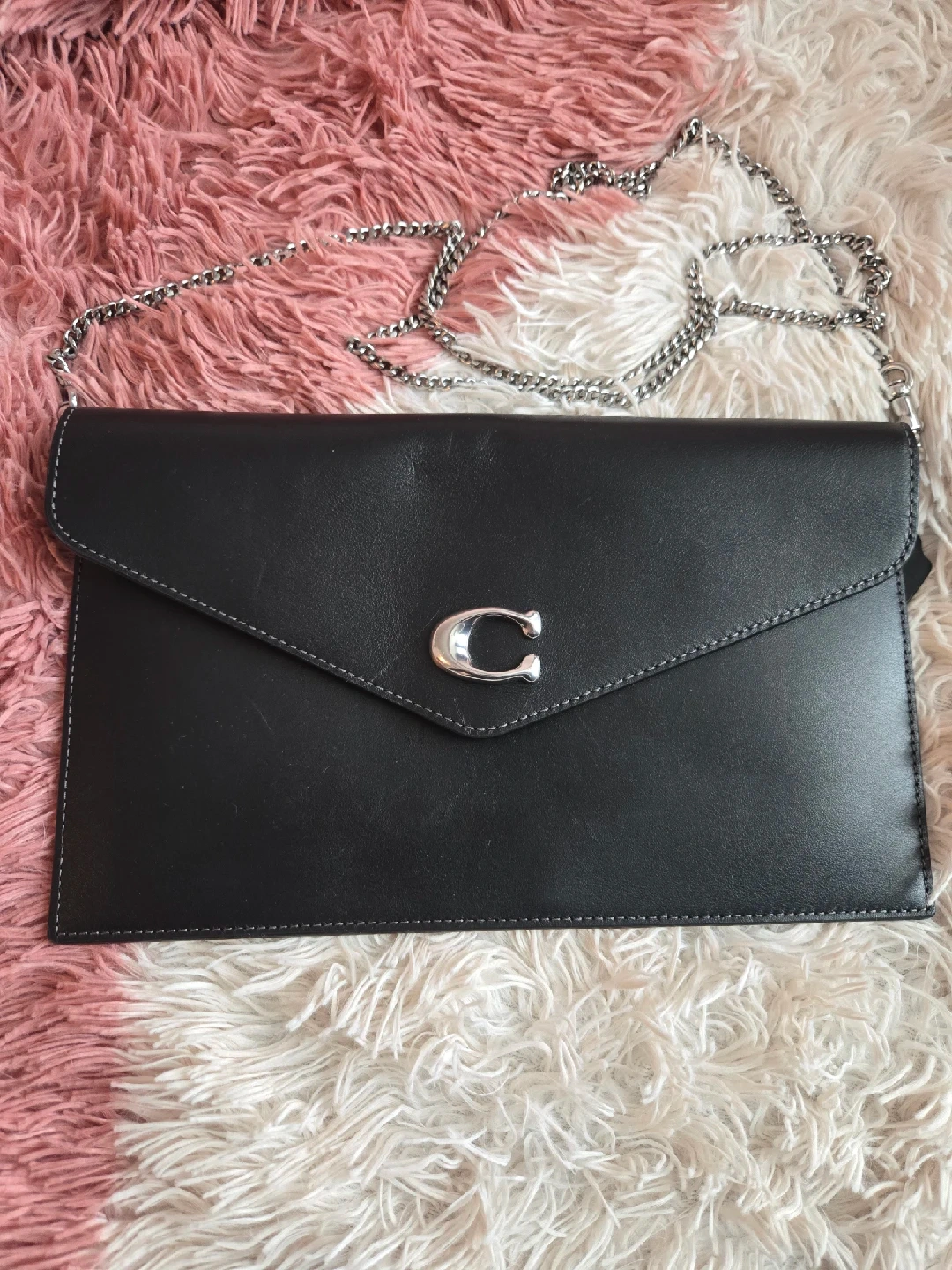 677This is a stylish black leather crossbody bag from Coach. It features a silver chain strap and a signature 'C' logo. Perfect for a night out or everyday use!