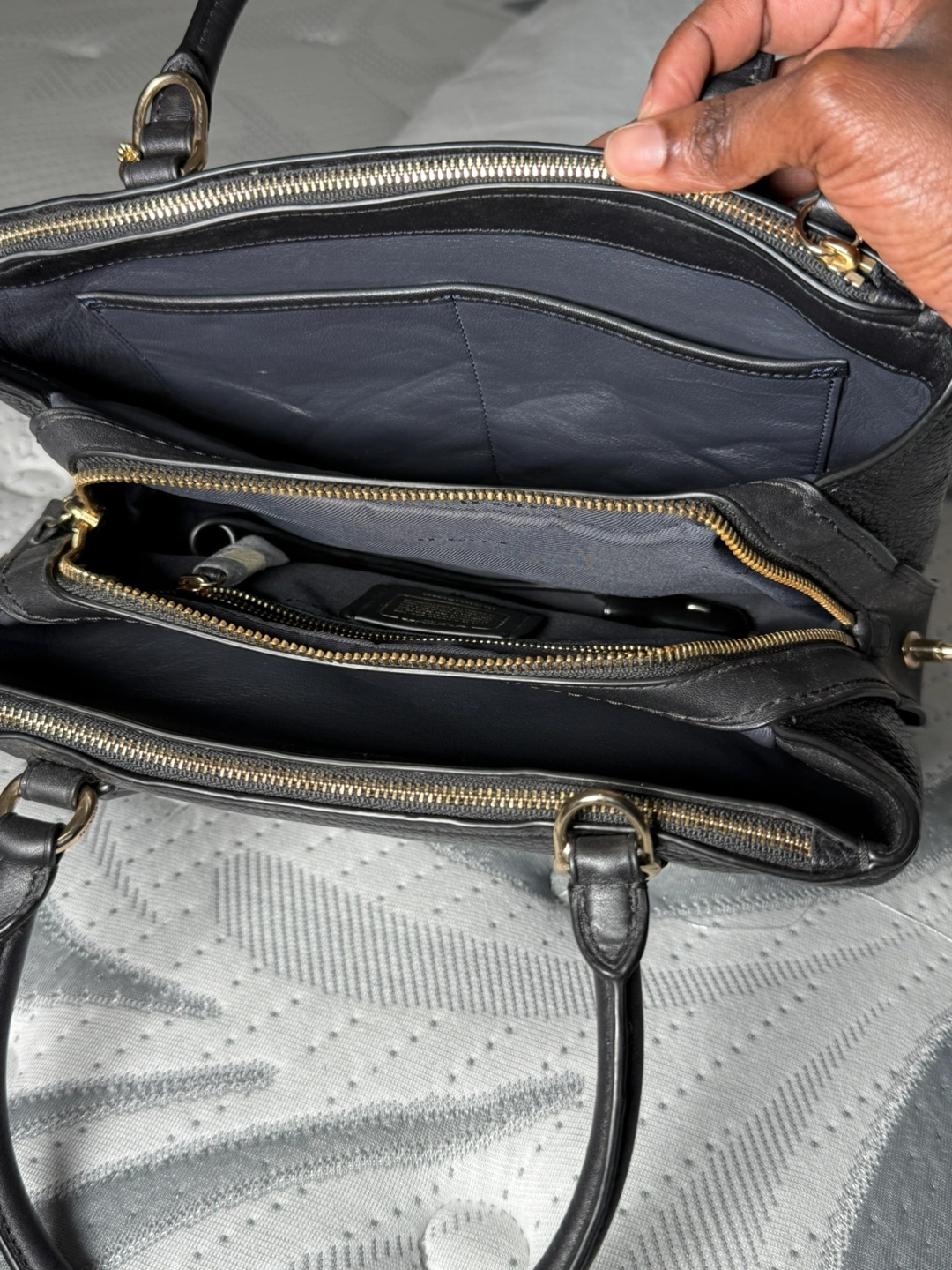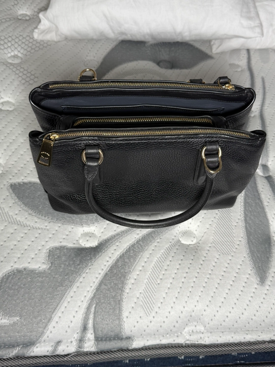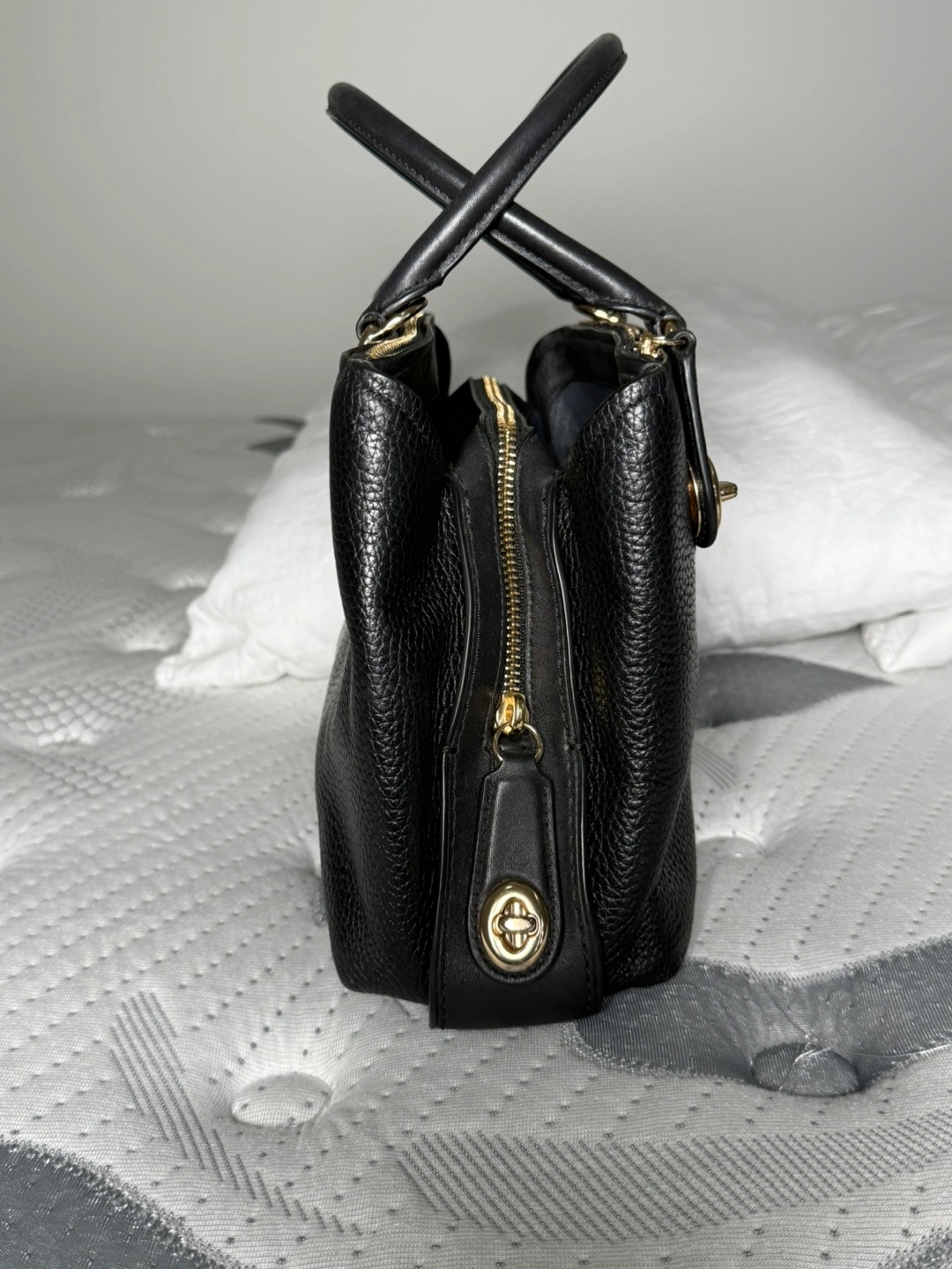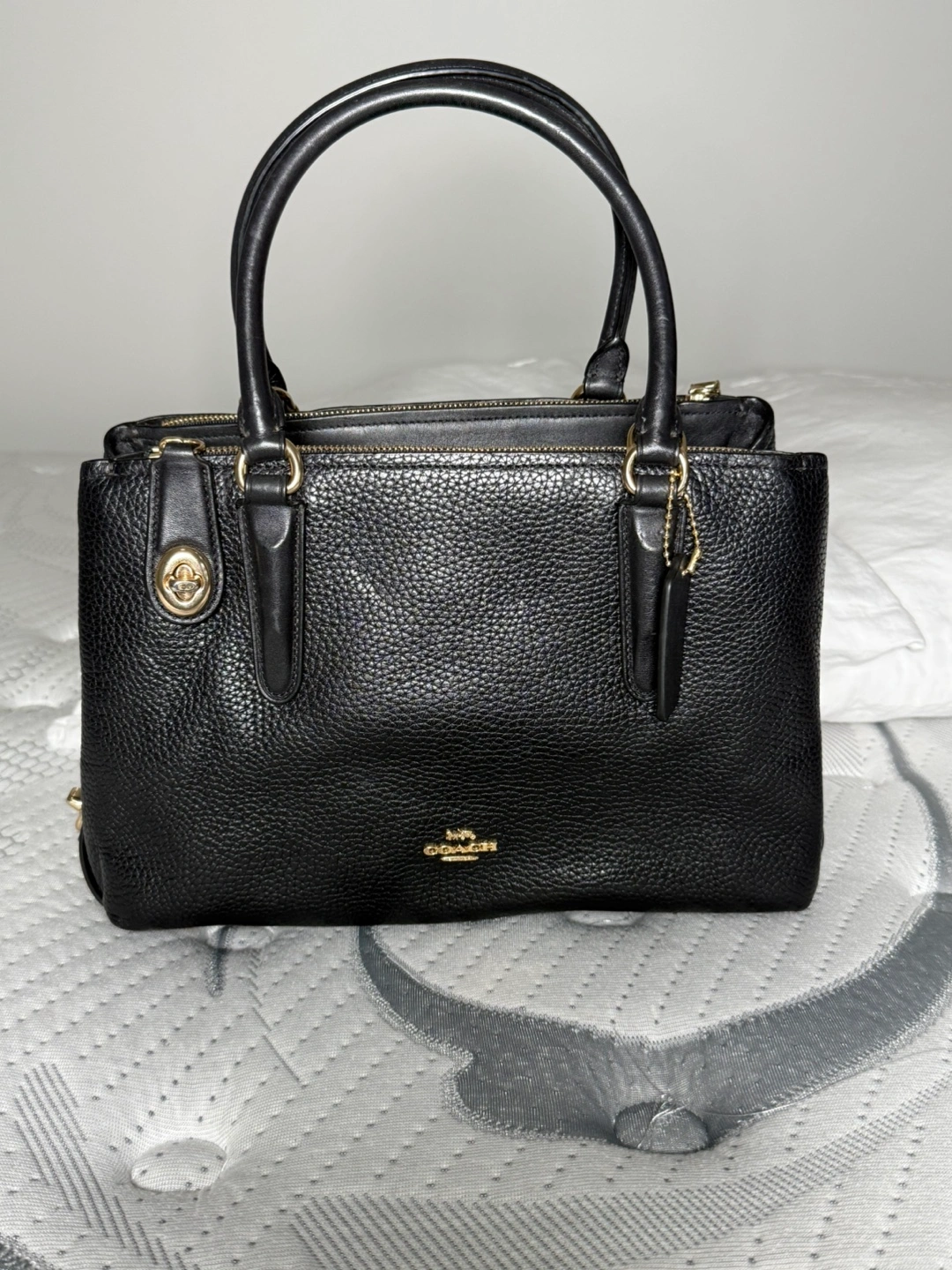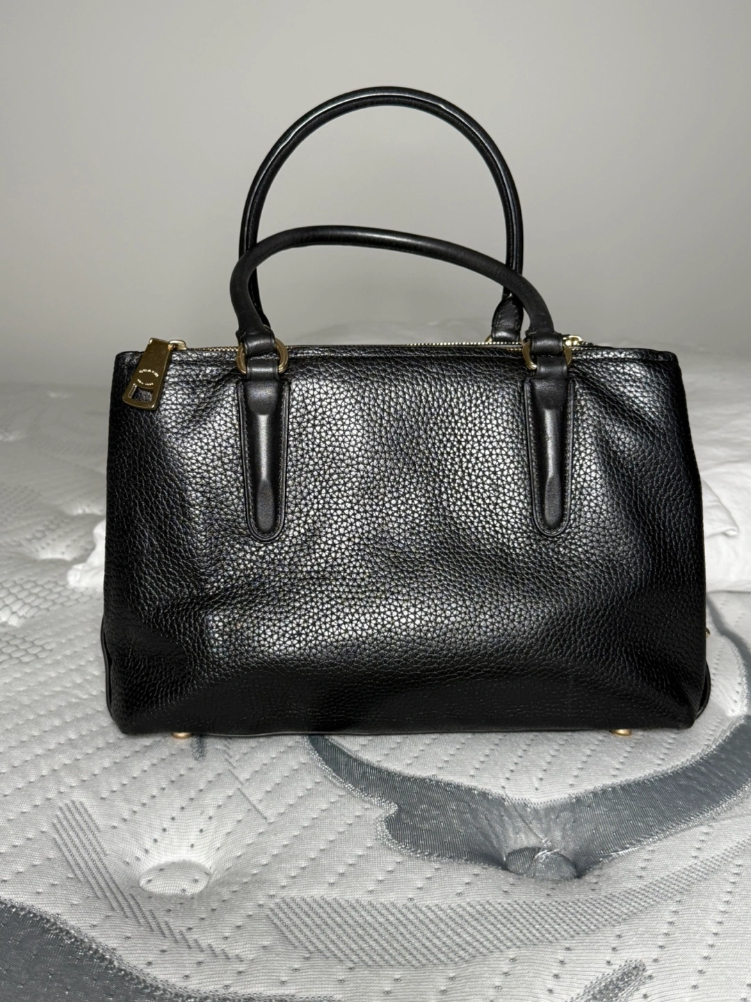 Selling a Coach black leather handbag. It's in great condition and perfect for everyday use! It has gold-tone hardware and a secure zip closure.