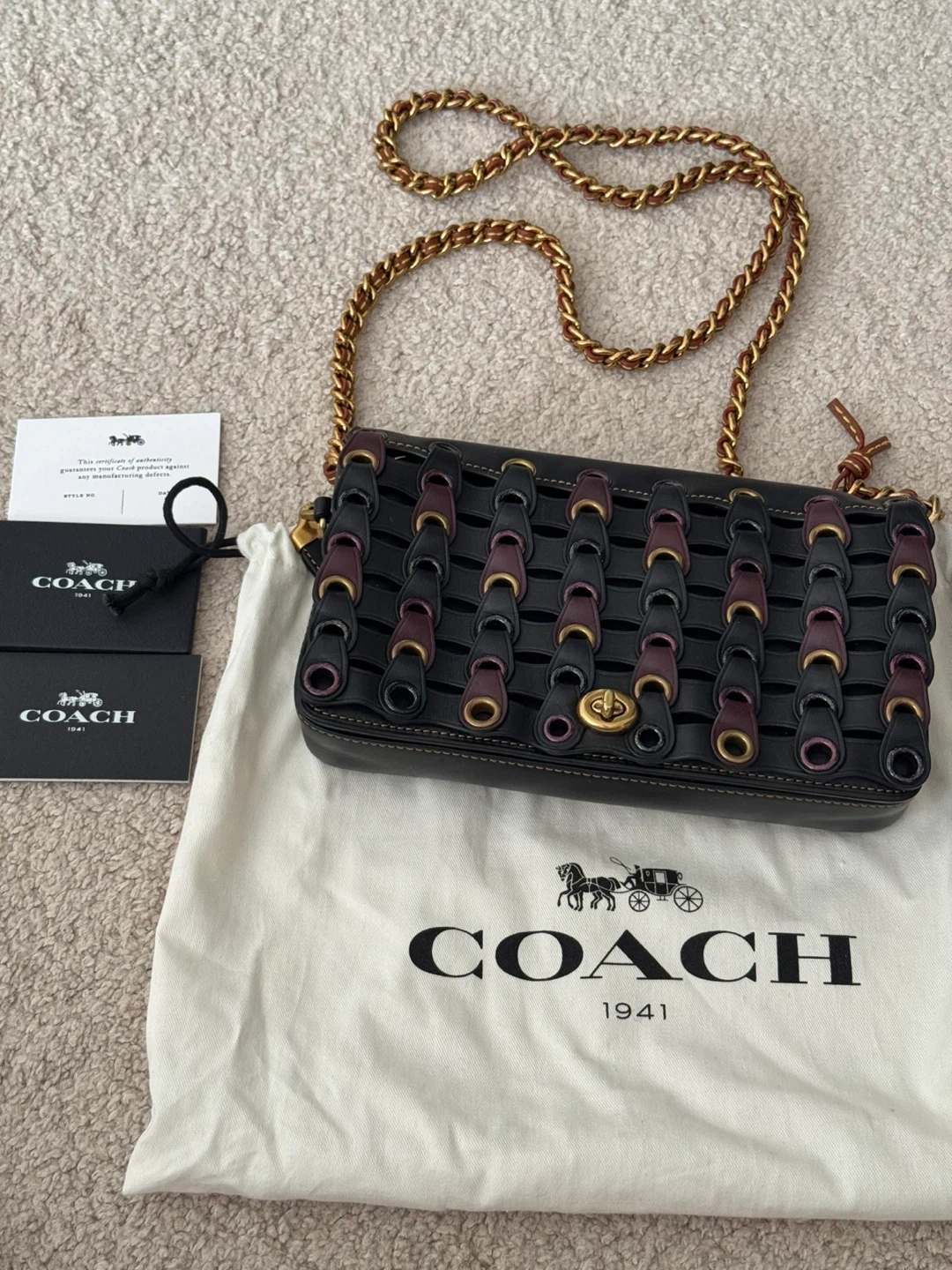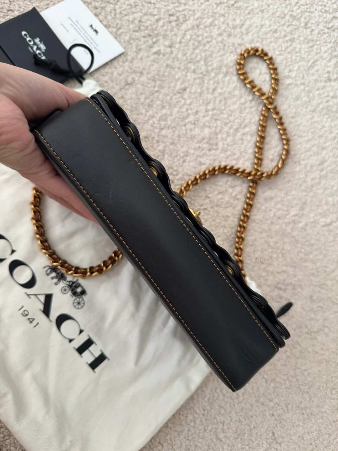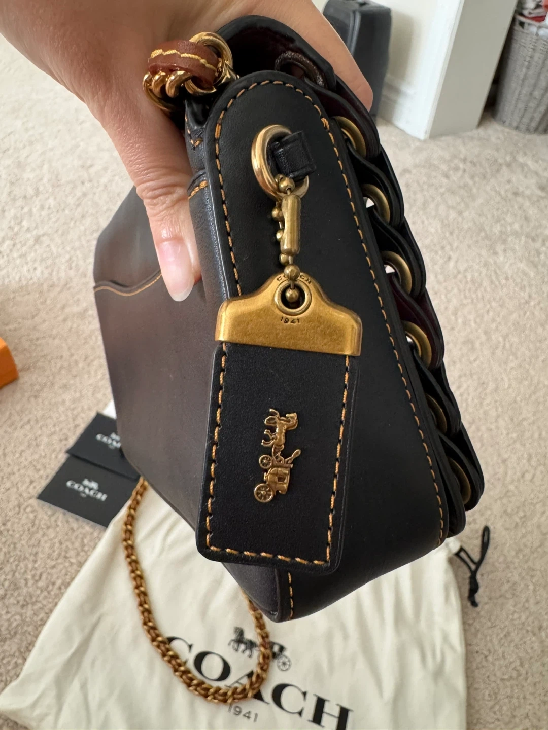 Selling a stylish Coach shoulder bag in black leather. It features a unique design with a gold-tone chain strap. Comes with the original dust bag and authenticity cards. Great for adding a touch of elegance to any outfit!