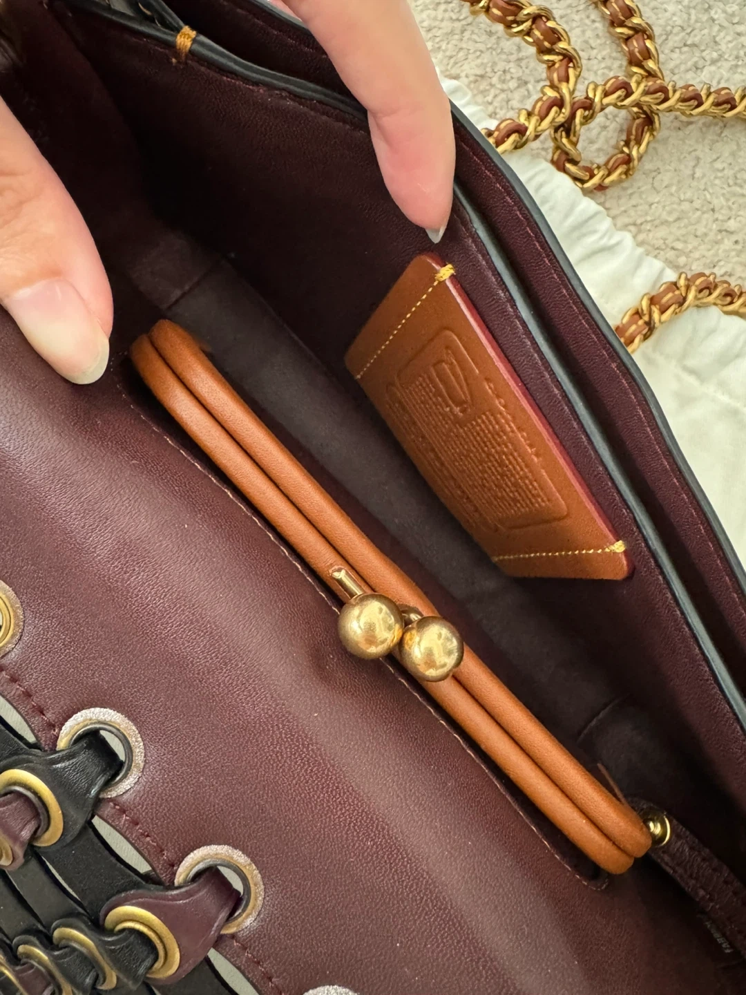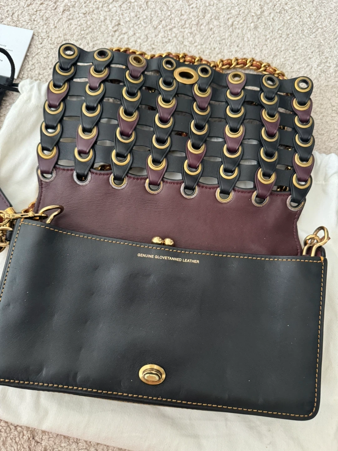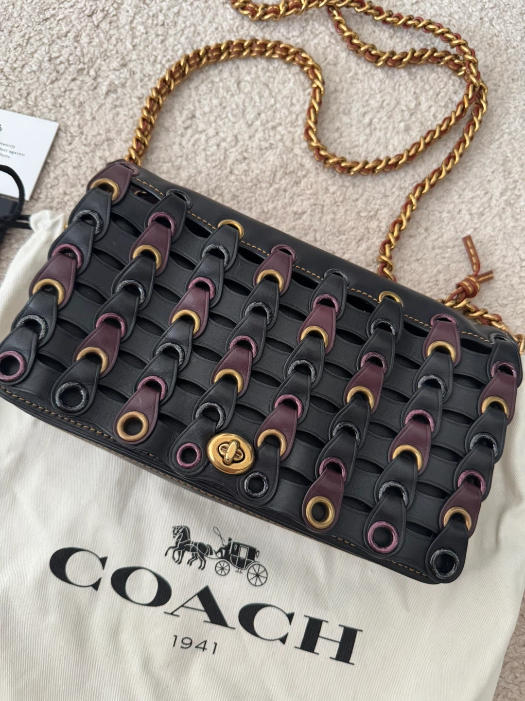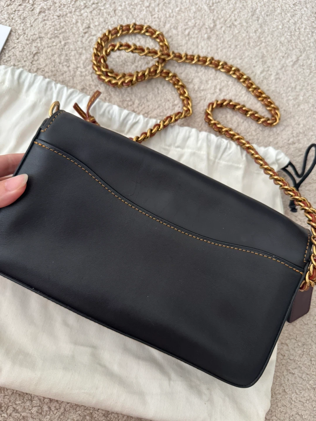 Selling a stylish Coach shoulder bag in black leather. It features a unique design with a gold-tone chain strap. Comes with the original dust bag and authenticity cards. Great for adding a touch of elegance to any outfit!