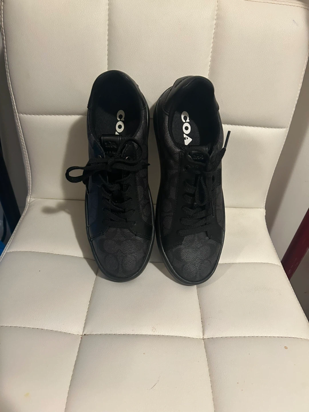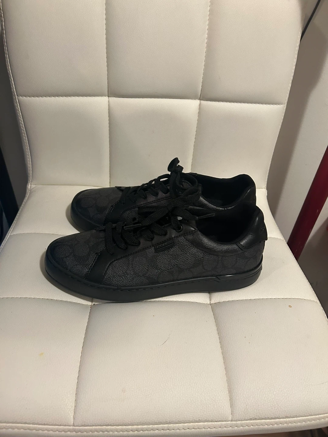 18Selling a pair of Coach sneakers in black. They feature the Coach logo pattern. The soles also have the Coach logo on them. Great for everyday wear!