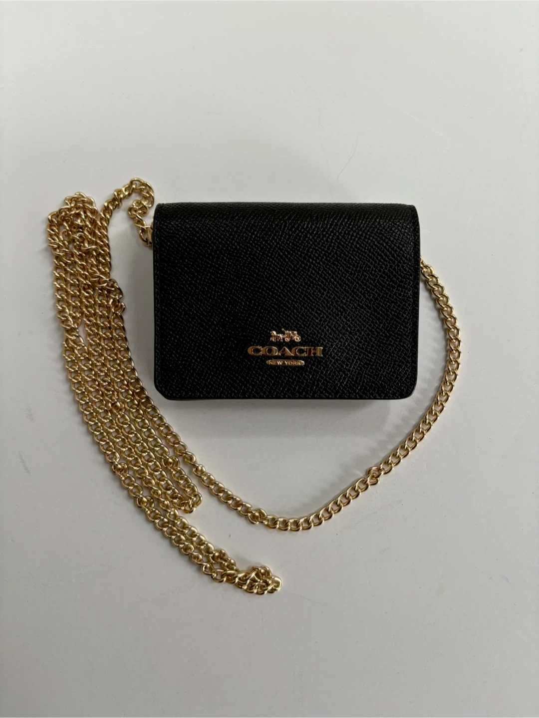 This Coach wallet is perfect for keeping your essentials close! It features a detachable chain strap, so you can wear it on your shoulder or crossbody. - Length: 4.0" - Height: 3.0" - Width: 1.0" - Outside open pocket - Two credit card slots - Snap closure **** No refund/ No exchange*** *** no holds FCFS ***