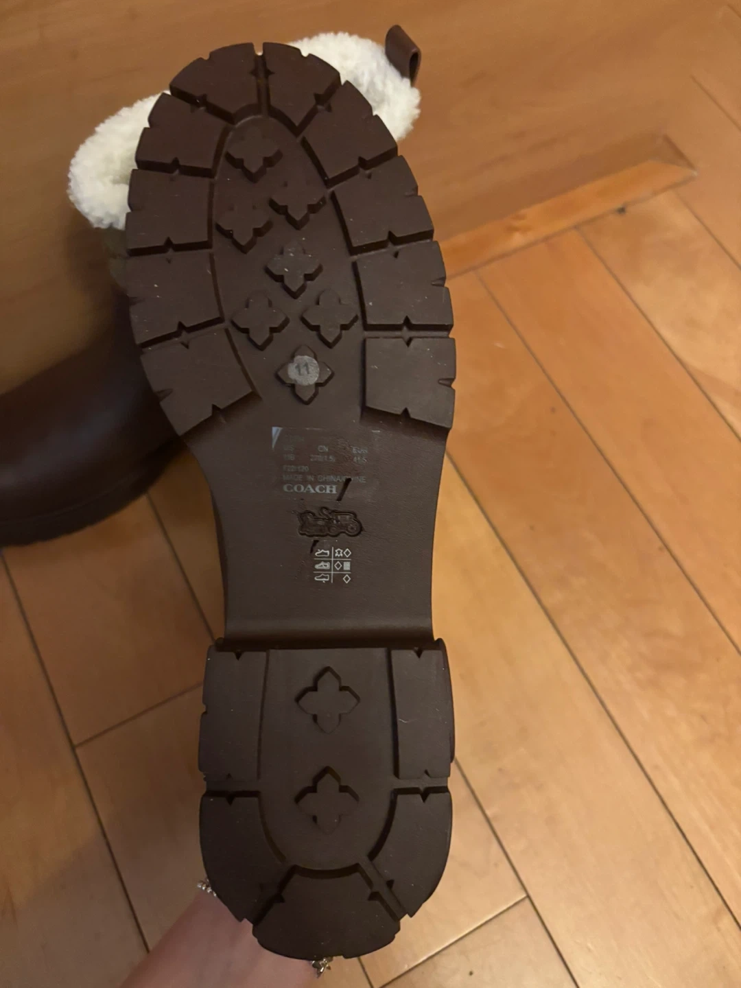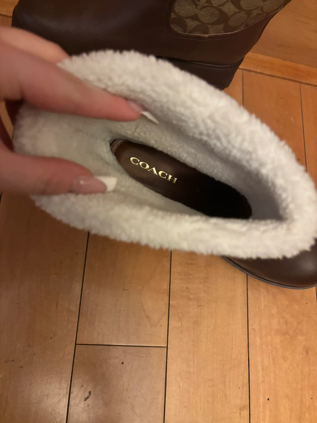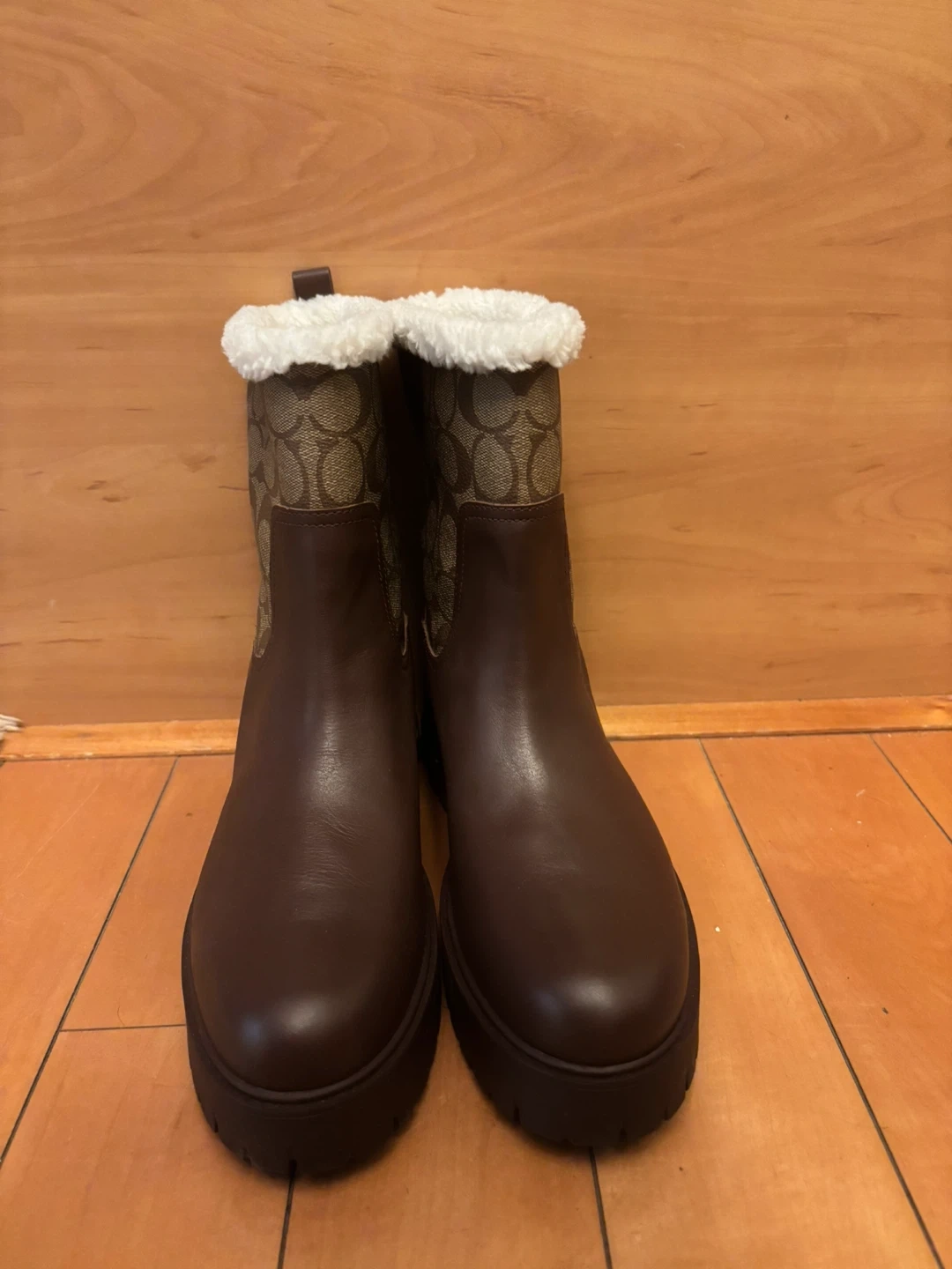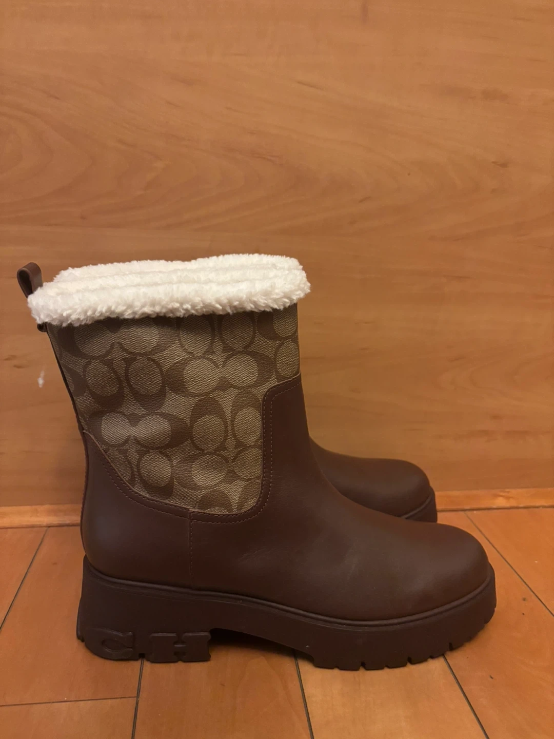 20These New Coach boots are super stylish and comfy! They're a rich brown leather with a cool Coach pattern on the sides and cozy faux fur trim. Size 11 women.
