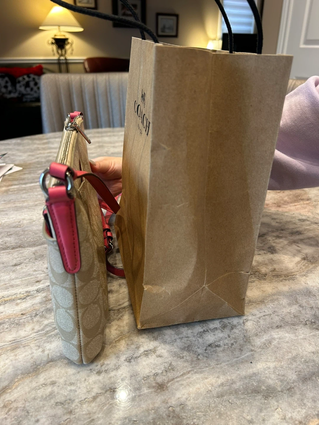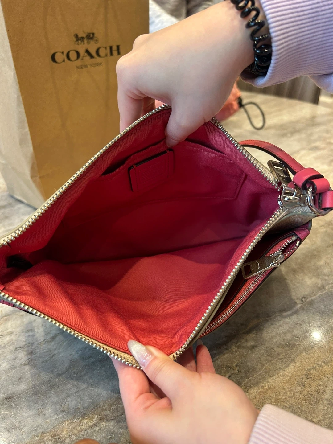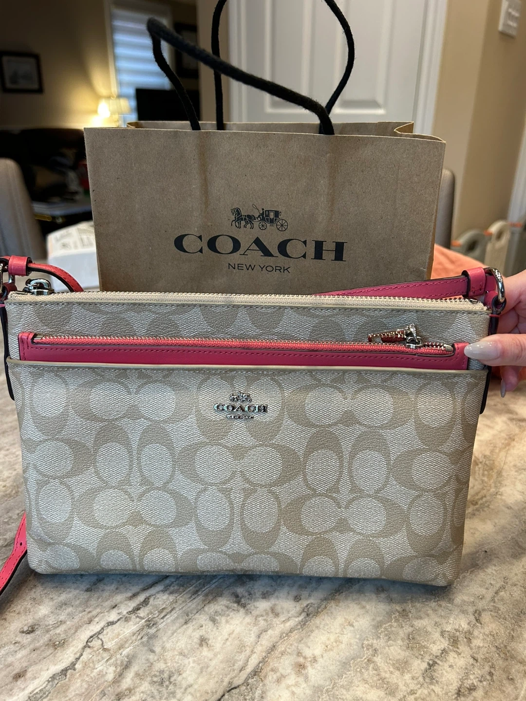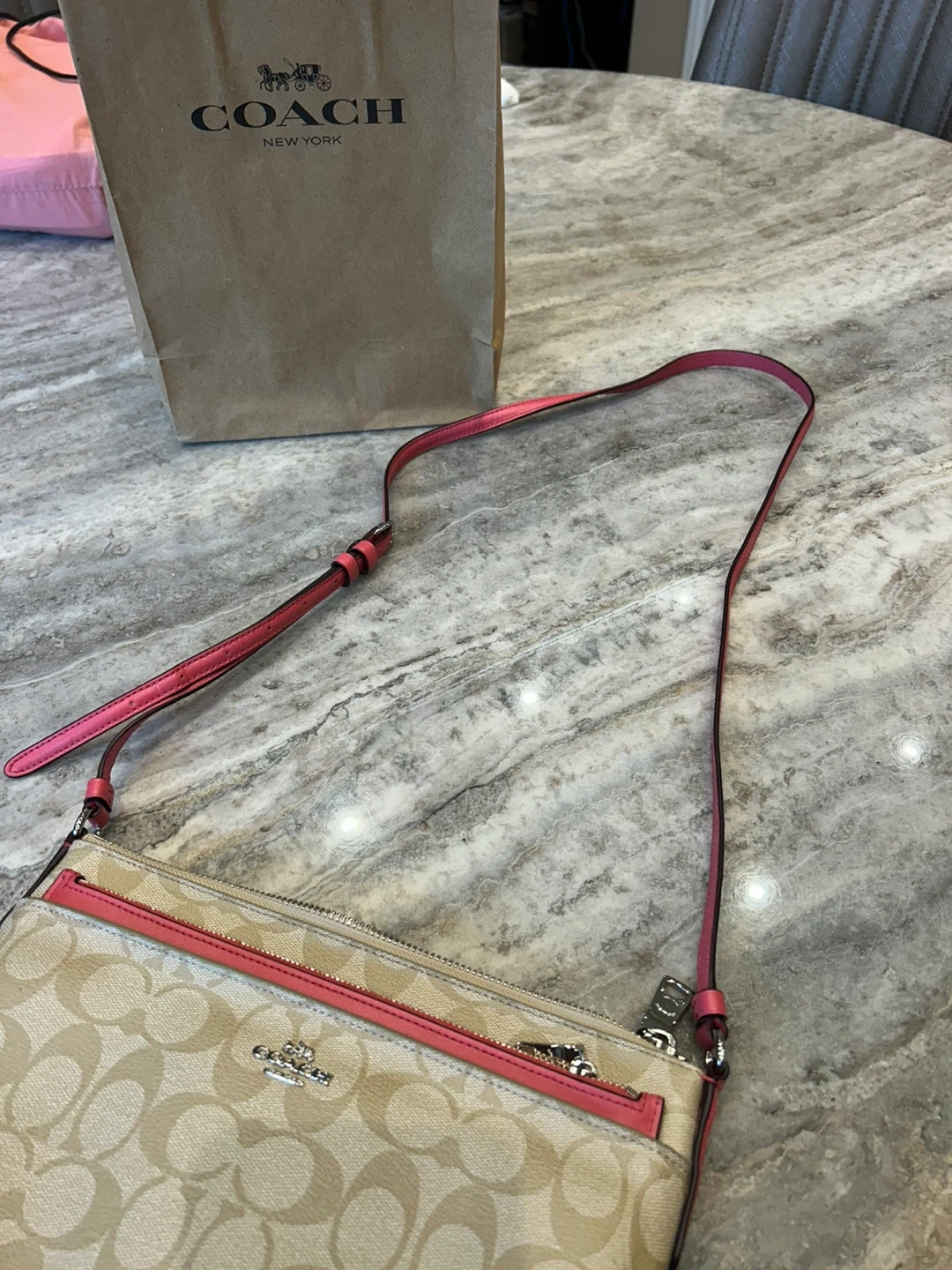 60Selling a Coach crossbody bag in a cute beige and pink colour combination! It comes with its original Coach paper bag. It's in great condition and ready for a new home!