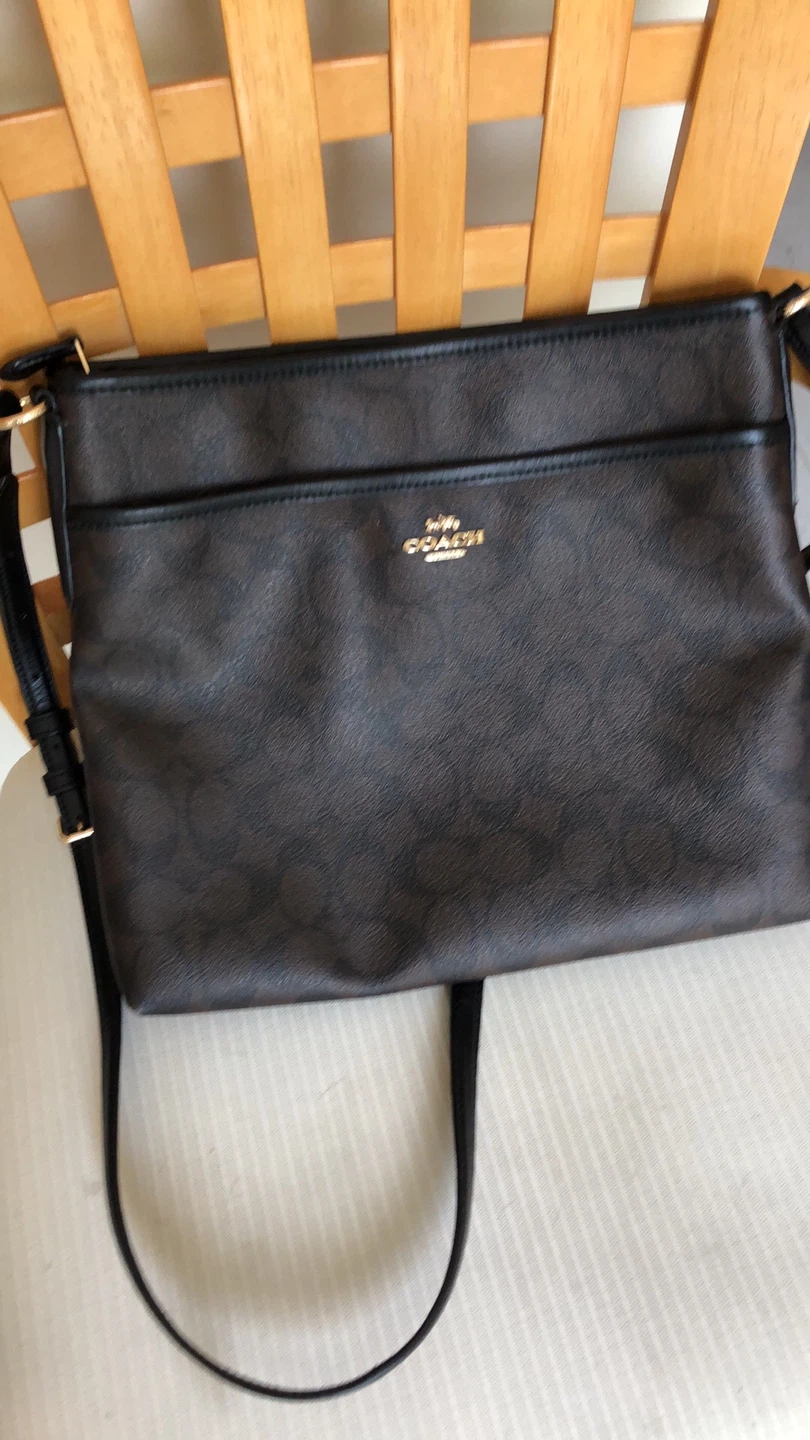 10Selling a Coach crossbody bag in good condition. It features a brown and black signature design with a gold Coach logo. Perfect for everyday use!