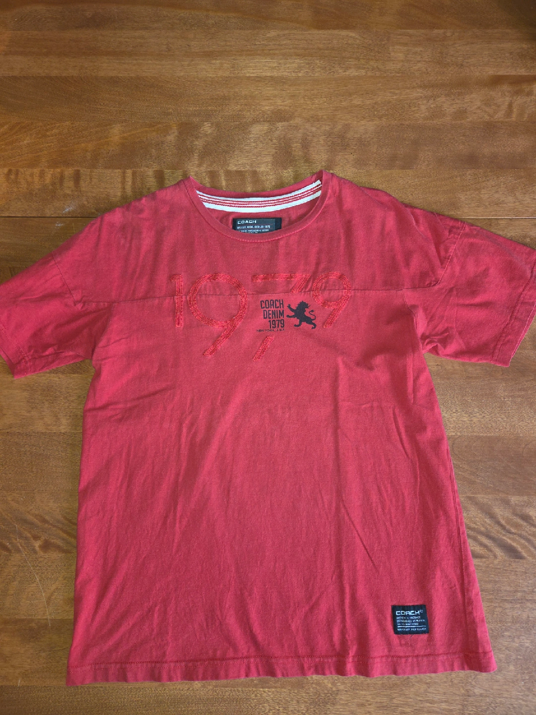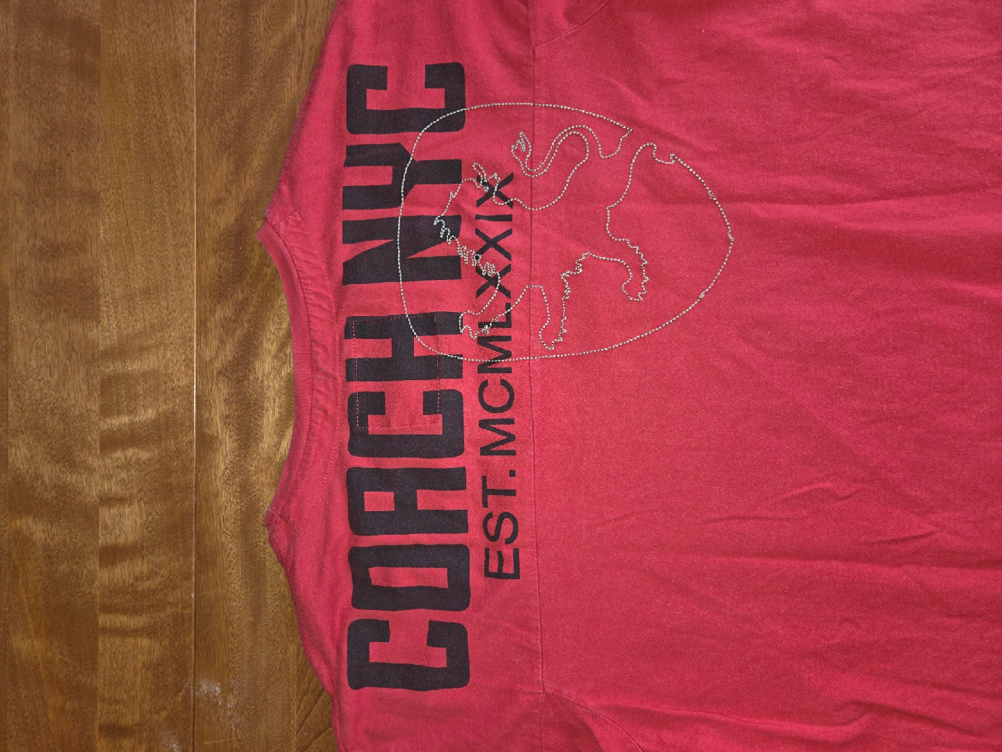 10Selling a red Coach Denim 1979 T-shirt. It features the Coach NYC logo on the back and a lion graphic on the front. The shirt is in good condition and ready for a new home