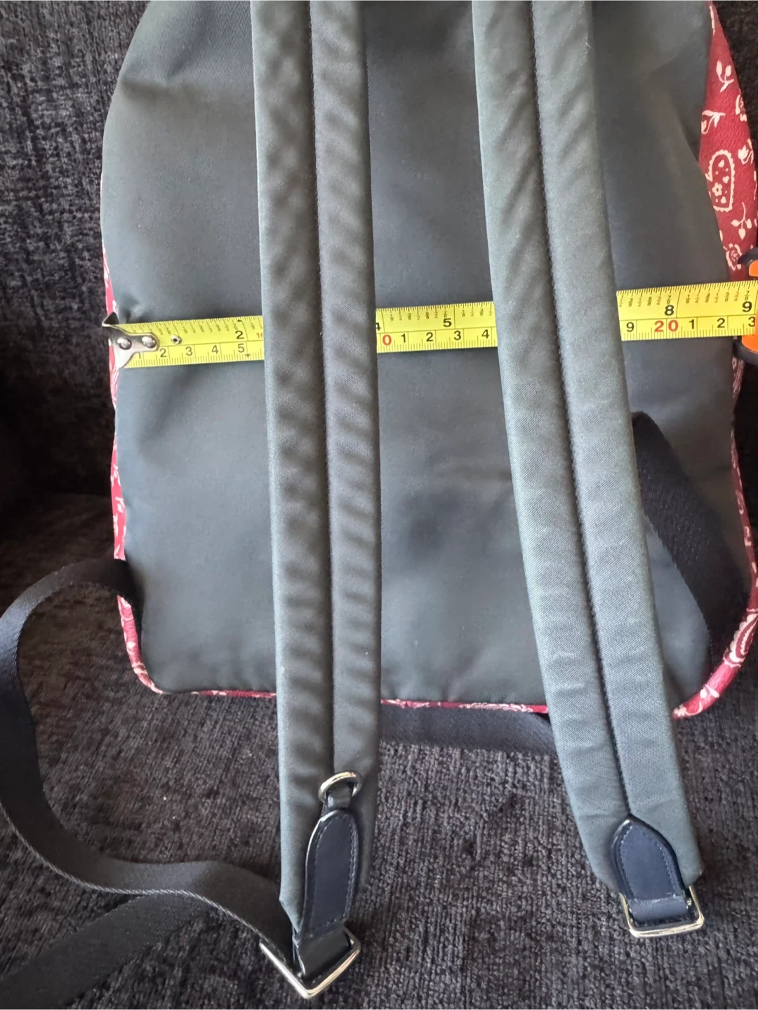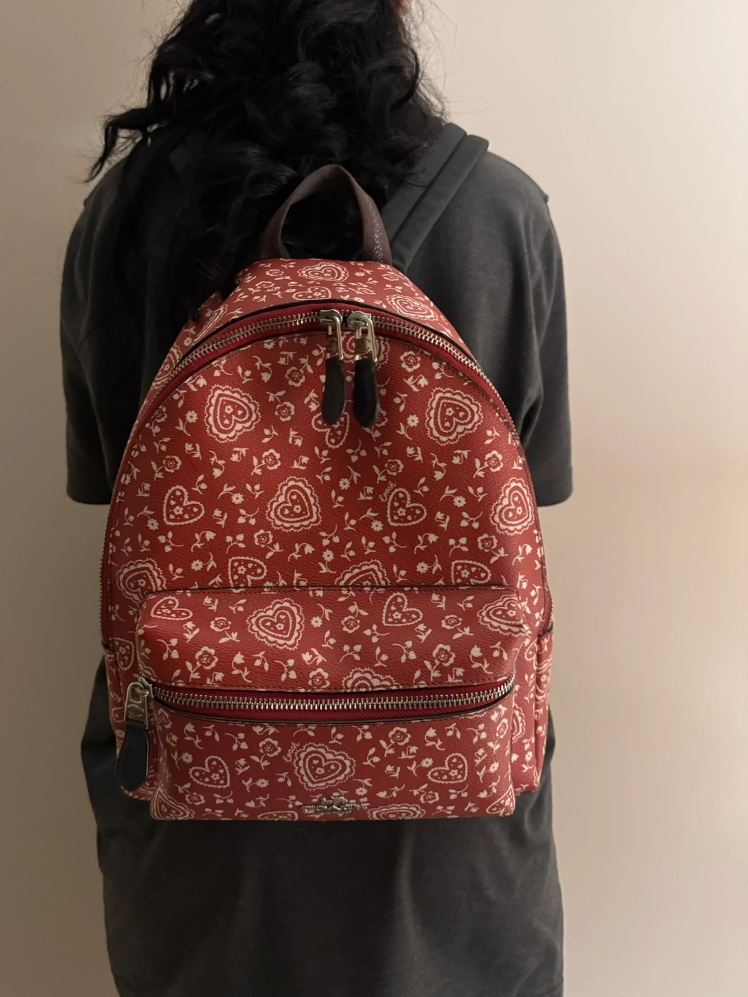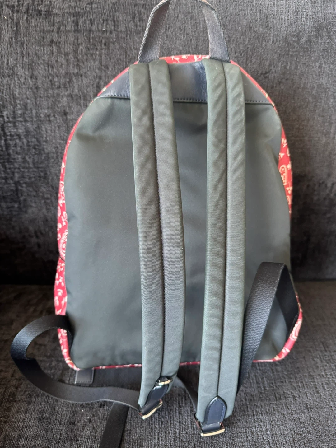 This Coach backpack features a cute floral and heart print on a red background. Mint condition