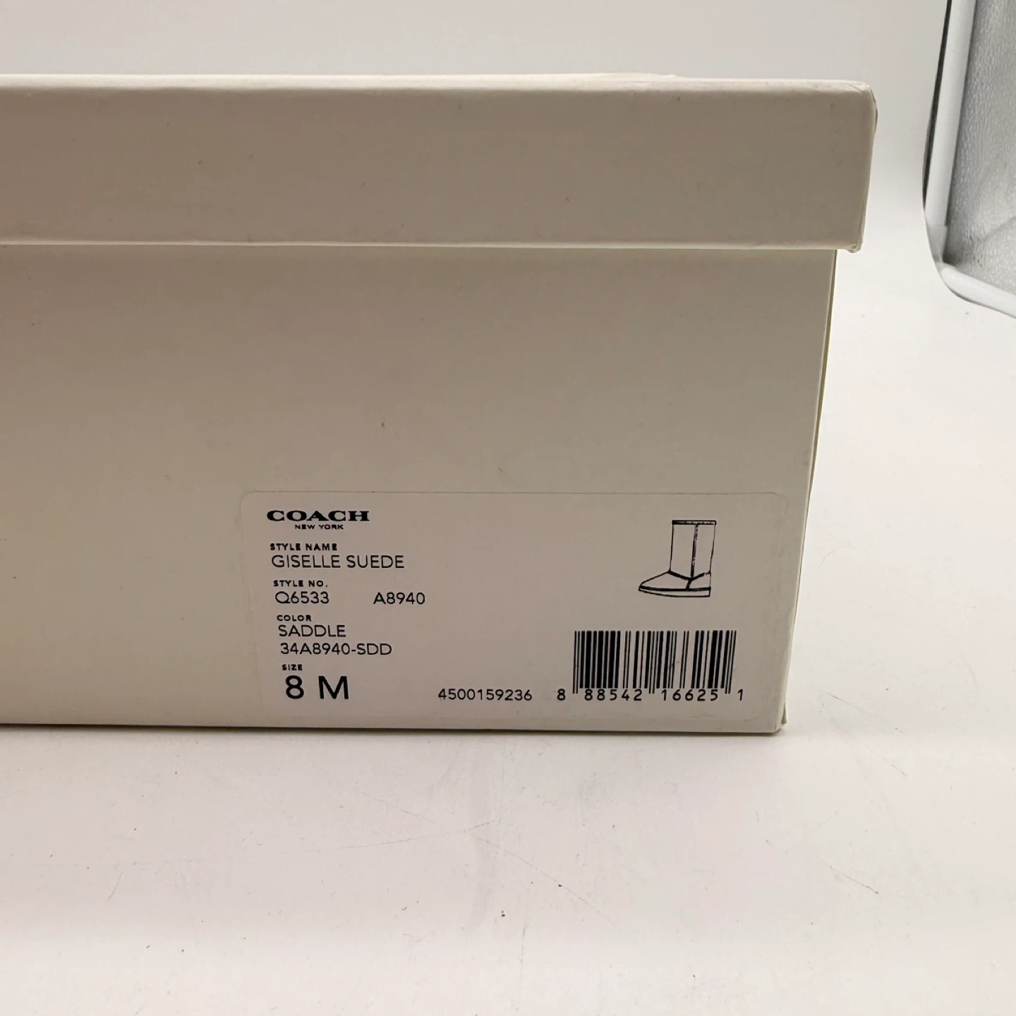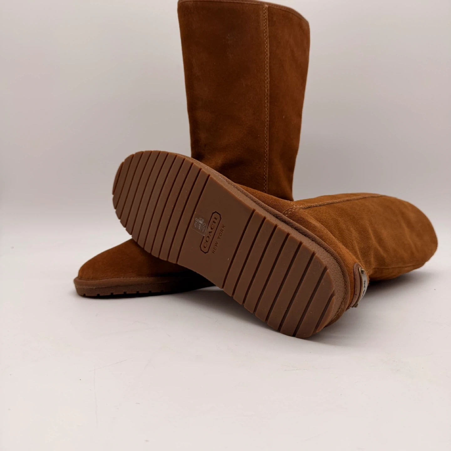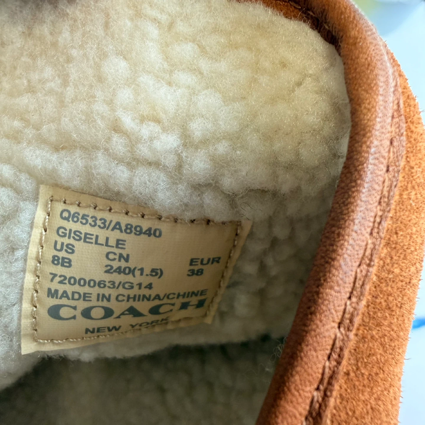 Brand new Coach Giselle Suede Boots rich saddle brown. ✅ 100% authentic Coach ✅ Genuine suede upper with cozy shearling-style lining ✅ Comfortable flat sole with “Coach New York” embossed tread ✅ Approx. 11” shaft height Condition: Brand new in original box (box has some shelf wear) Size: US 8B / EUR 38 Pickup North York— delivery available for extra fee. 29 up