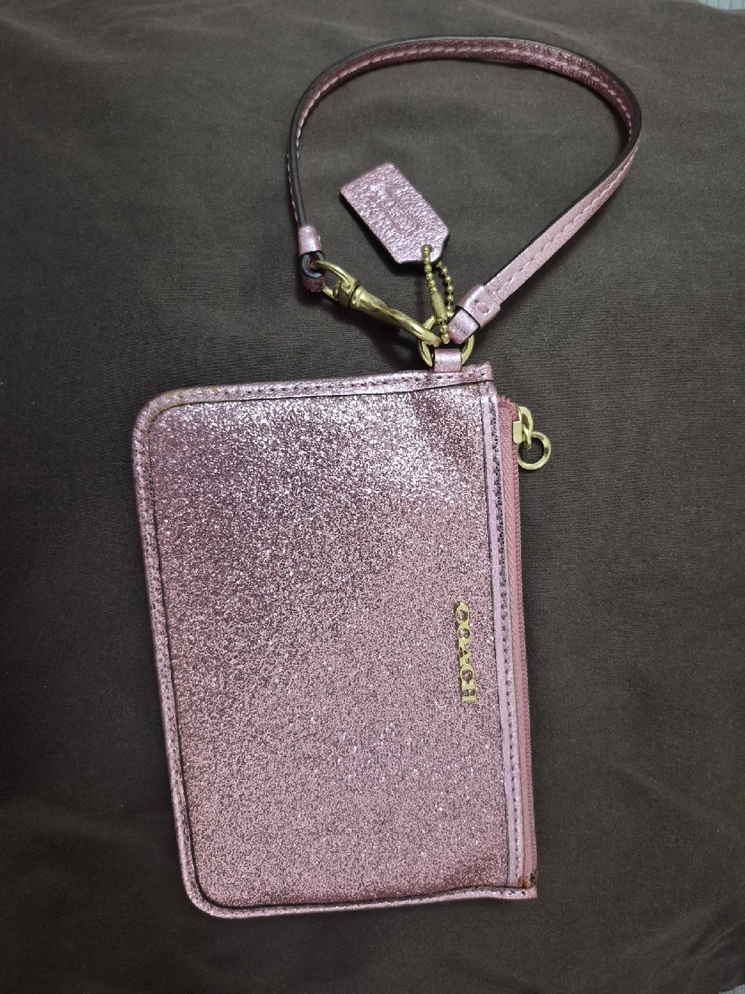 Selling a cute Coach wristlet card holder! It's a shimmery, glittery pink colour, perfect for adding a bit of sparkle to your day. It's in great condition and ready for a new home