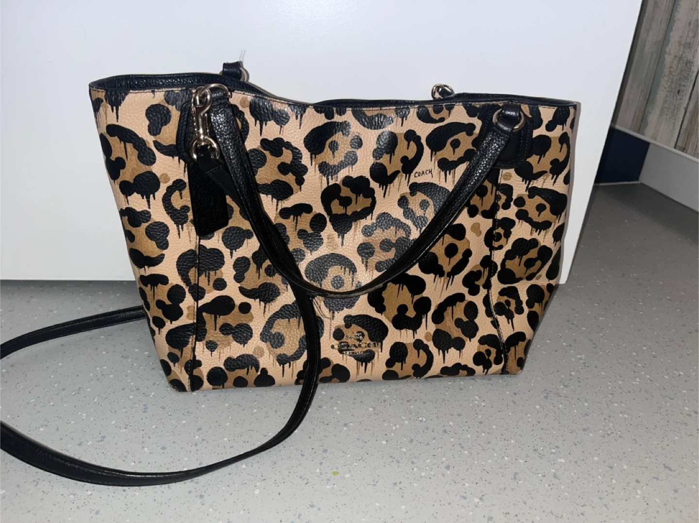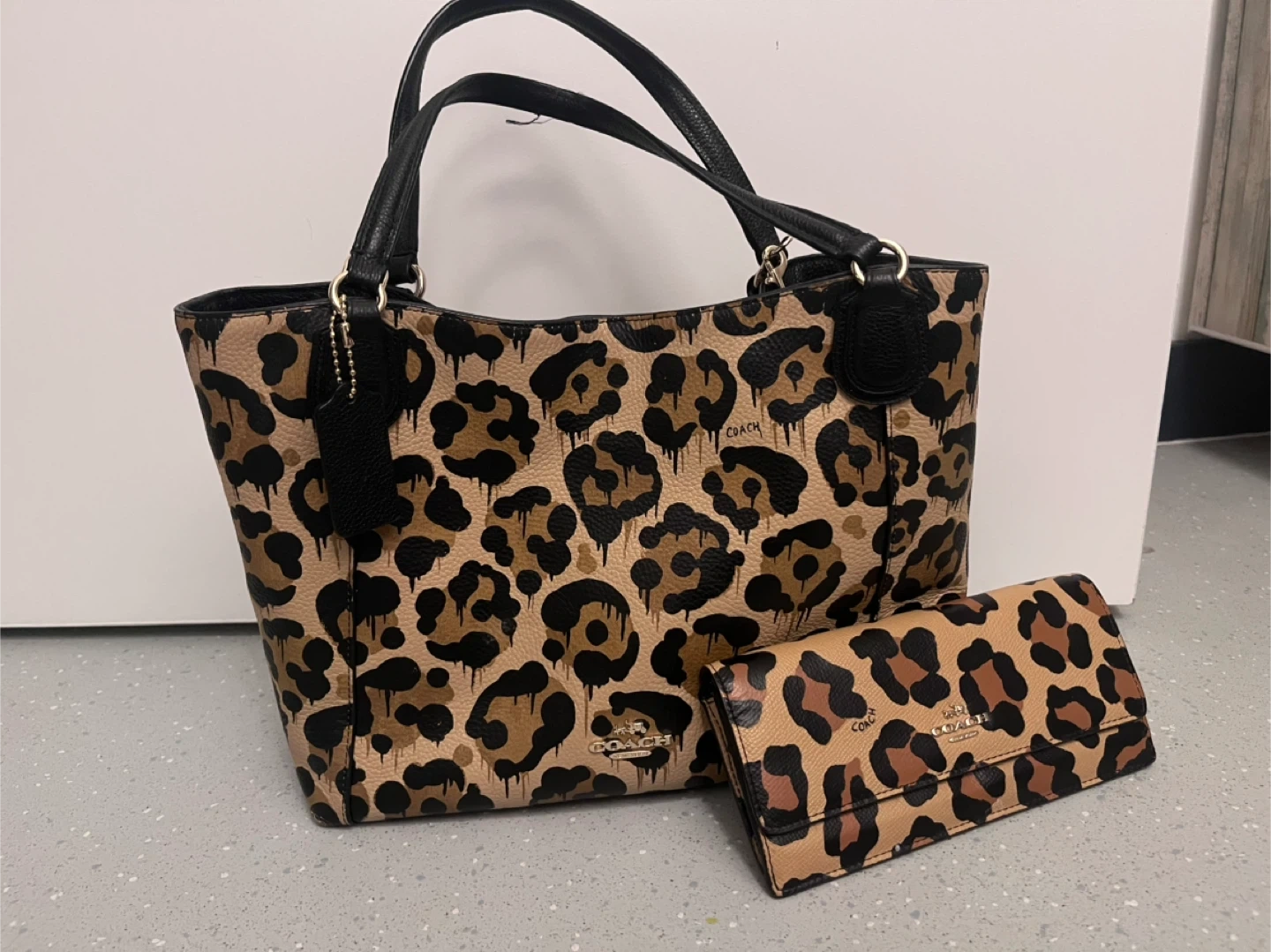 64Coach tote bag and matching wallet (Wild Beast Collection) with a graffiti leopard print. The tote has black leather handles and trim with a detachable shoulder strap and the wallet is a slim tri fold design. Both are in great condition!