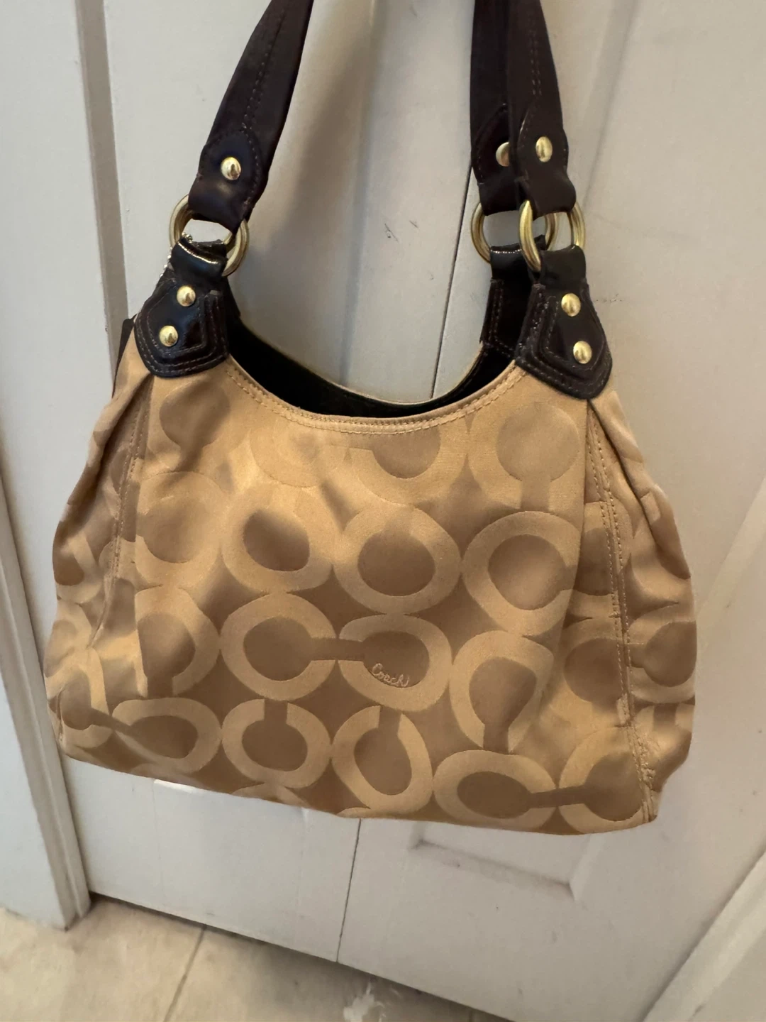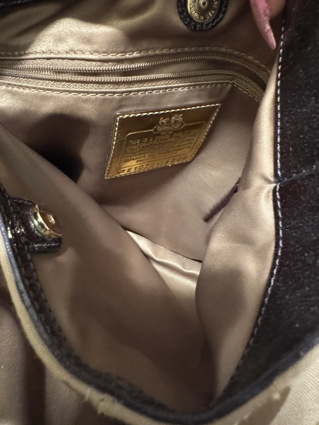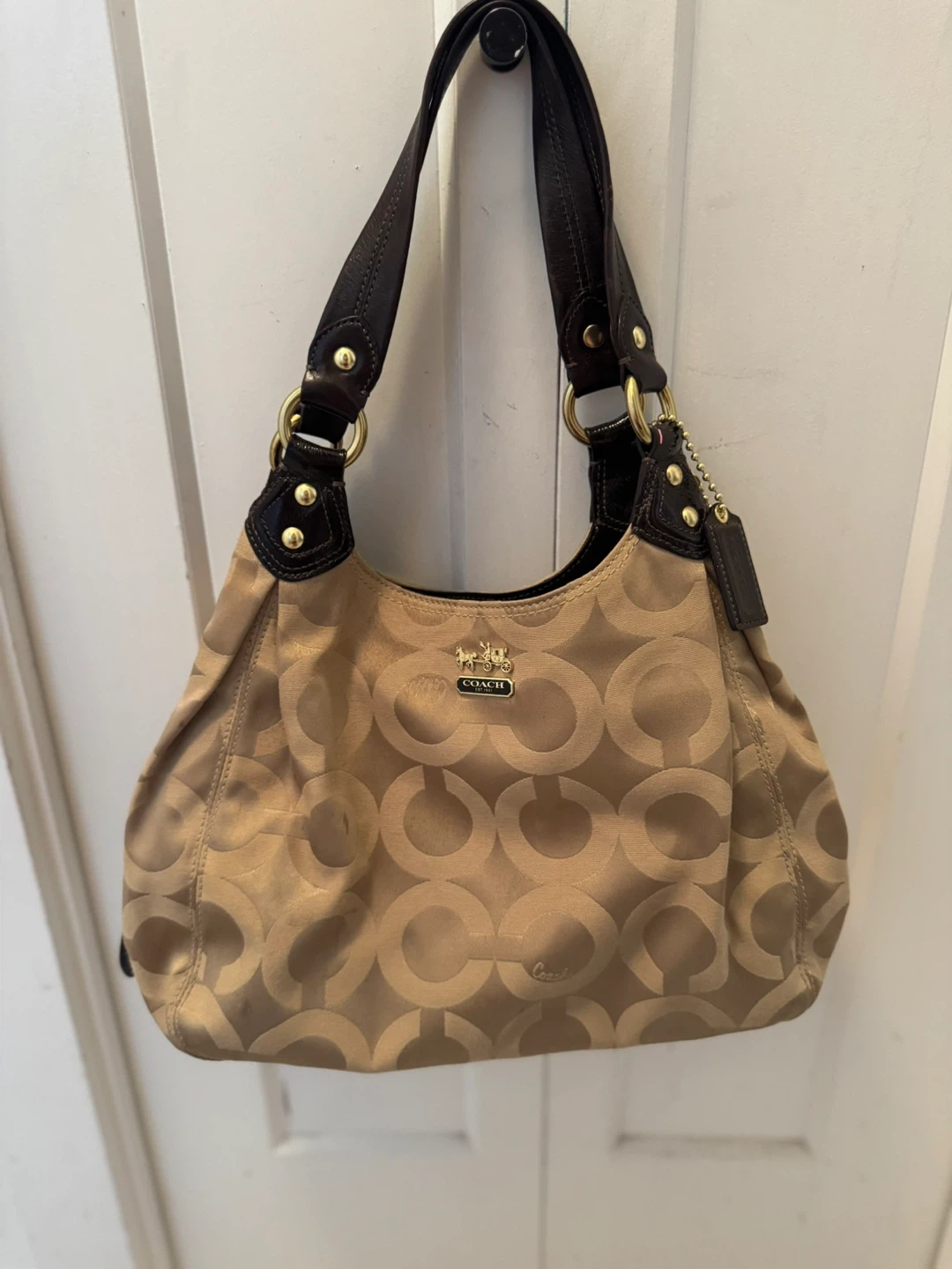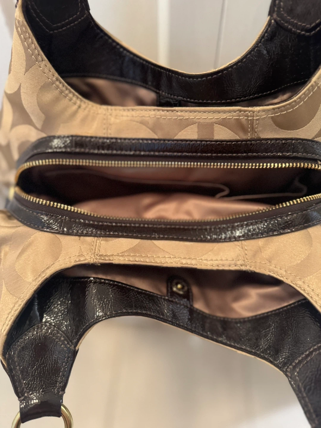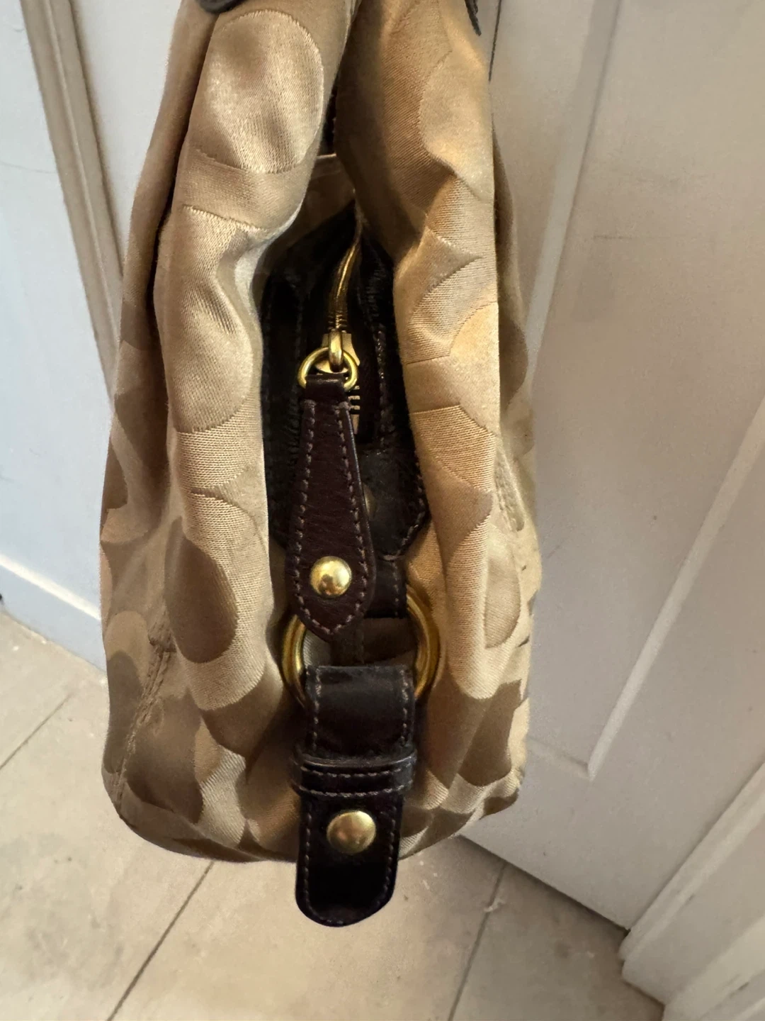 Selling a Coach hobo bag in a lovely beige and brown colour combination. It's in great shape and ready for a new home! The bag features the classic Coach logo pattern and has a zip top closure. The interior is spacious and perfect for carrying your everyday essentials