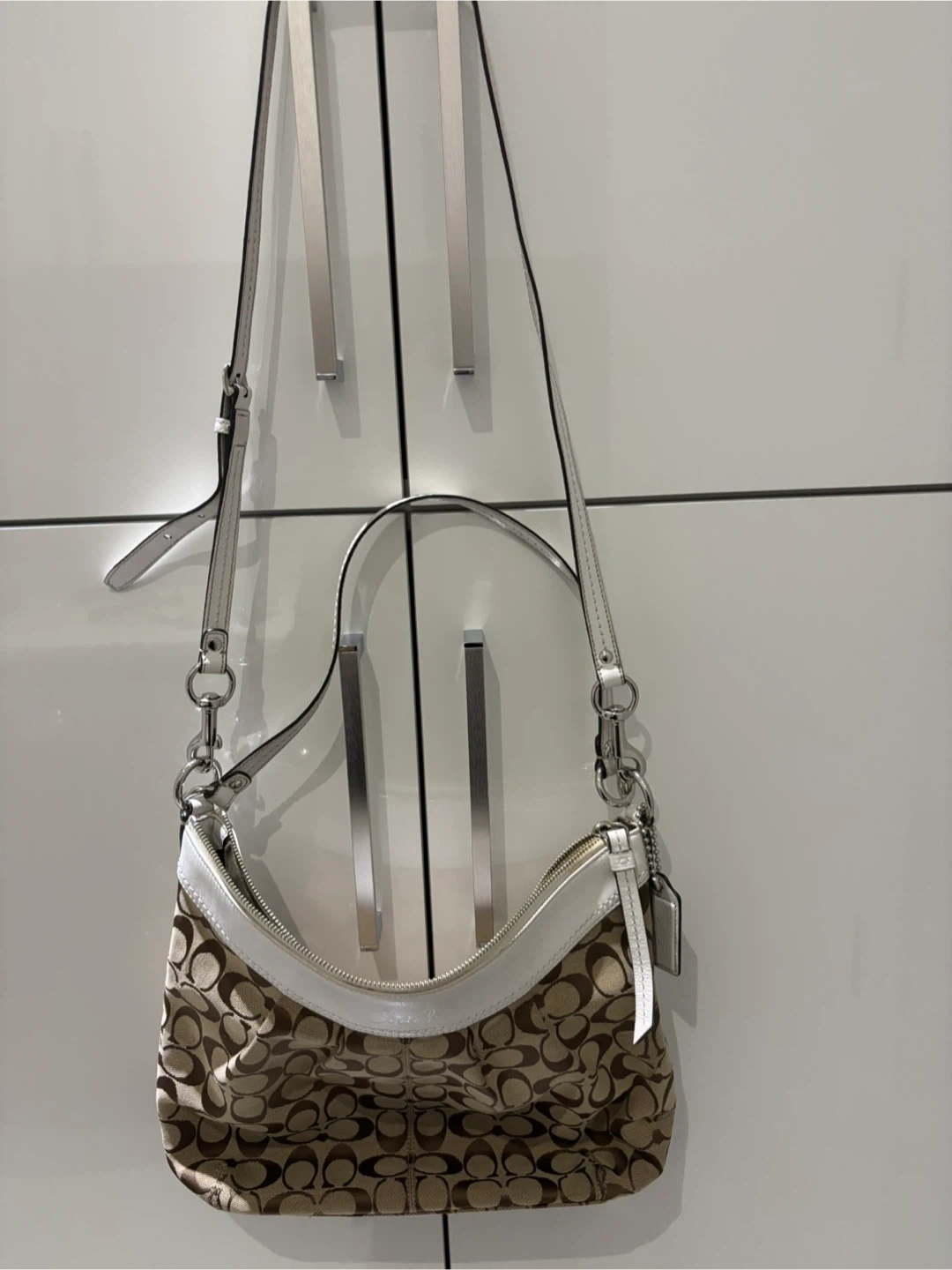 Coach hobo bag with the classic Coach pattern. It has a white long strap so can wear as a crossbody and shoulder strap as well. Very spacious. Perfect for everyday use!
