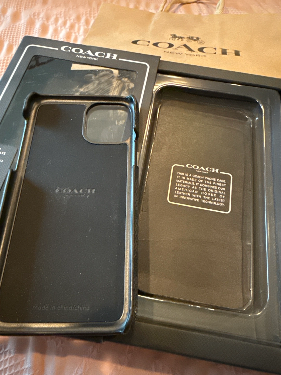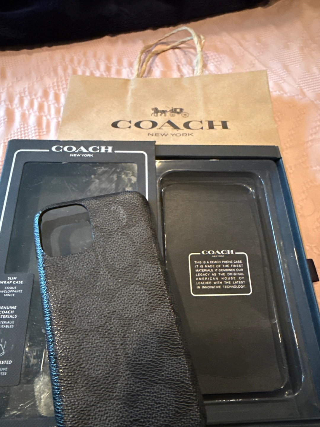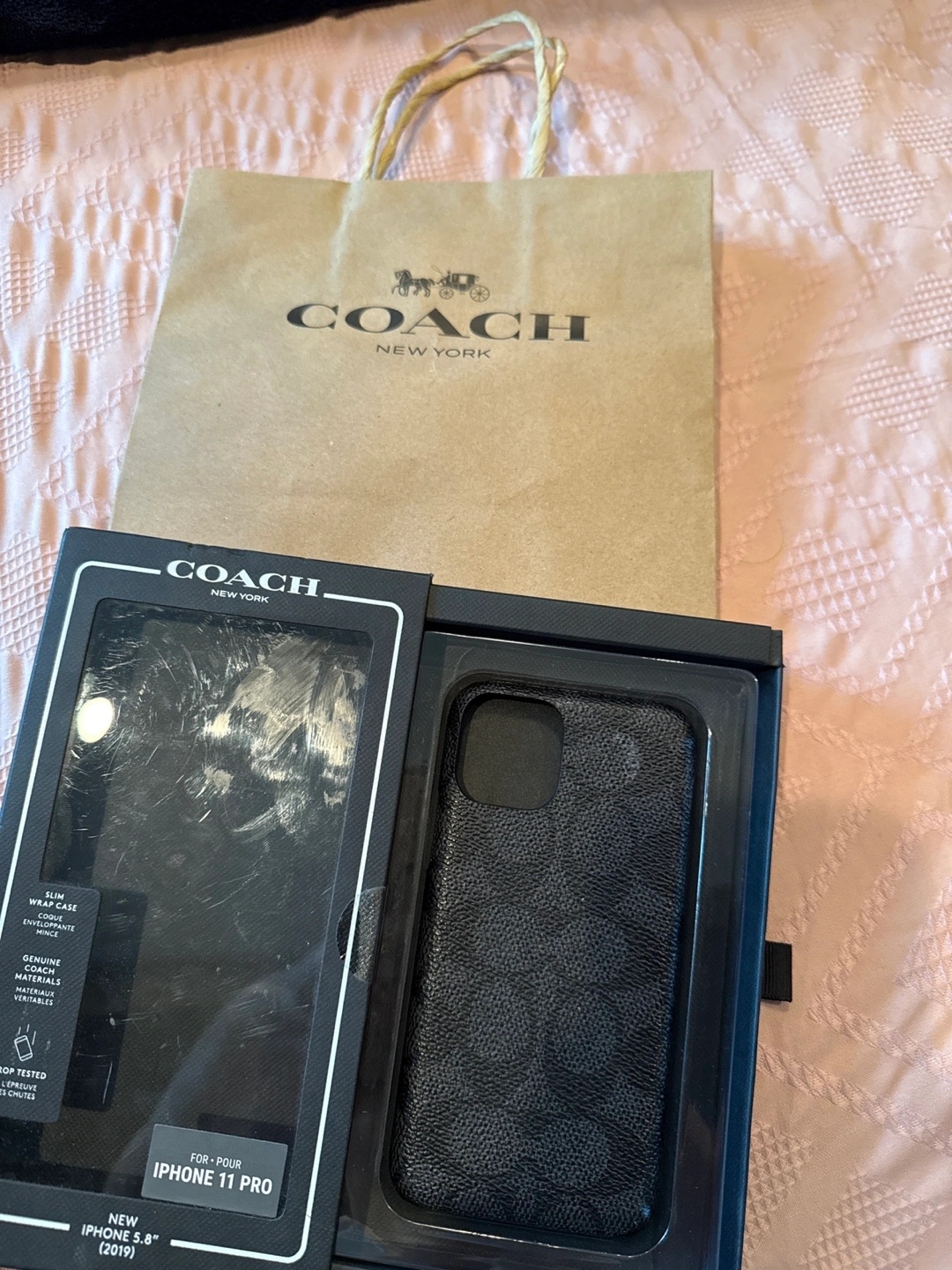 Selling a like-new Coach iPhone 11 Pro case! It comes with the original box and packaging. This slim wear case is made with genuine leather materials and is drop tested for extra protection. If you're looking for a stylish and protective case, this is a great option!