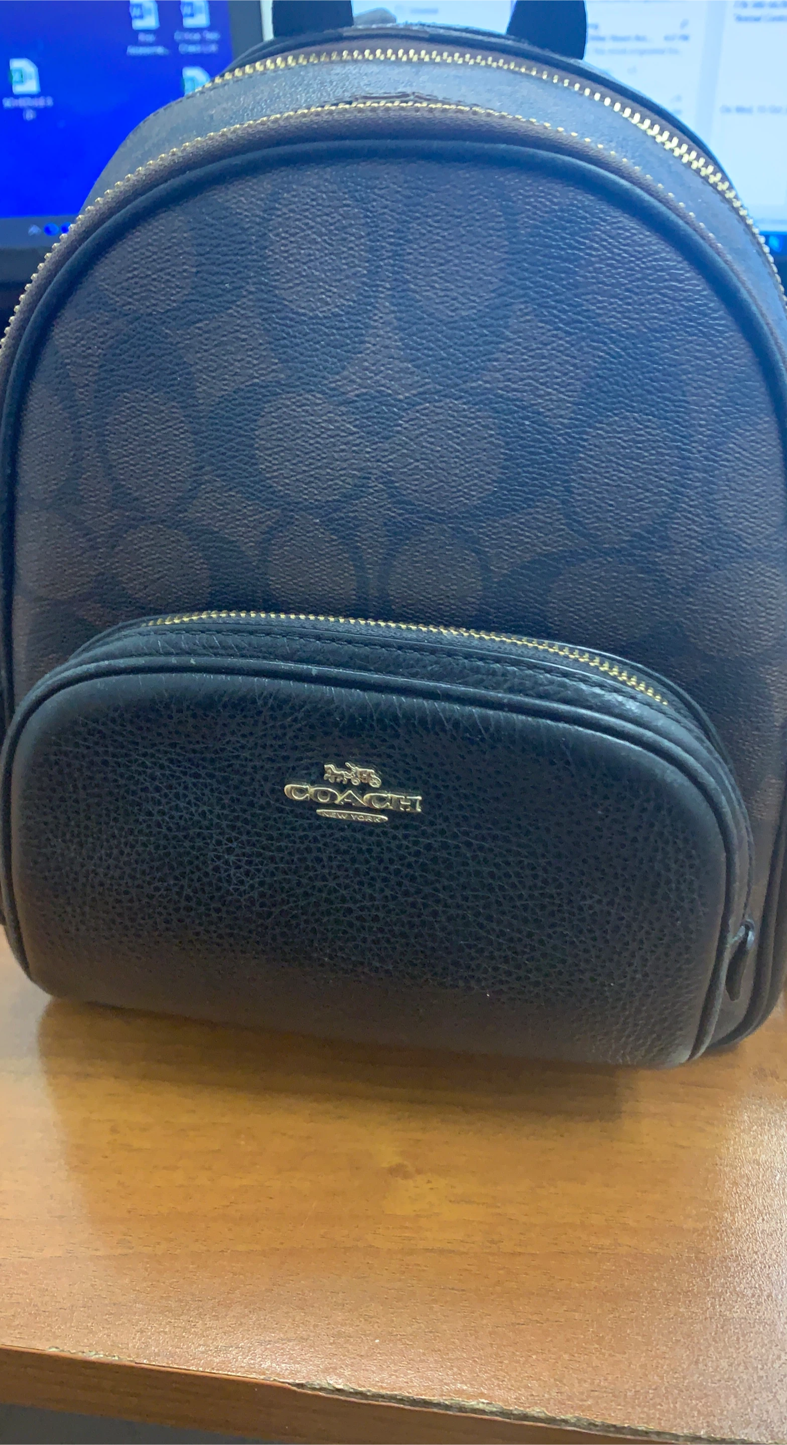 38Selling a cute Coach mini backpack! It's in great condition and perfect for carrying your essentials. The backpack features the Coach logo pattern in brown and black, with gold zippers adding a touch of elegance. It's a stylish and practical accessory for everyday use