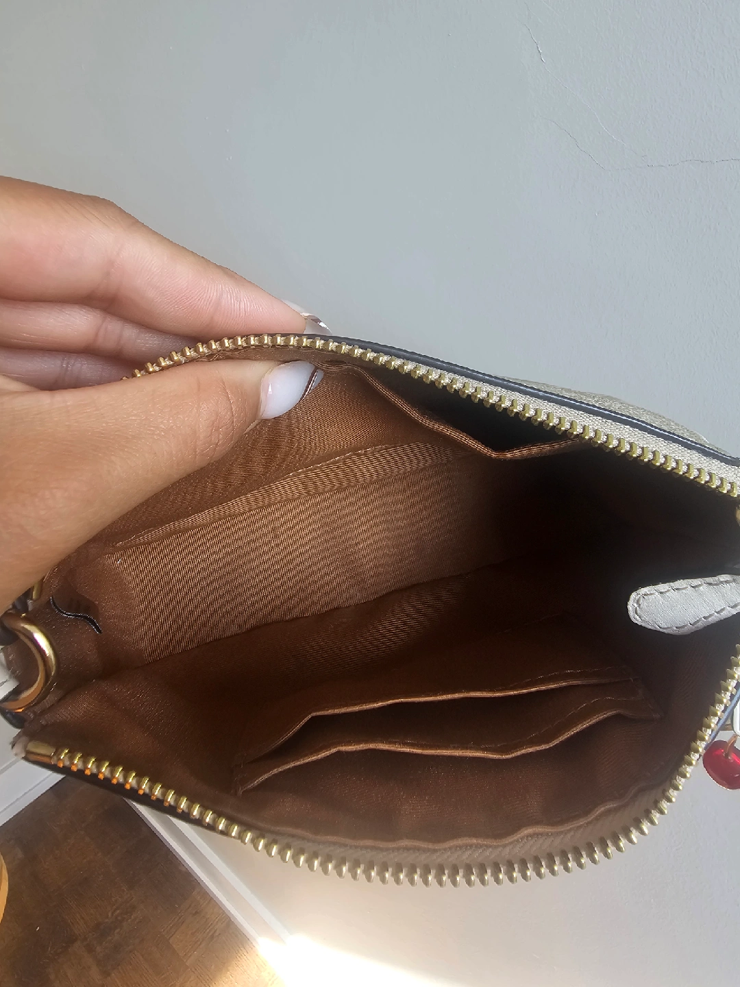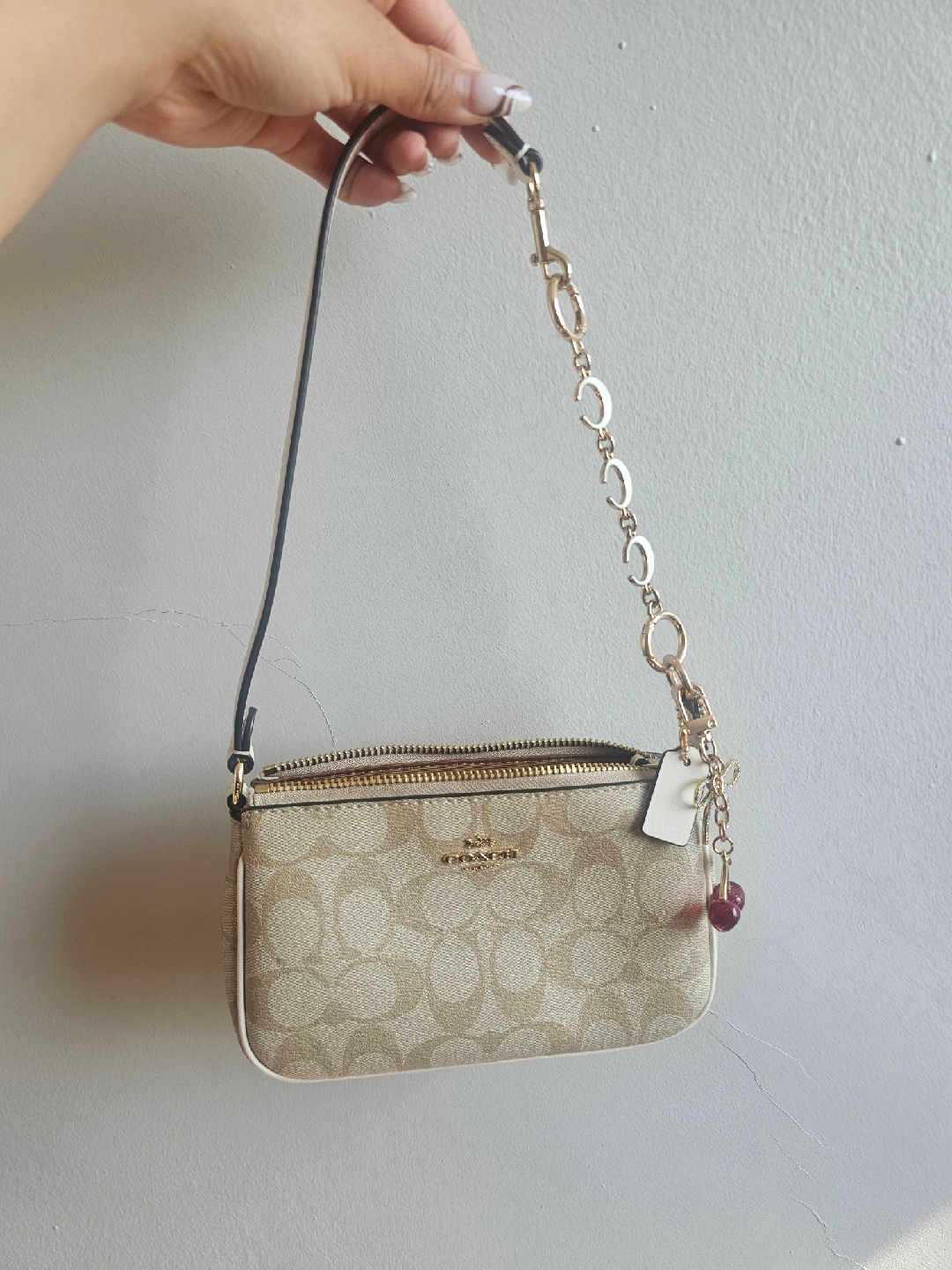 Selling a Coach Nolita 19 wristlet in signature canvas! The colour is gold/light khaki chalk. Bought this back in February of 2024, is in great condition with some dark spots on the inside of the bag. I am including the charms/accessories with this purchase as well! The bag is too small for my new upgraded phone hence why I am selling. I spent $103 on it but I am giving a discount at $65๐Ÿ˜Š