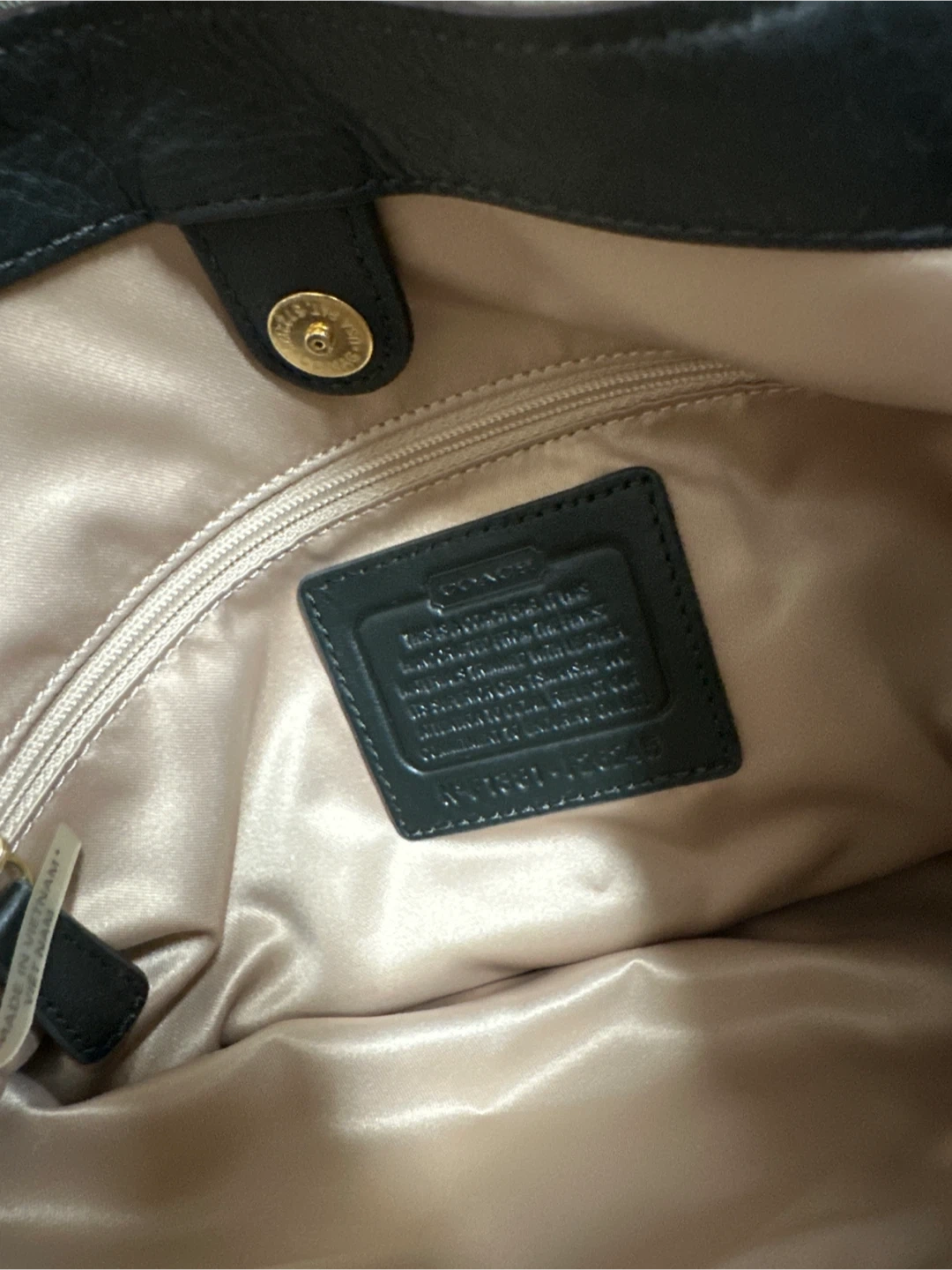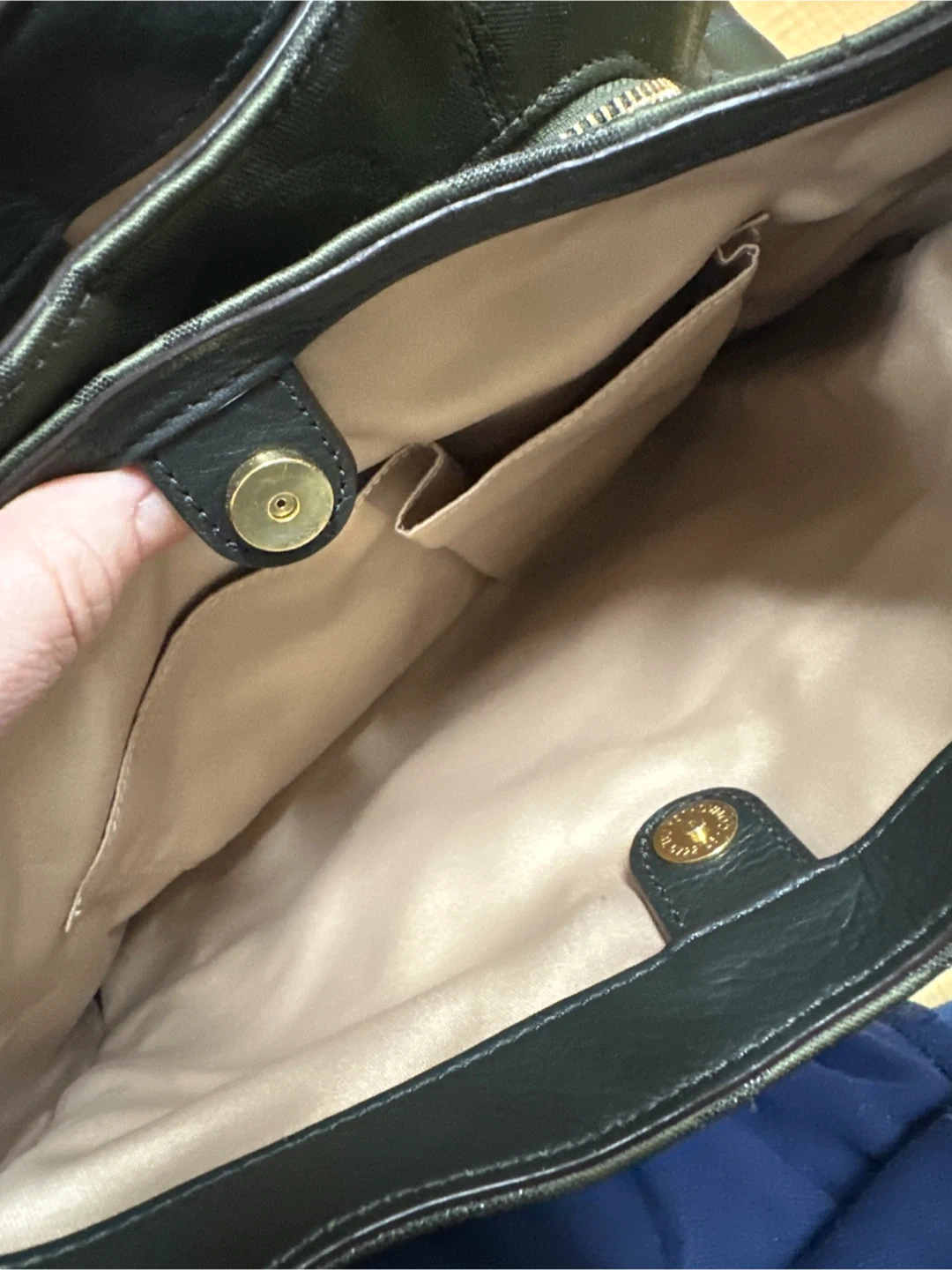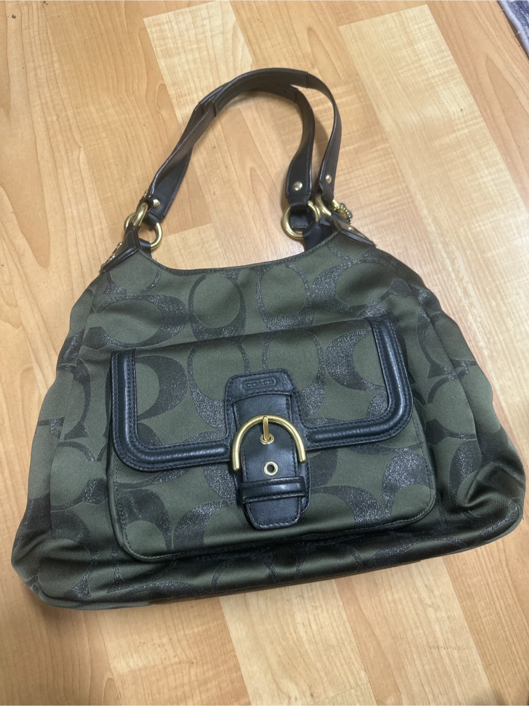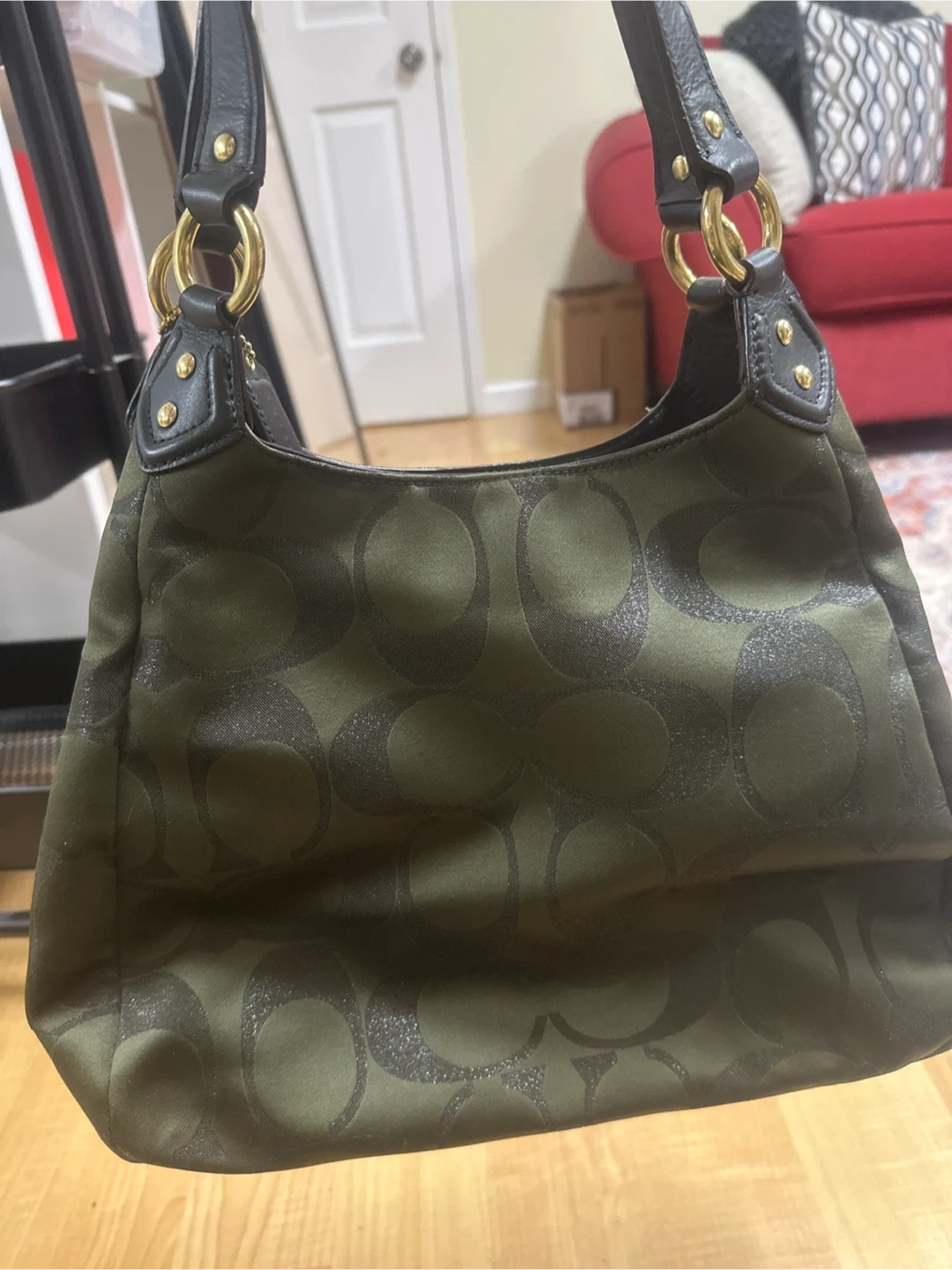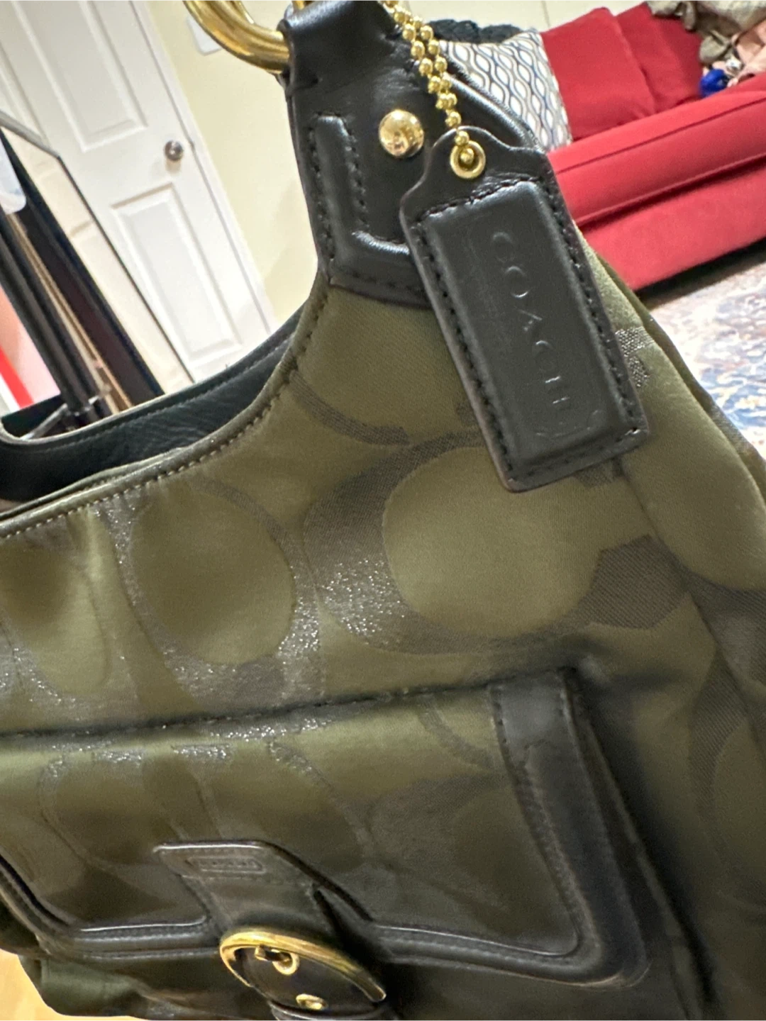 68Selling a Coach satchel bag in olive green with black leather trim. It features the classic Coach logo pattern throughout. The bag has a buckle detail on the front pocket and a spacious interior with multiple pockets. The interior lining is a light tan colour. The bag is in perfect condition!
