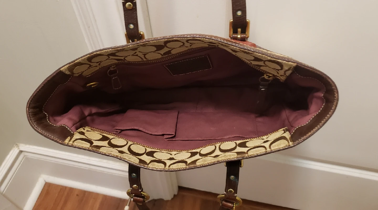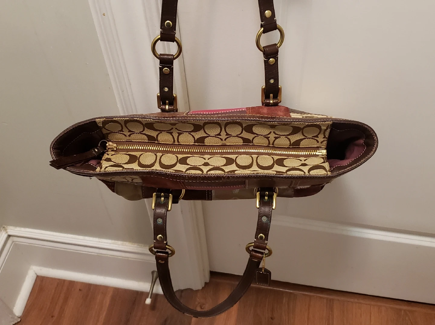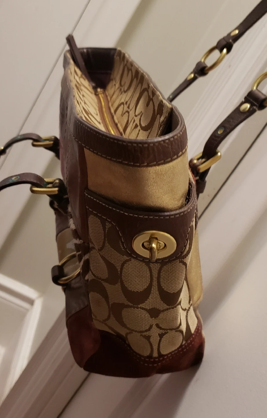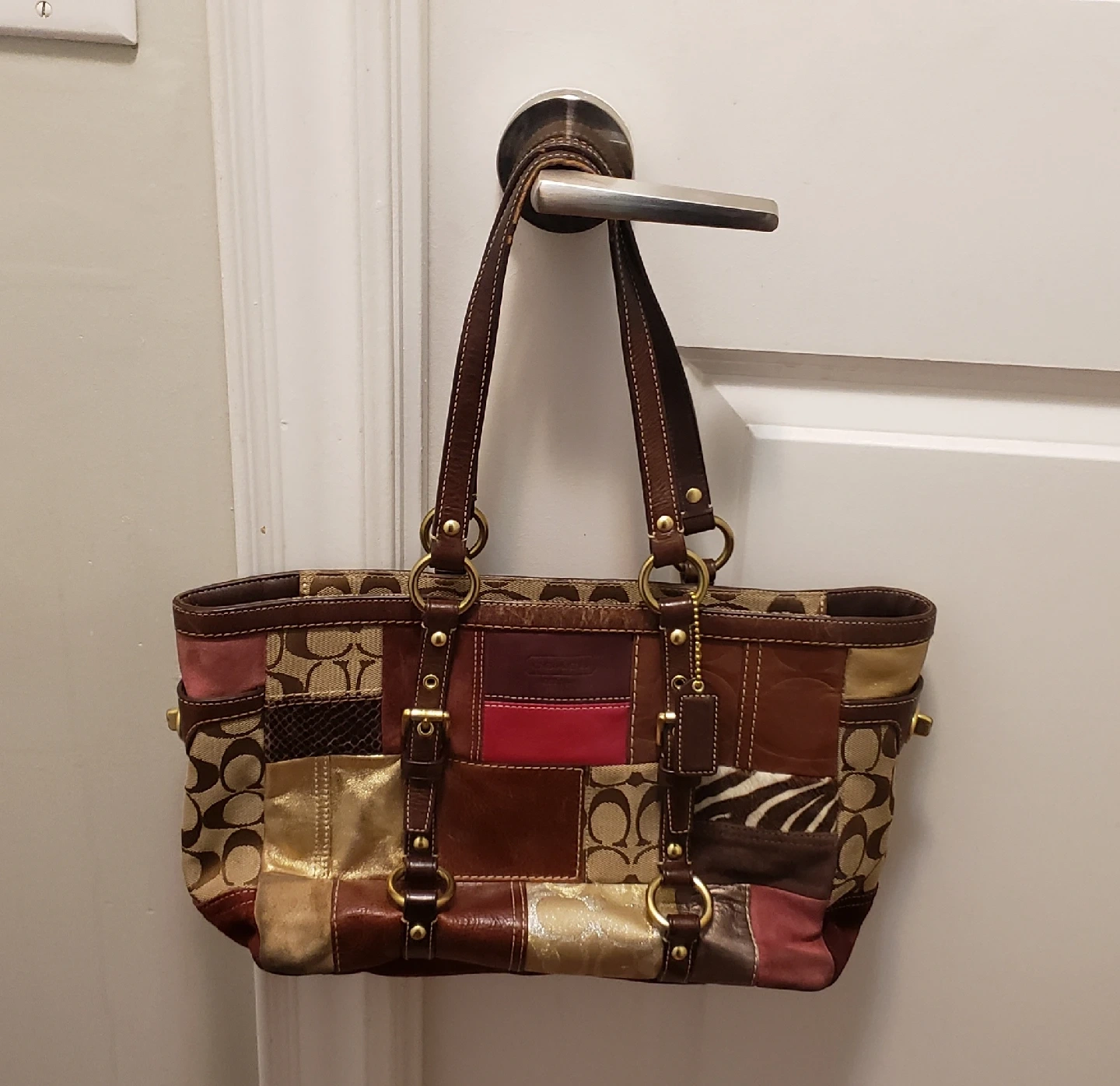 Unique Coach patchwork tote features a mix of leather, suede, and signature Coach canvas in a variety of patterns and textures. Features: - Two side pockets - Interior zip pocket - Interior slip pockets - Double shoulder straps