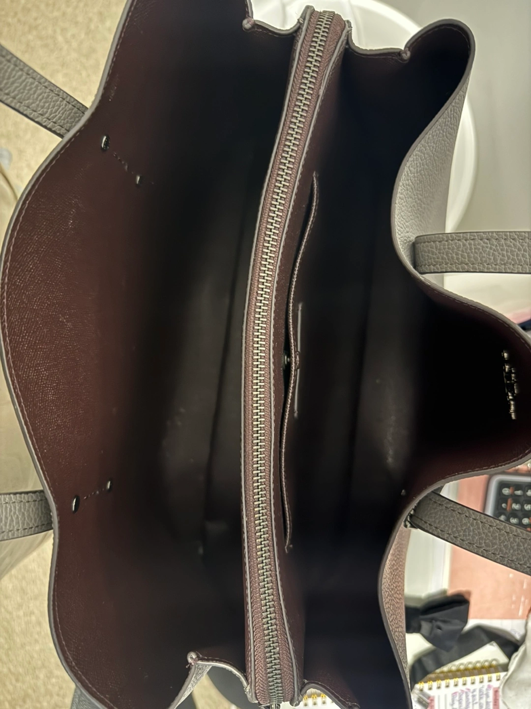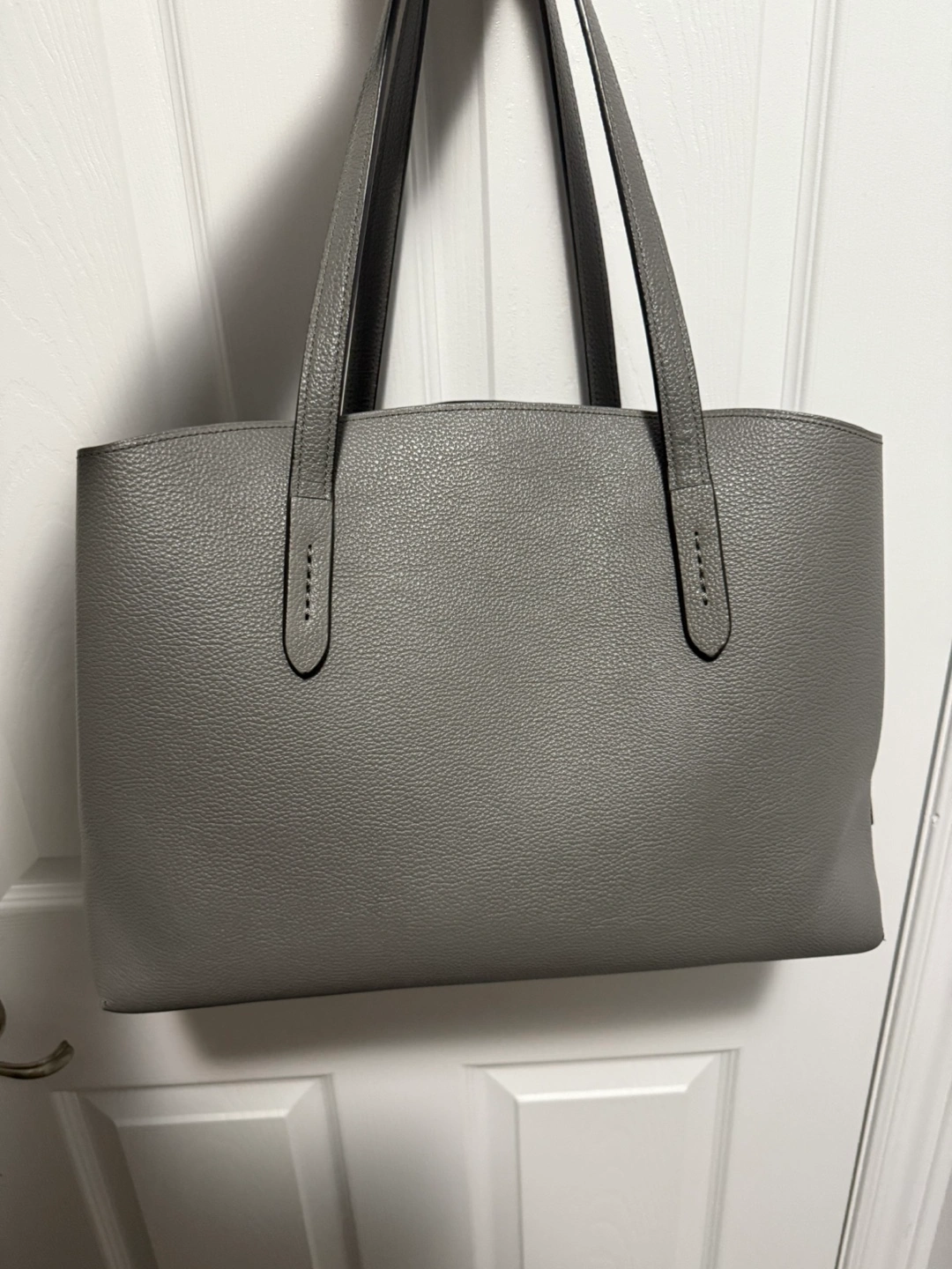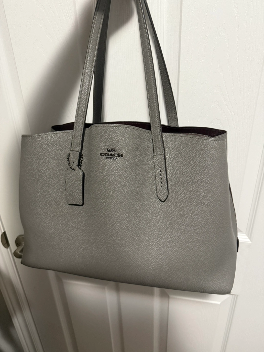 7Grey pebbled leather tote bag. Top zip closure. Two shoulder straps. Interior zip pocket and slip pocket. Has laptop/ipad compartment. Great for everyday use or college