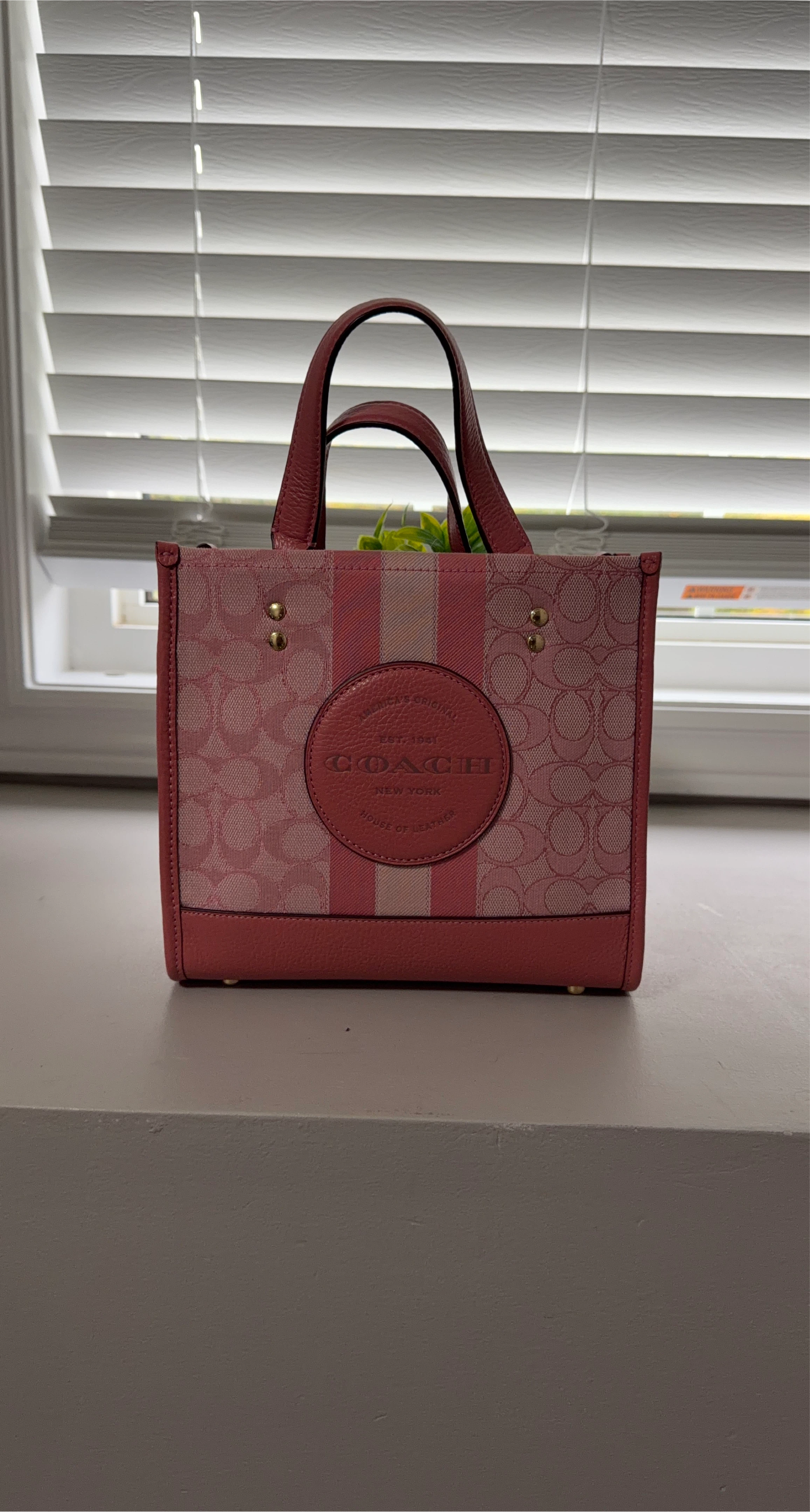 Selling a cute Coach Dempsey Carryall tote bag in pink! It's in great condition and perfect for everyday use. The bag features the Coach logo and has a stylish design.