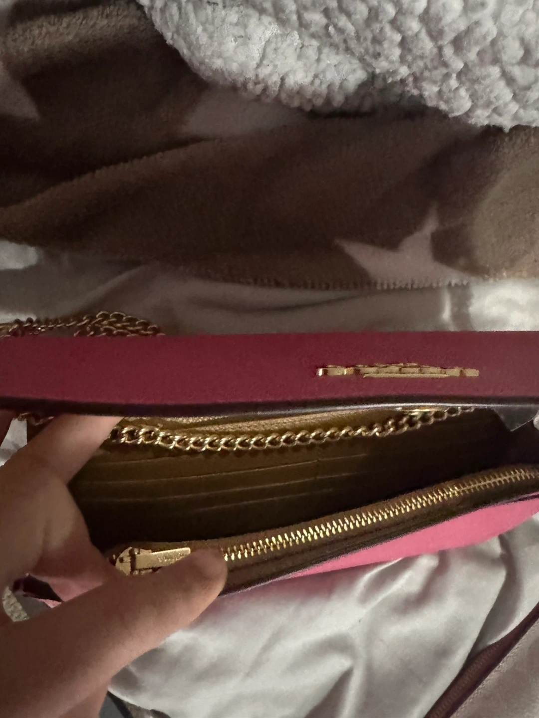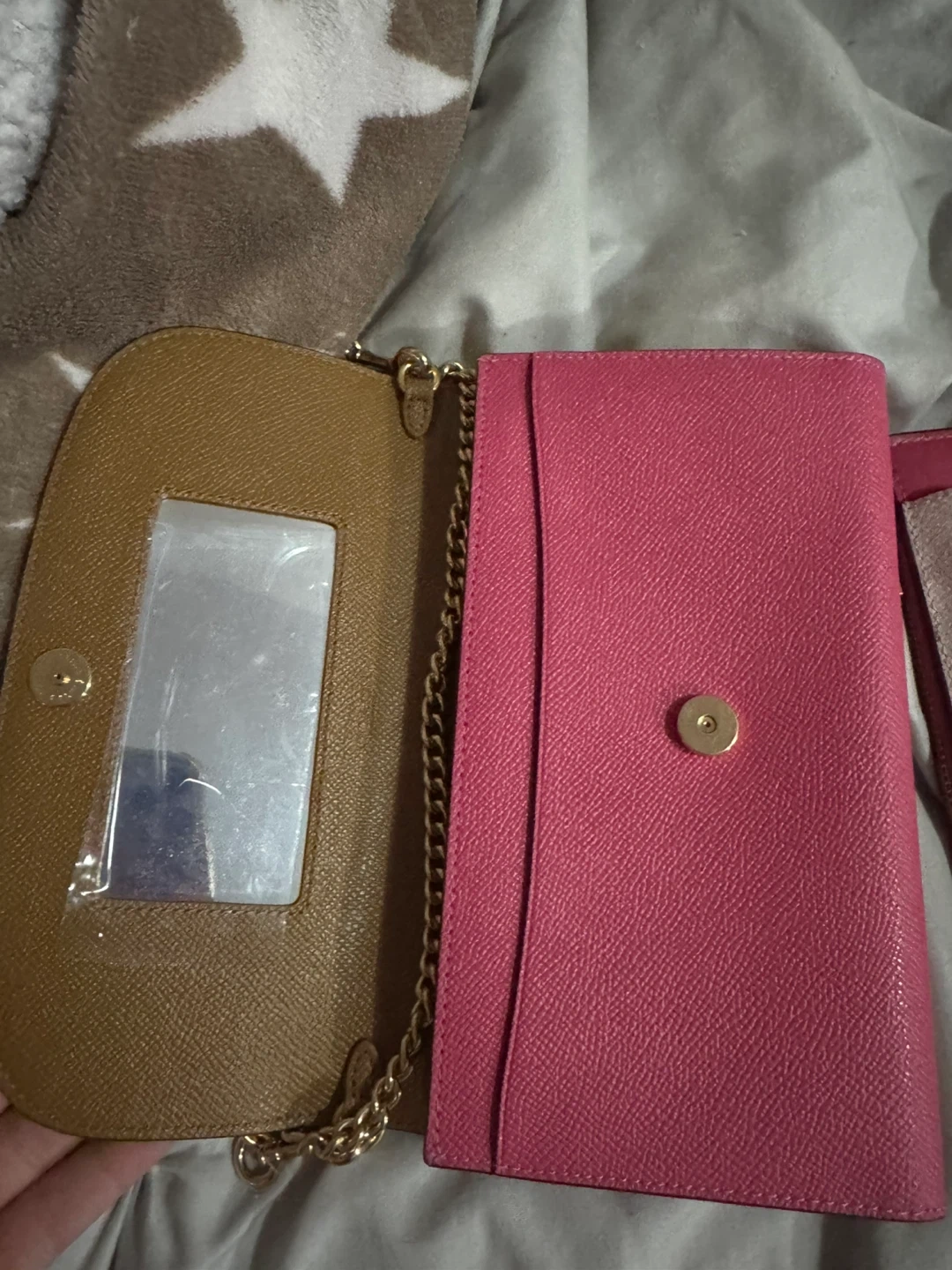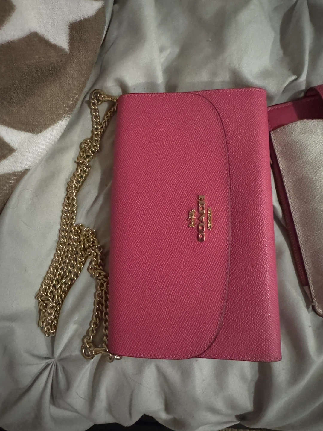 Selling a cute Coach wallet with a chain! It's a beautiful pink leather and has a gold chain. Great for carrying your essentials in style!