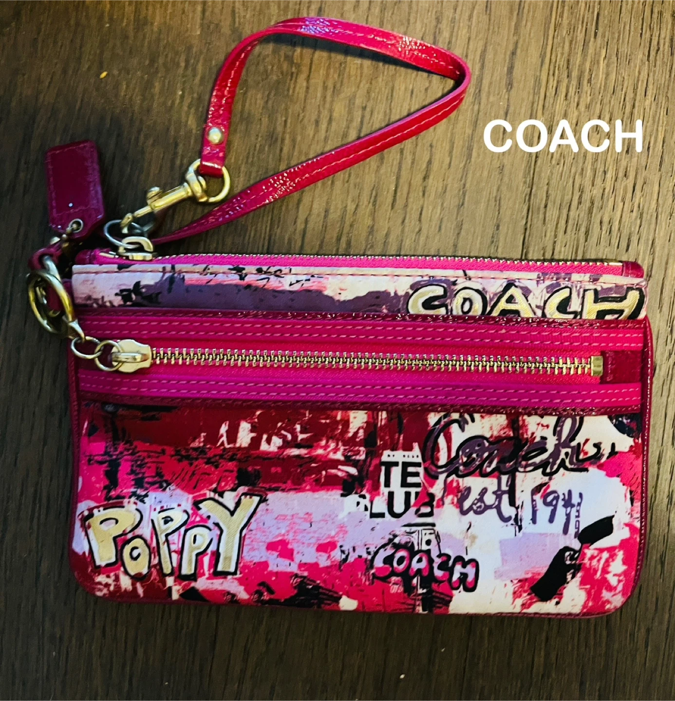 Selling a Coach Poppy wristlet in pink. It's in great condition and features the Coach logo and the word "Poppy" in a fun, graffiti-style design. Perfect for carrying your essentials!