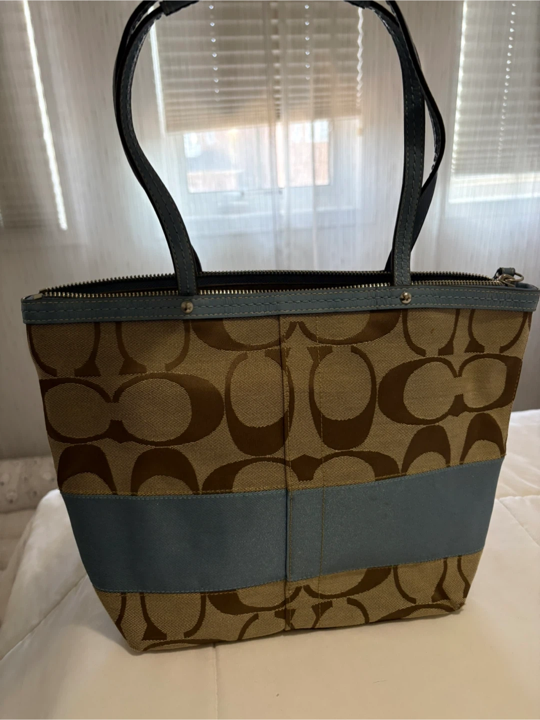 30Selling a Coach tote bag in the signature brown pattern with a blue stripe. It's in great condition and perfect for everyday use!