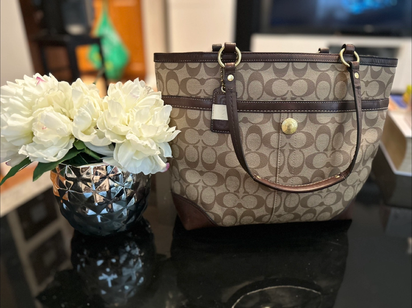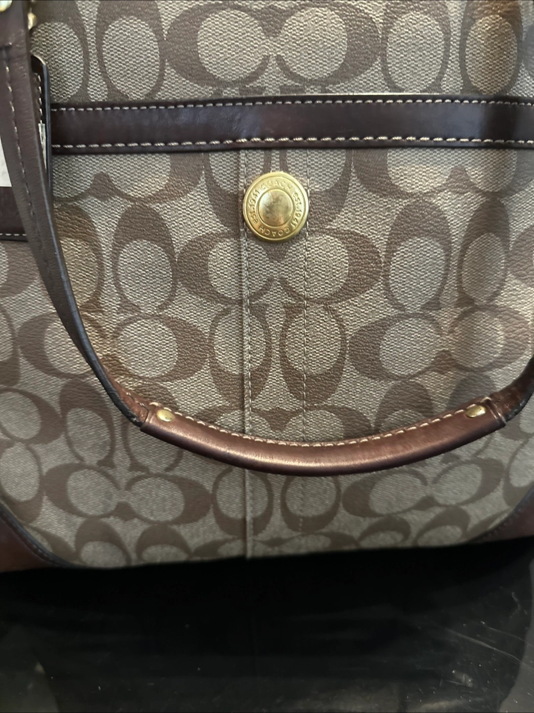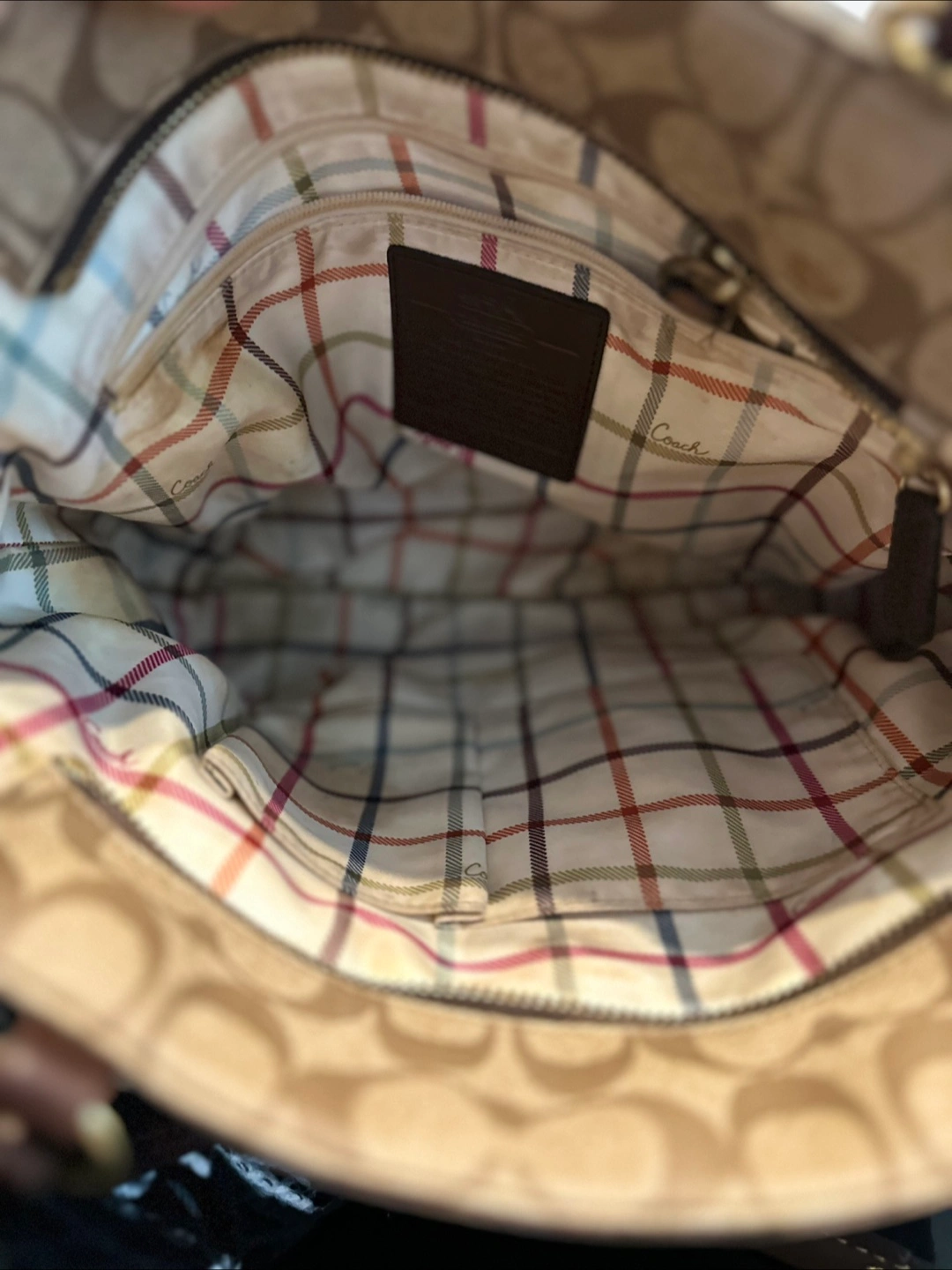 20Beige and brown Coach tote bag. Features signature C pattern. Brown leather trim. Top handles. Interior pockets. Zipper closure. Inside has stains from make up.