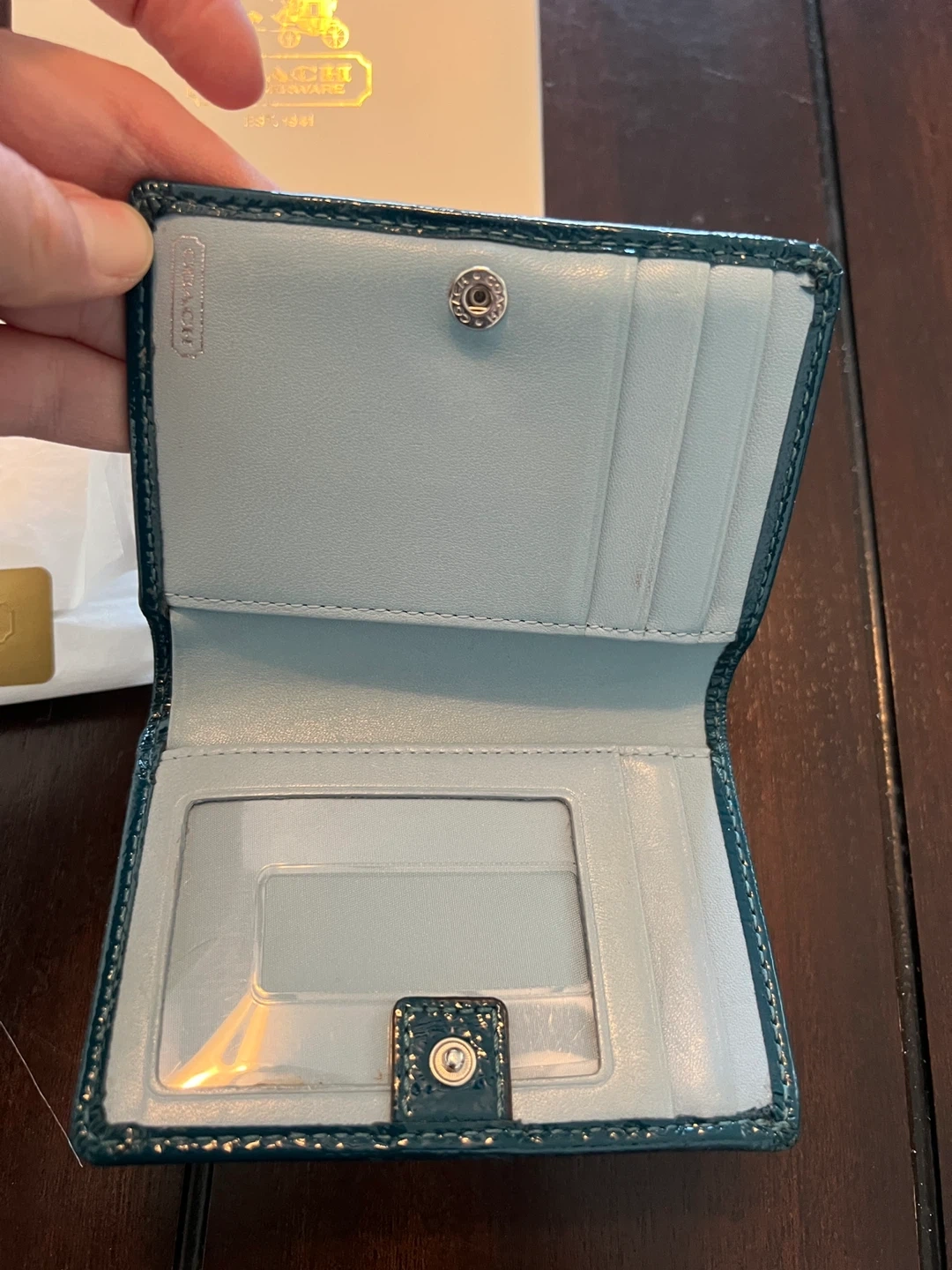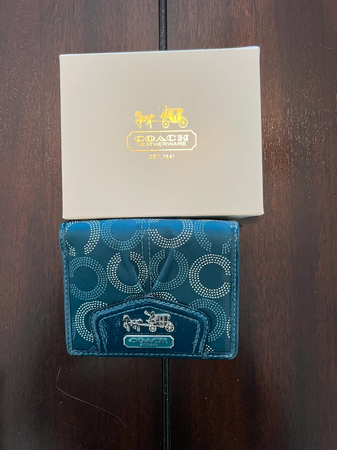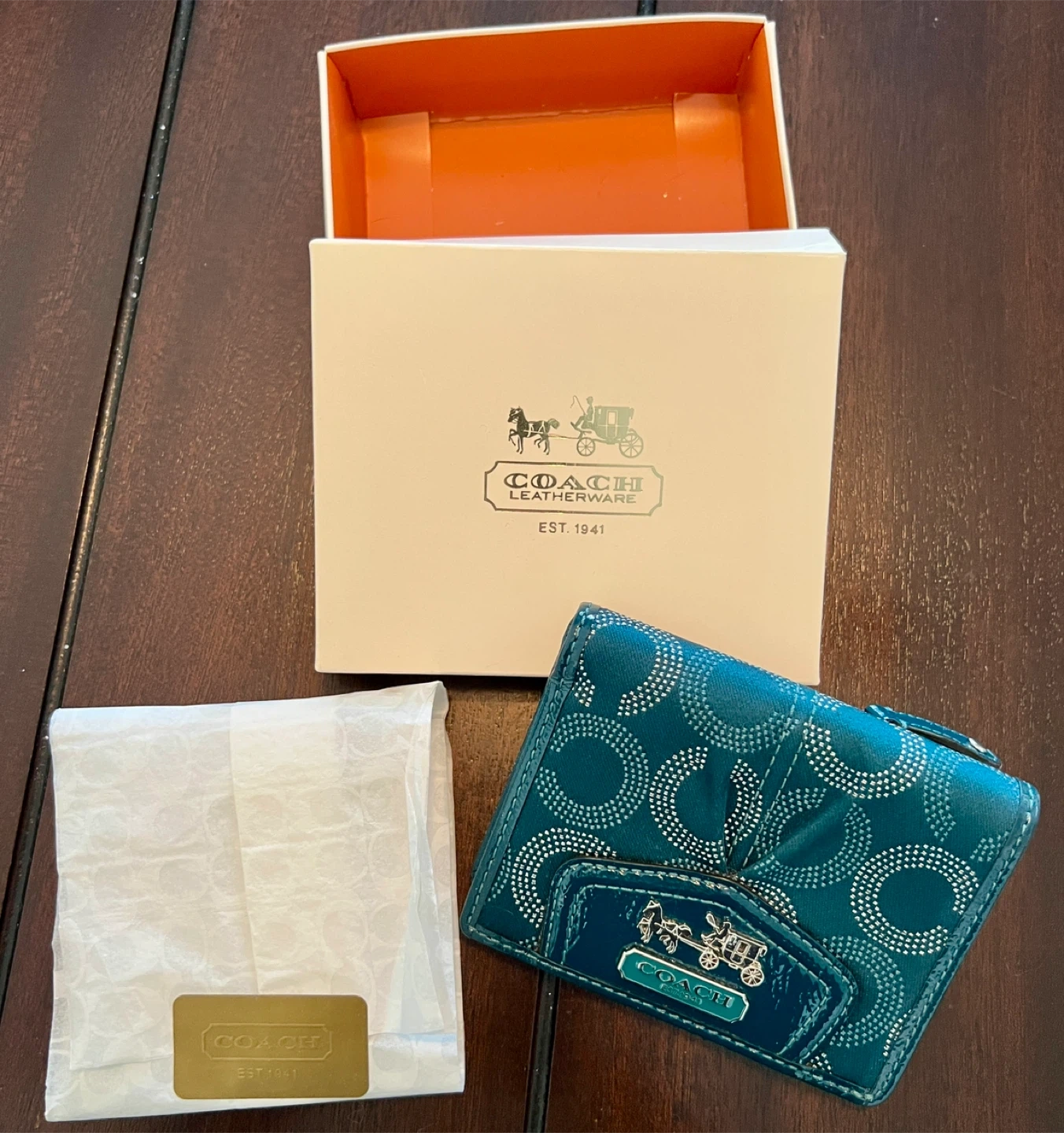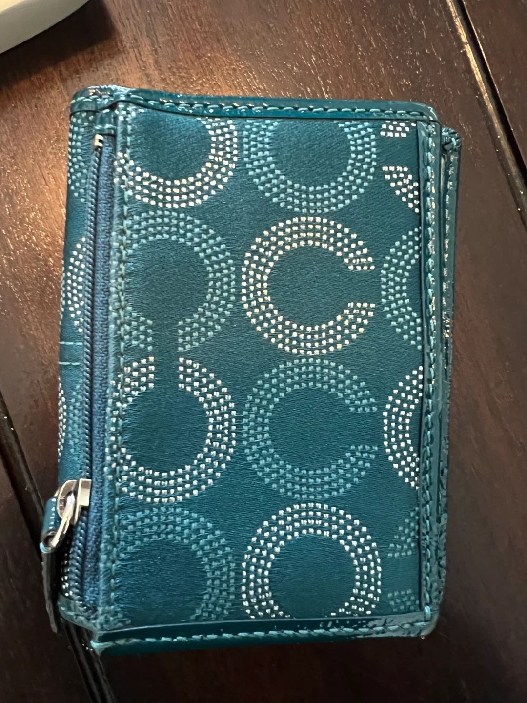 84Selling a Coach wallet in teal with a silver pattern that I purchased myself from the Coach store. It's in good used condition and comes with its original box. Perfect for keeping your cards and cash organized in style. It has one flaw that can be seen in the photo, which is a crack in the plastic where your drivers license or ID goes. It doesn’t impact function.