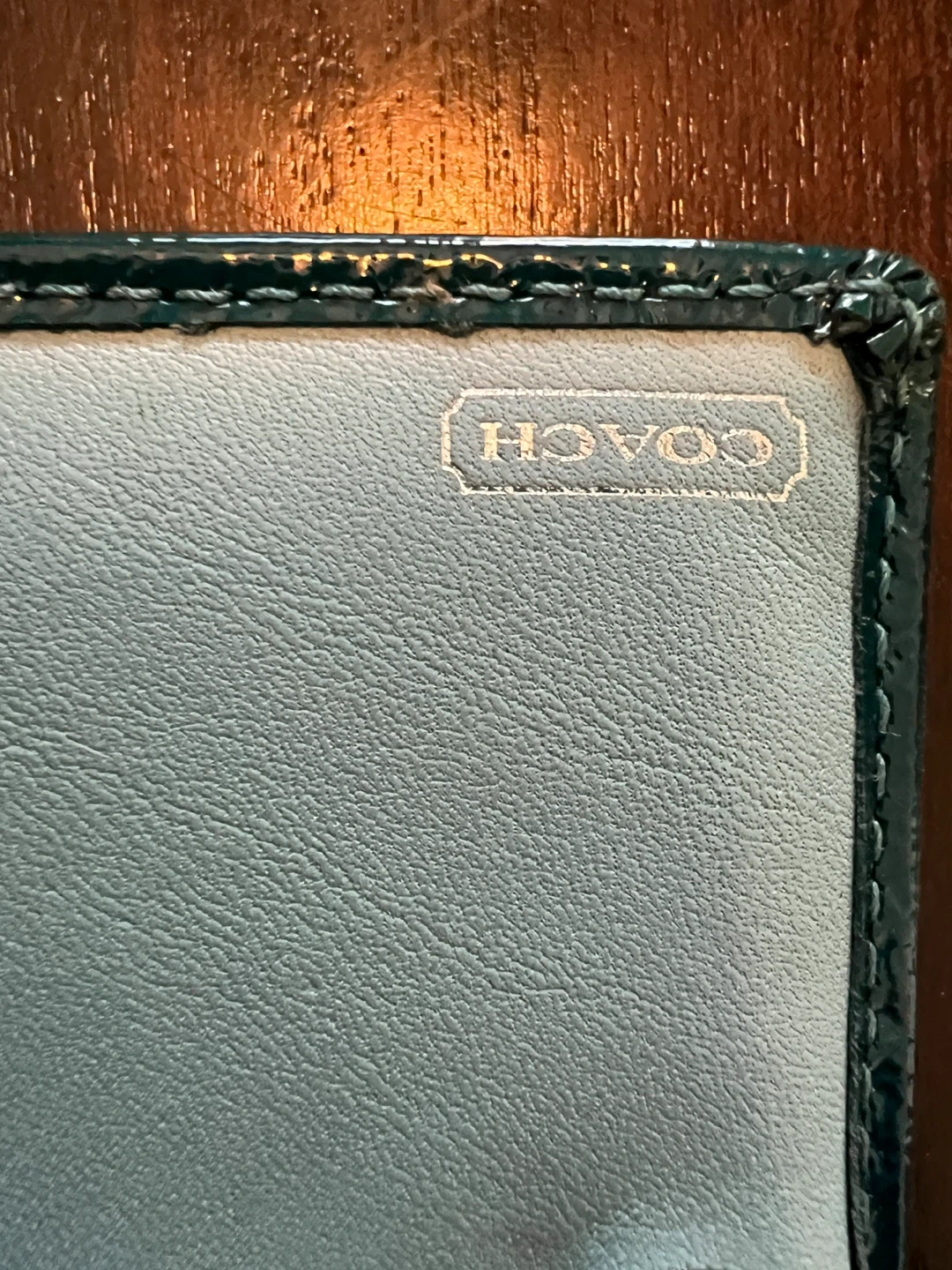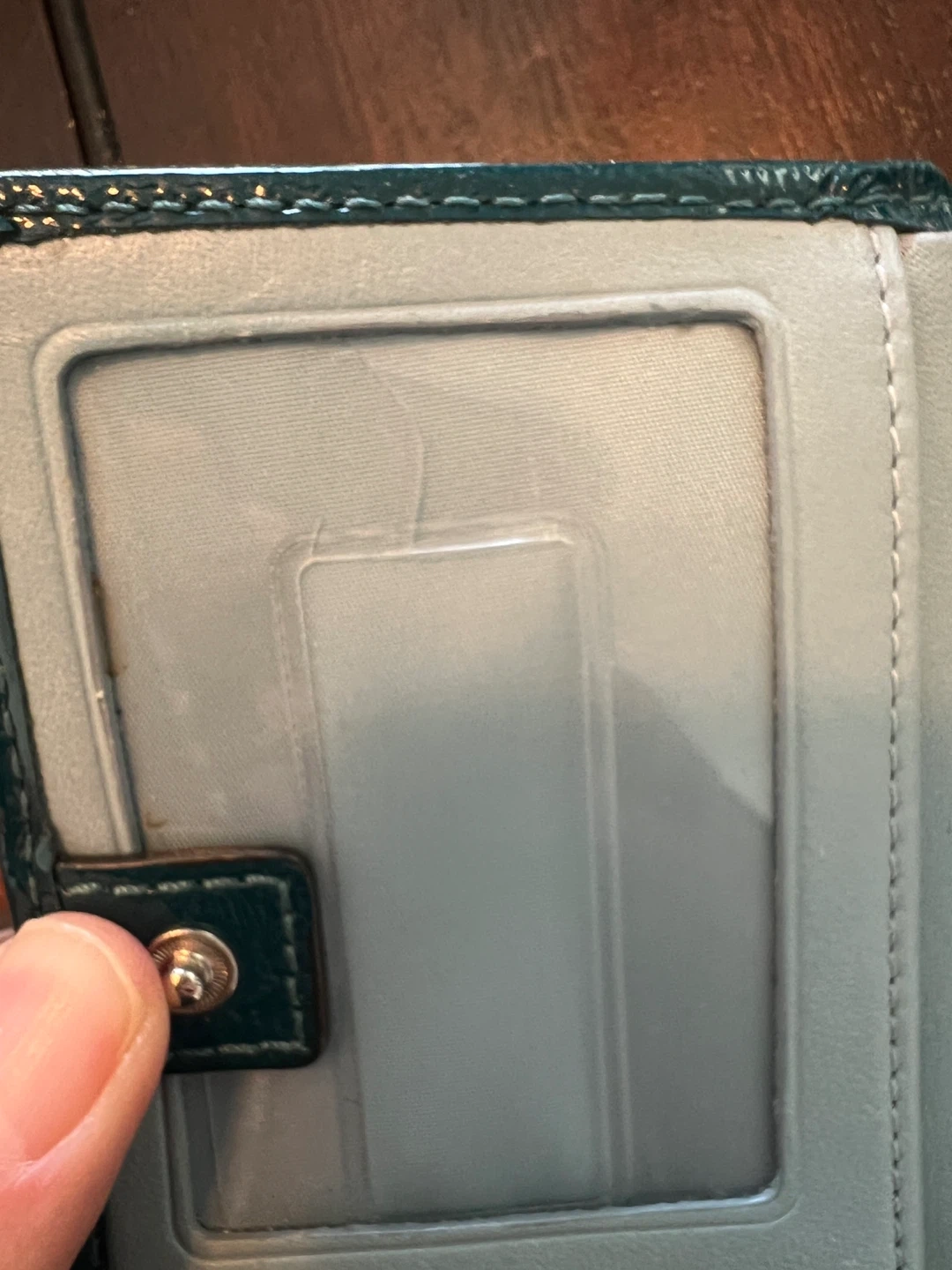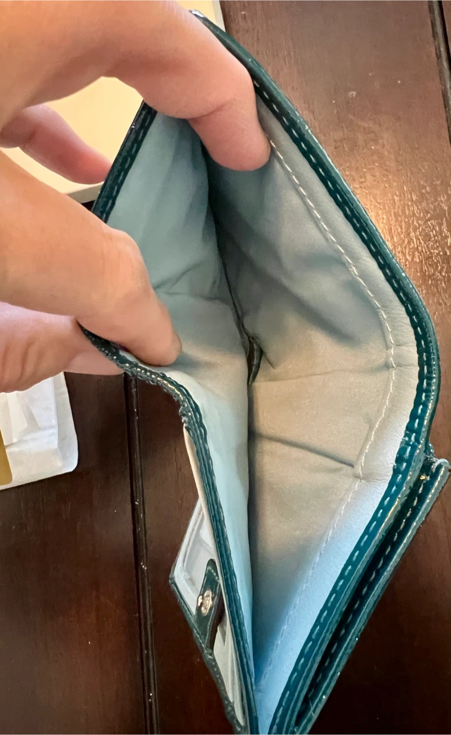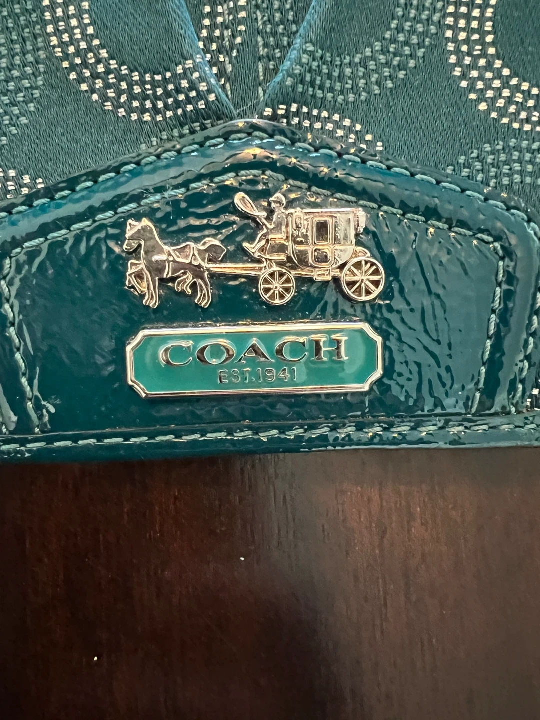 84Selling a Coach wallet in teal with a silver pattern that I purchased myself from the Coach store. It's in good used condition and comes with its original box. Perfect for keeping your cards and cash organized in style. It has one flaw that can be seen in the photo, which is a crack in the plastic where your drivers license or ID goes. It doesn’t impact function.