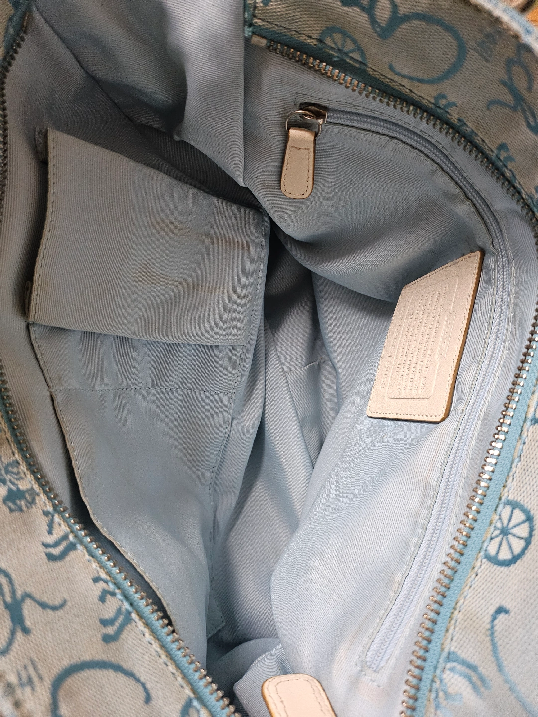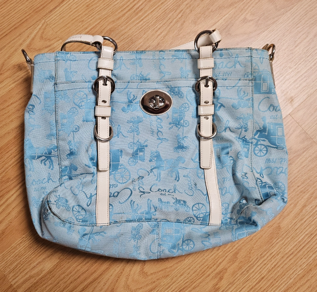 This is a light blue Coach tote bag. It features a unique pattern with carriages and the Coach logo. The bag has white straps and silver hardware. Inside, there are multiple pockets for organization. It's in great condition and ready for a new home!