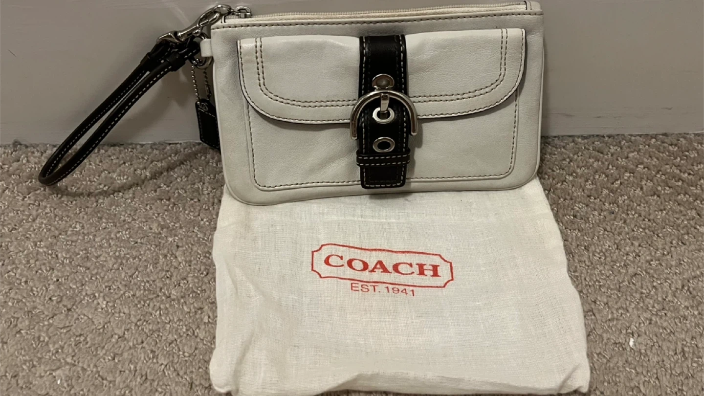 Selling a Coach wristlet in white leather with a brown buckle detail. It comes with its original dust bag! It's in great condition and ready for a new home
