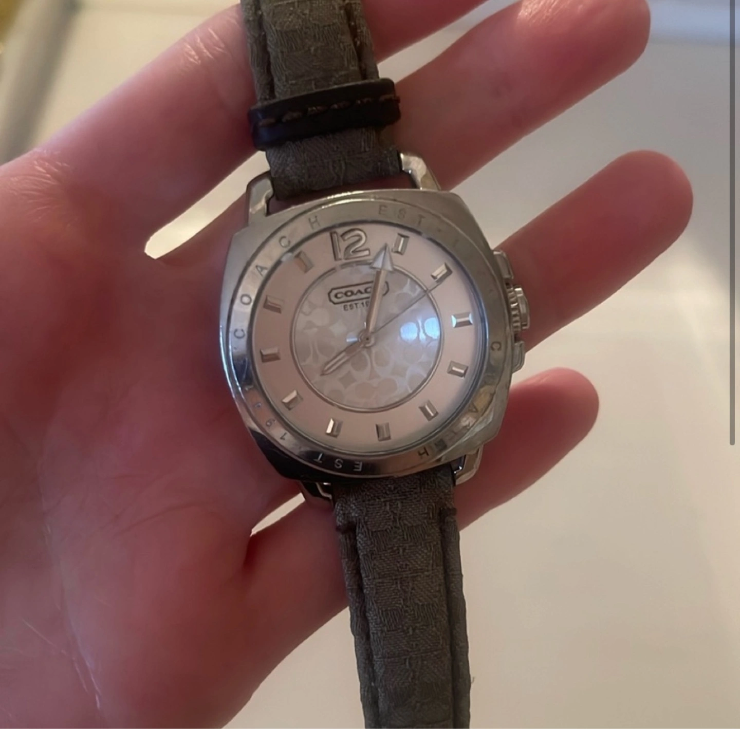 14Stylish Coach wristwatch. Features a silver tone case and a brown leather band. Analogue face with Coach logo. Pre-owned. $210 was original price