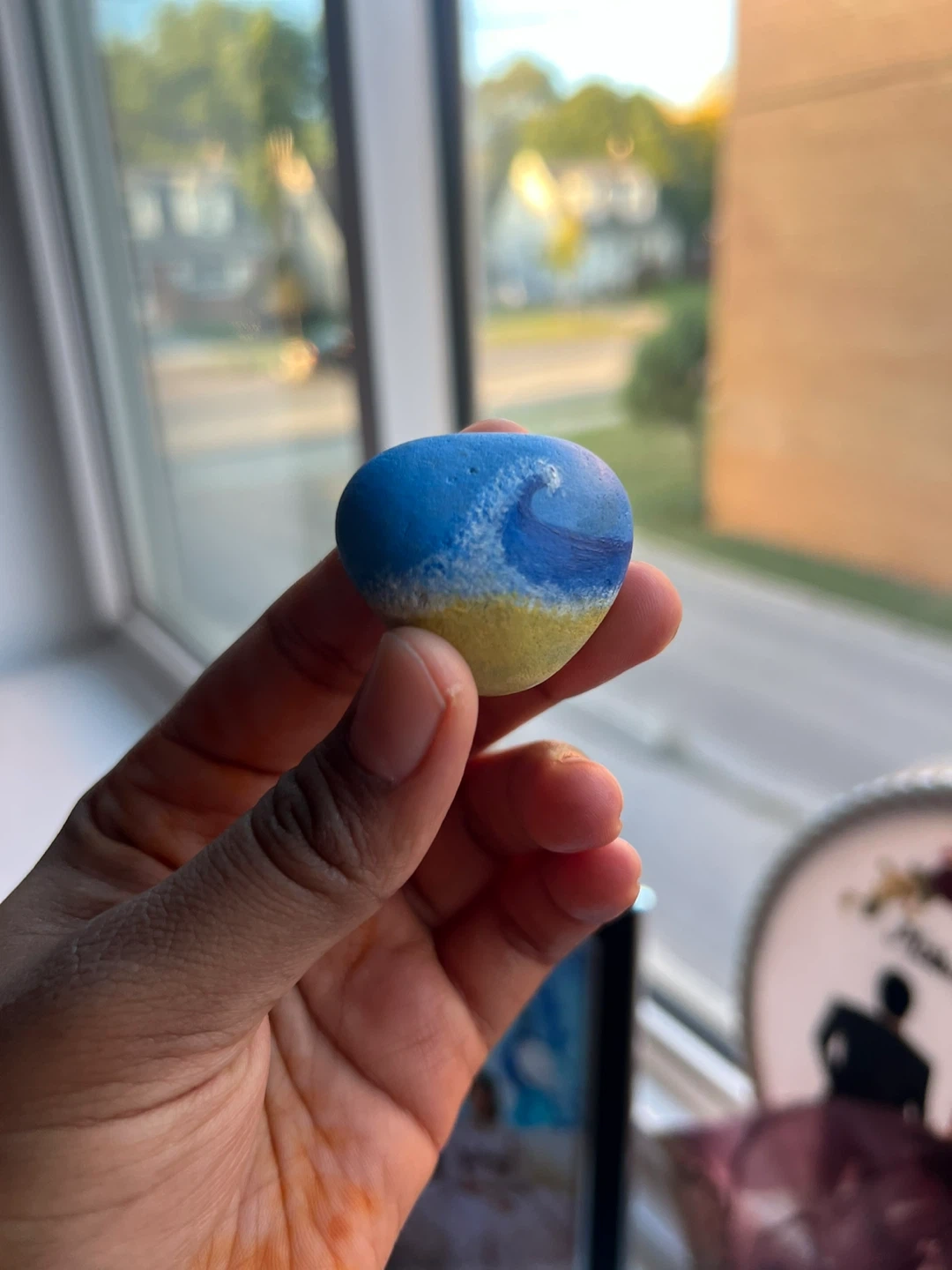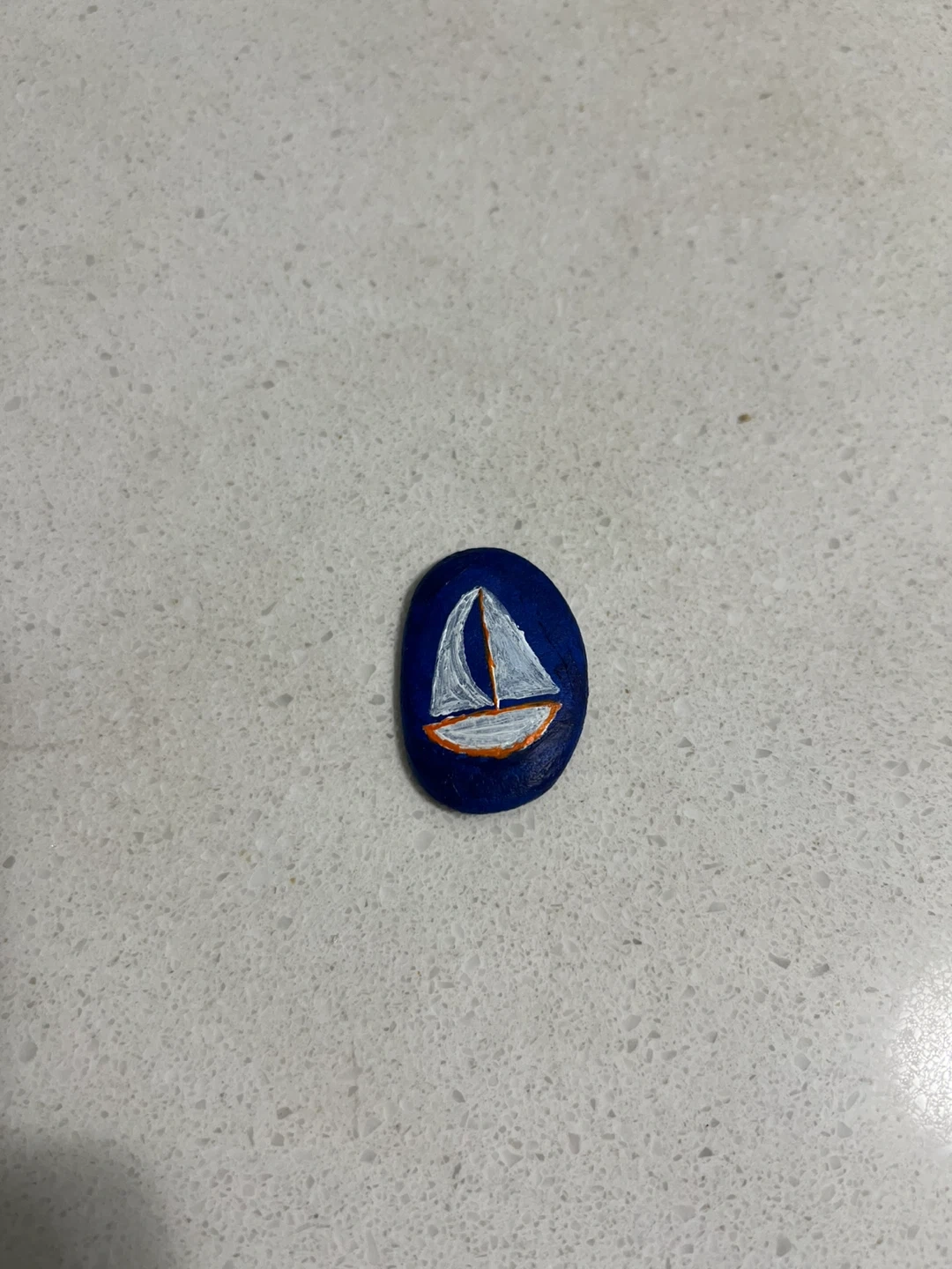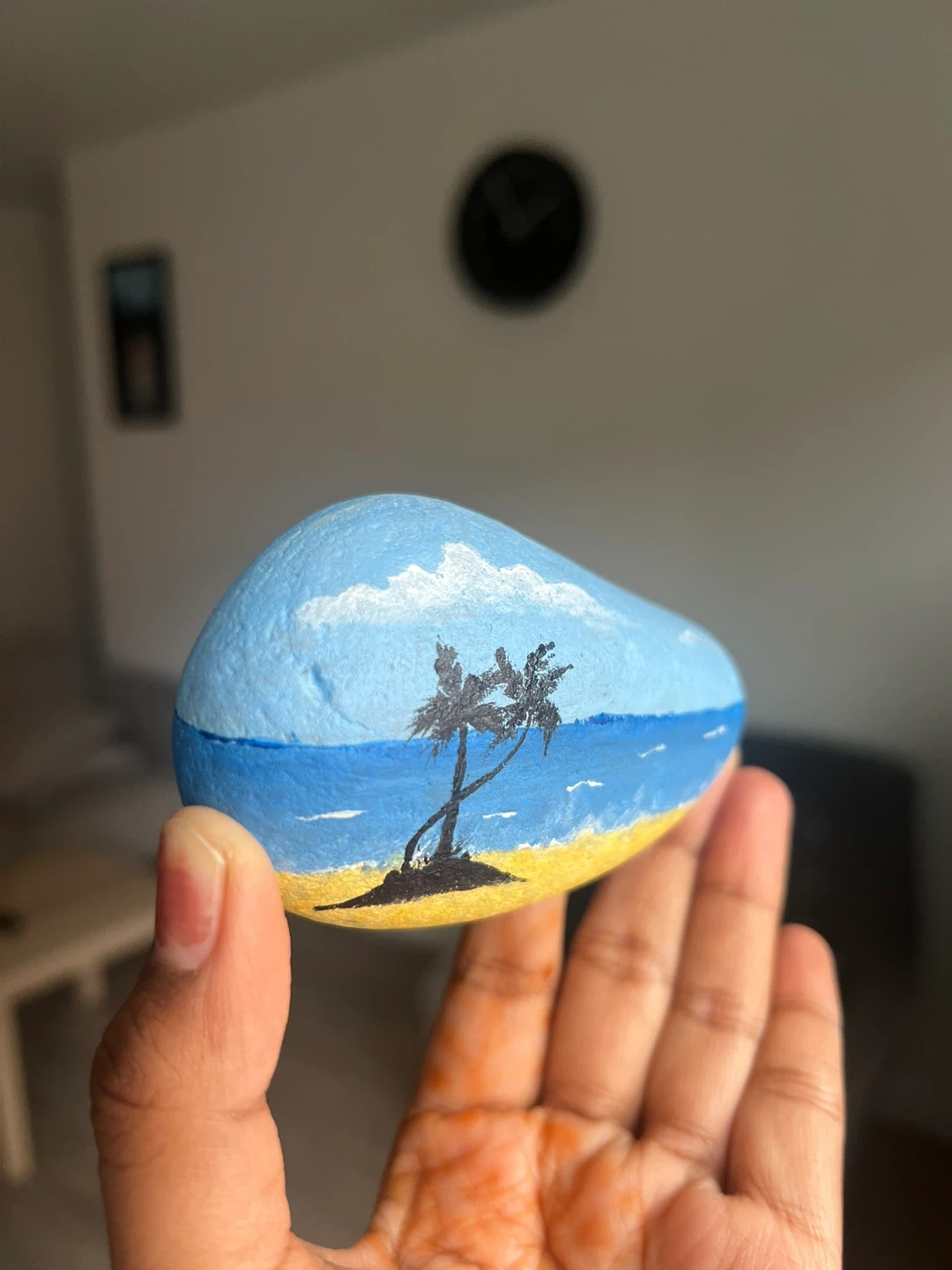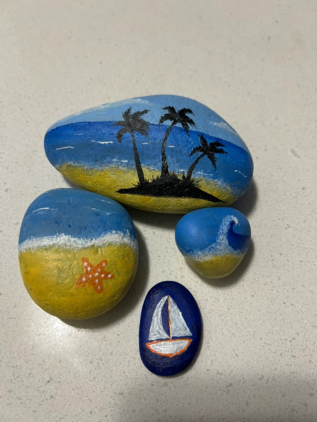 5Set of 4 Hand-Painted Beach Themed Rocks | Local Hamilton Art 🏖️ Bring a piece of the seaside to your home with this unique collection of four hand-painted decorative stones! This Set Includes: • Large Island Scene (Palm Trees) • Starfish Beach Scene • Blue Wave Stone • Sailboat Stone Art & Materials: • Paint: High-quality acrylic paints. • Display: FOR INDOOR USE ONLY. These are best displayed on a shelf, desk, or mantle.