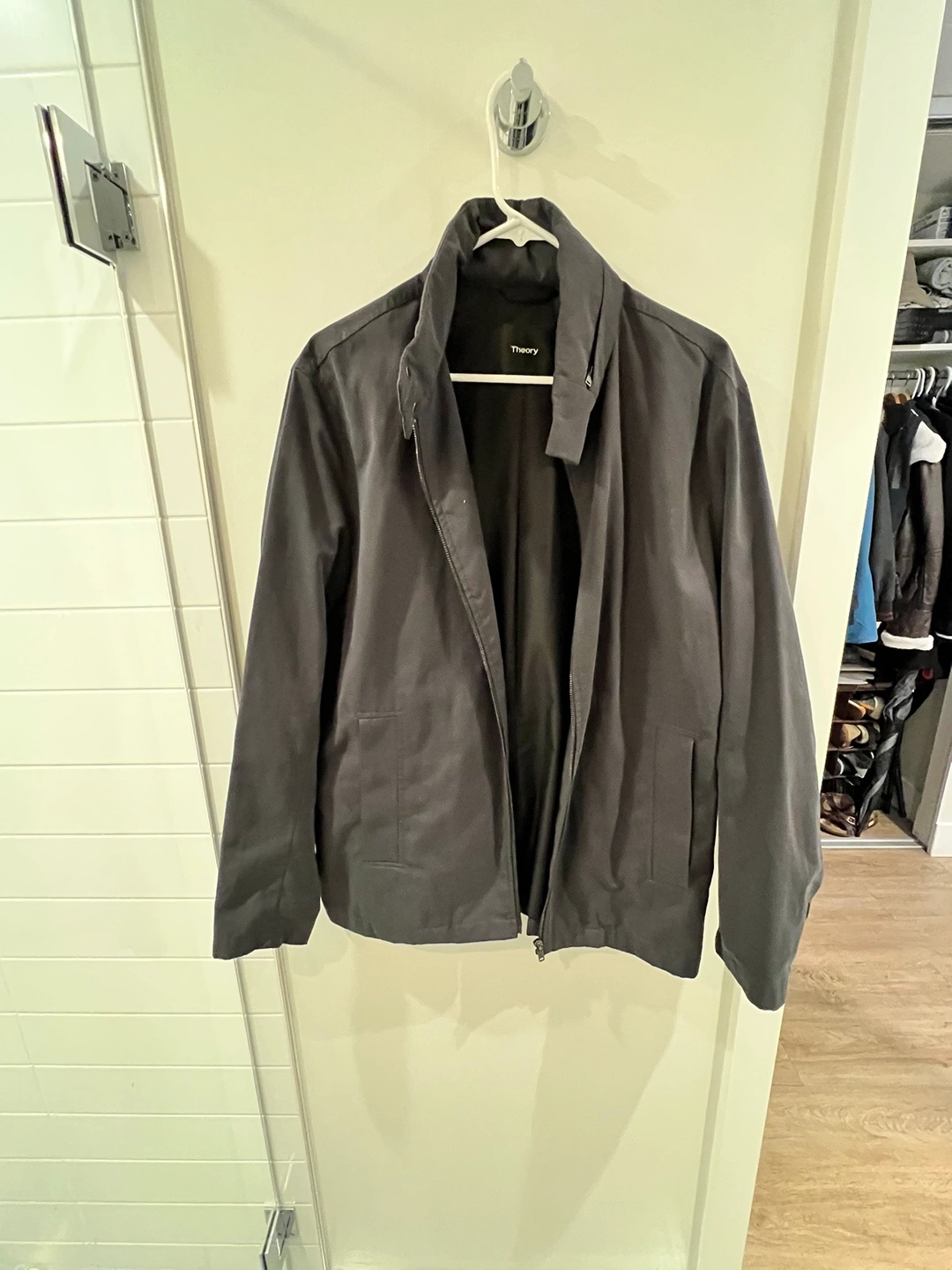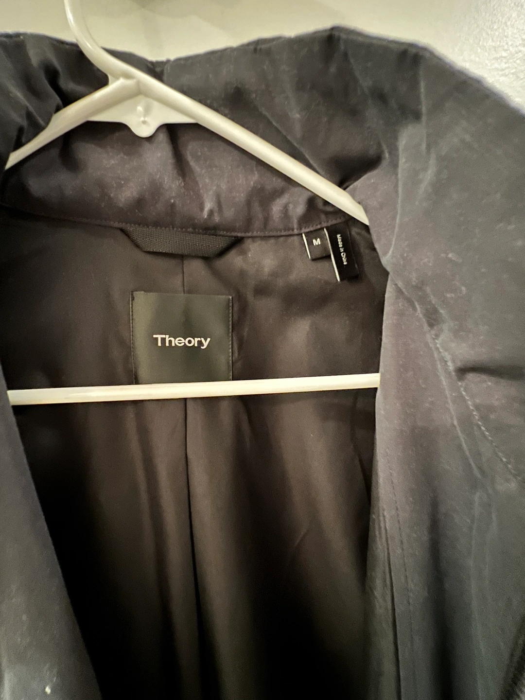Man’s theory brand coat new never been used. Black has a hood under the collar sipped in.
