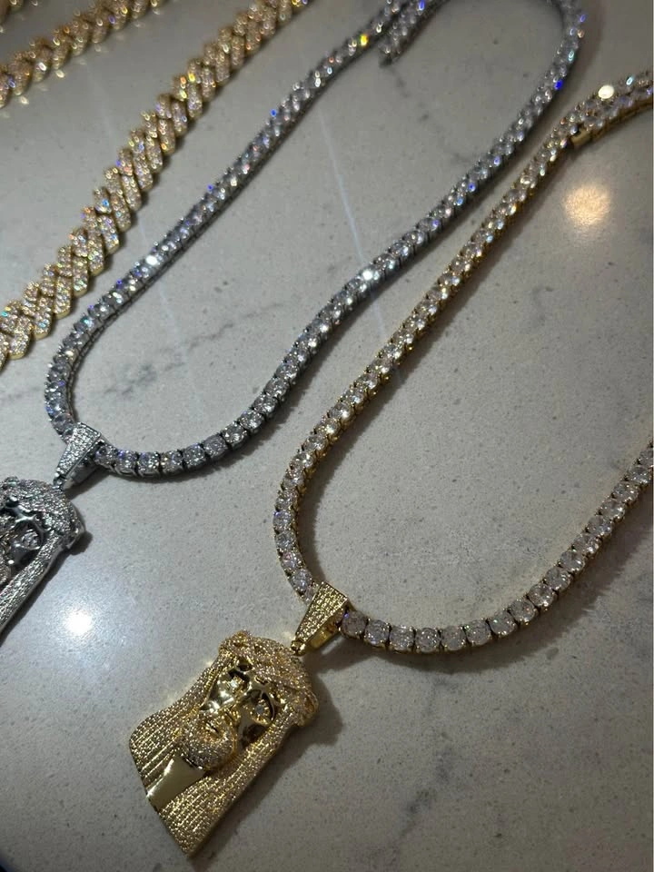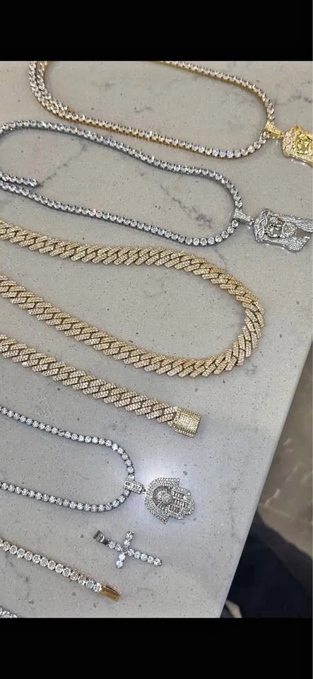Coated in Pure 18 K Gold Tennis chains (100% water proof rust proof tarnish proof) 4 MM 5 MM, base metal 304 stainless steel. Copper, Coated in Pure 18 K Gold 14 MM wide Cuban links chain. Silver color and Gold available 5 MM Tennis chain 20 inch - 100$ 4 MM Tennis chain 20 inch - 80$ 5 MM Tennis bracelet 8 inch - 75$ 4 MM Tennis bracelet 9 inch - 65$ Jesus head pendant / Evil eye - 35$ Cross pendant - 20$ SET - 5 MM Tennis chain , Tennis bracelet and Jesus head / Evil eye pendant - 200 14 MM Cuban link chain - 80$ 14 MM Cuban link bracelet 8 inch - 65$ Cross pendant set with Natural Zircons Gold - 35$ SET - 170$ Payment after pickup. Pick up - 308 Jarvis street , M5B 0E3