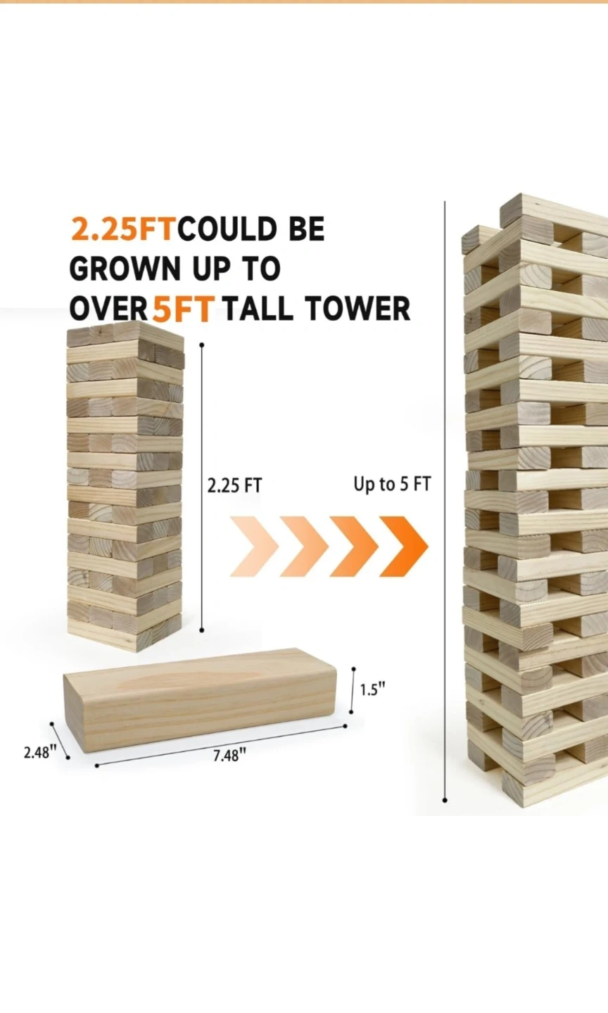 •54 large-sized blocks (approx. 7.48 x 2.48 x 1.5 inches), initial tower height 2.25 feet (18 rows), reaching up to 5 feet during play!