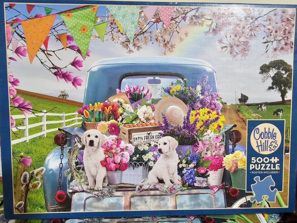 48Looking to sell or trade a Cobble Hill 500-piece jigsaw puzzle. It features a charming country truck in spring scene. The puzzle includes a poster inside the box for easy reference. It measures approximately 45.7 cm x 30.5 cm (18" x 12") when completed