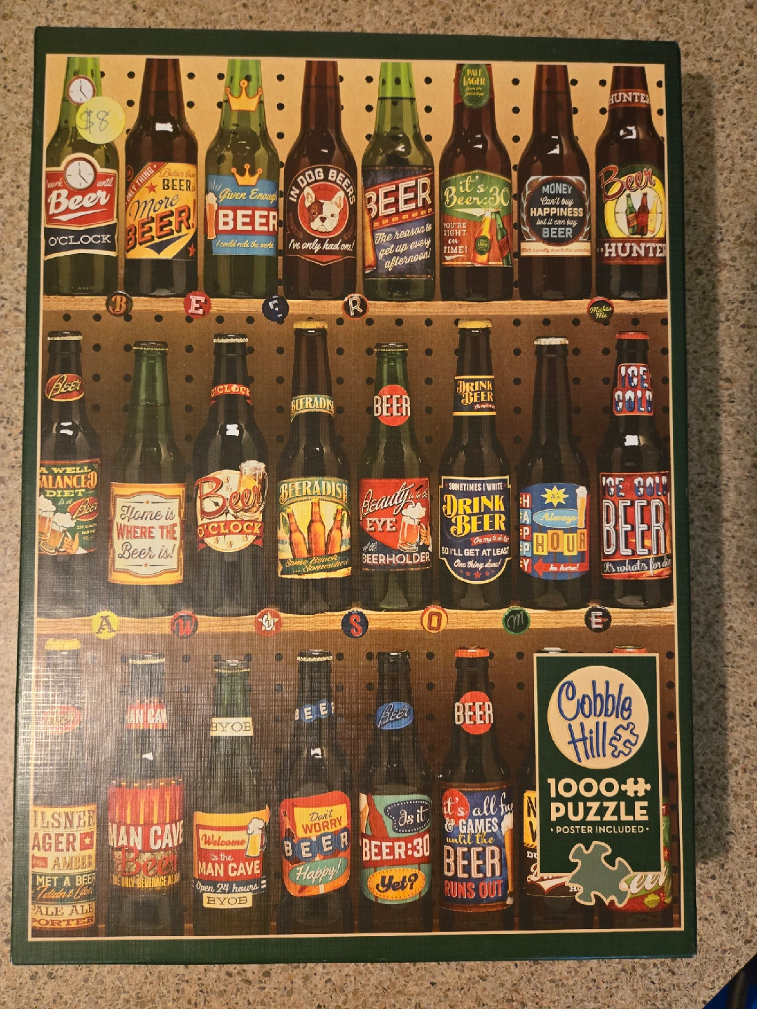 56Looking to sell this Cobble Hill 1000+ piece puzzle. It features a fun design of various beer bottles and includes a poster! Perfect for puzzle enthusiasts and beer lovers alike