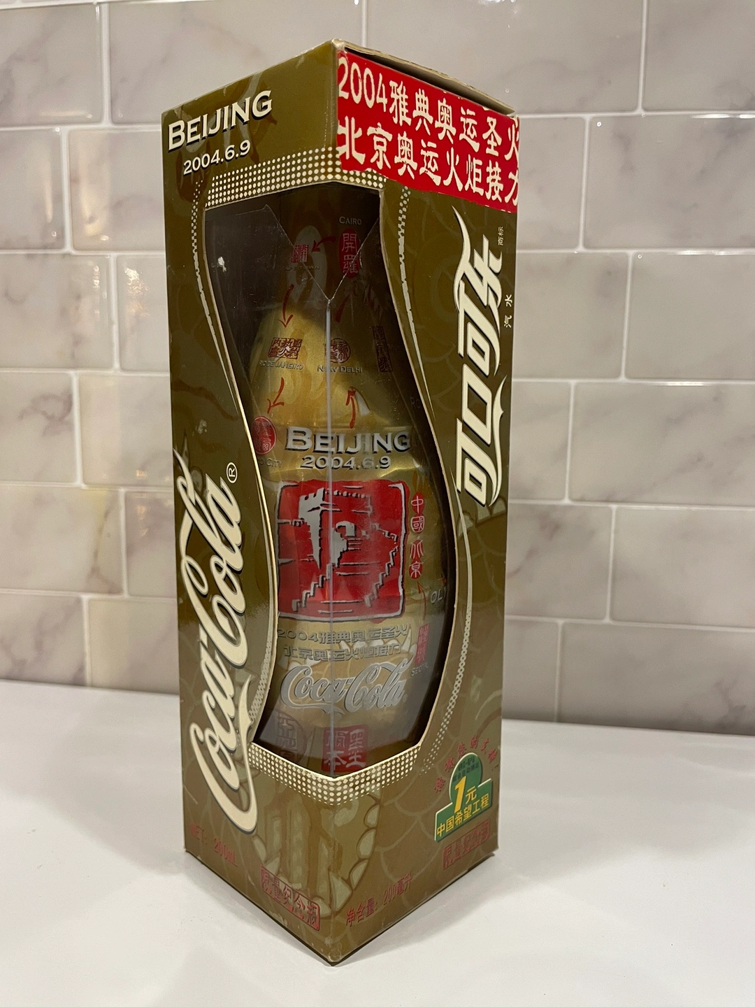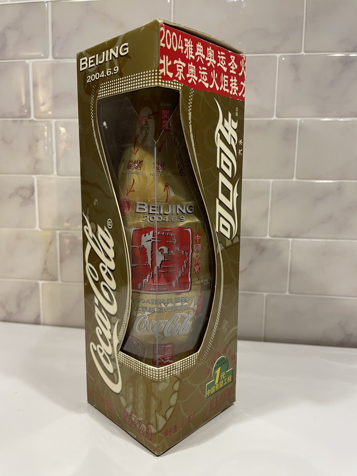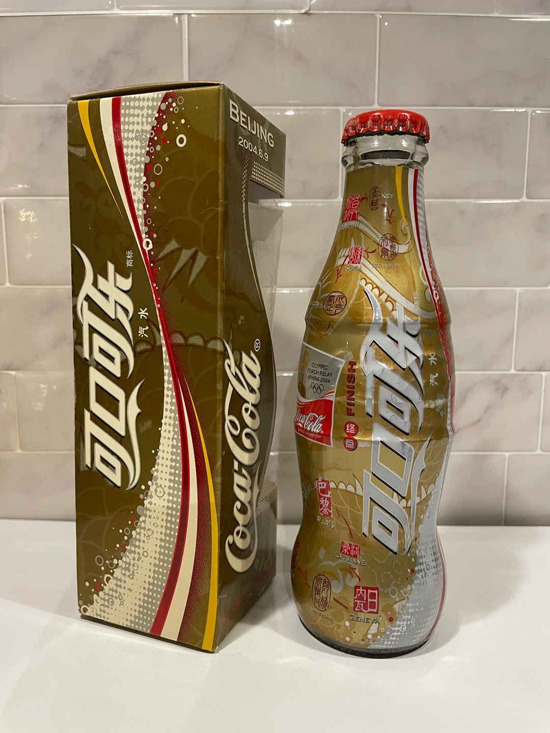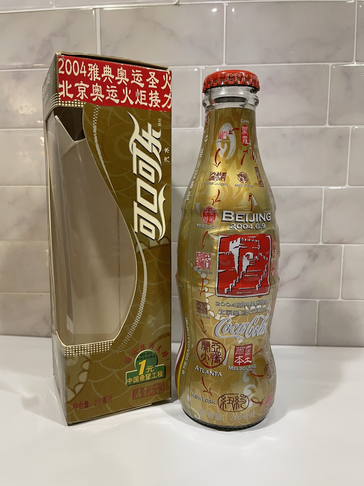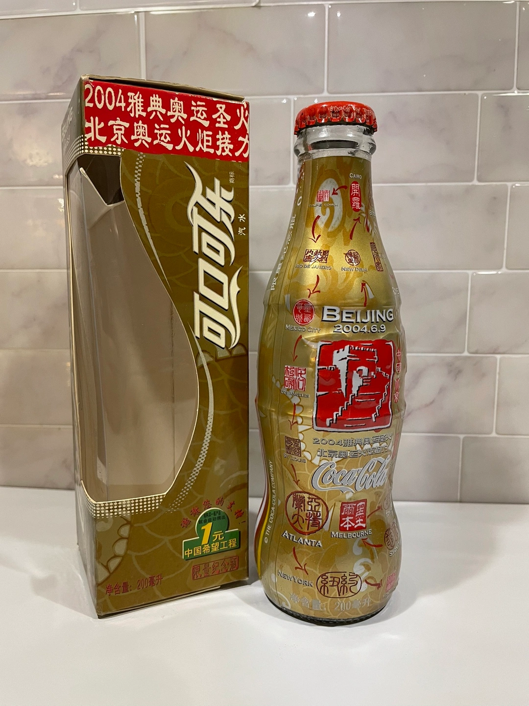 23This Coca-Cola bottle commemorates the 2008 Beijing Olympics and comes with its original box, making it a unique collectible. It's in good condition, perfect for any Coca-Cola or Olympics memorabilia enthusiast. It has some wear consistent with its age. The box has some damage, please see photos for condition.
