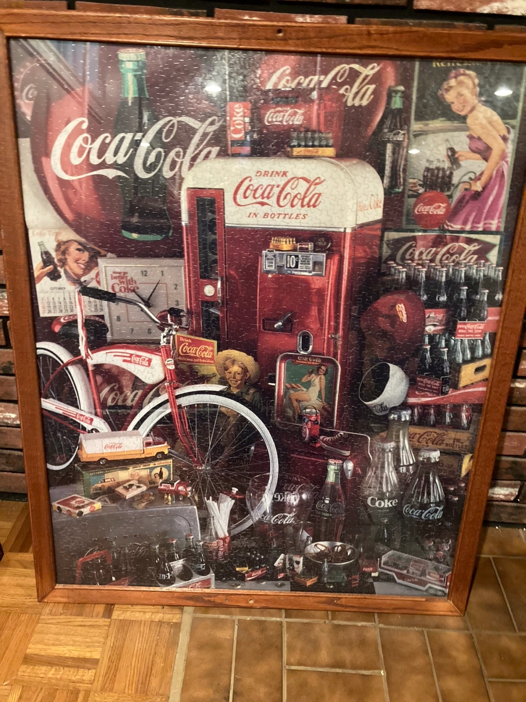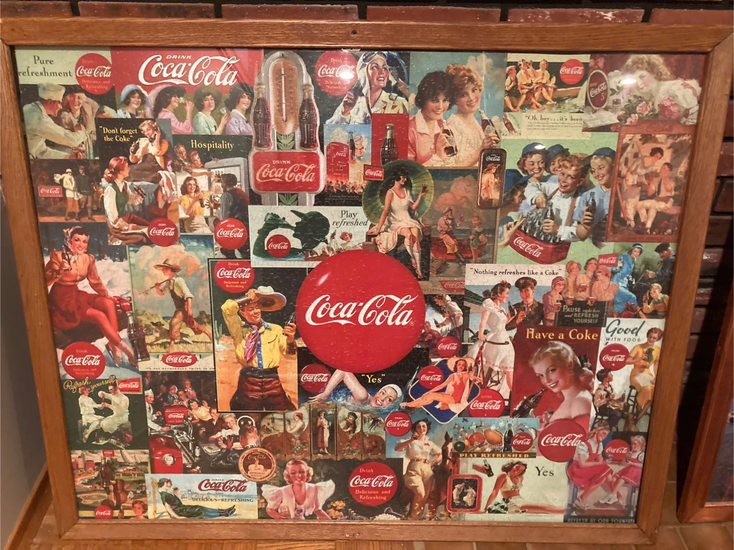 Here's a framed collage featuring classic Coca-Cola imagery! It's a real conversation starter and would look great in a retro-themed space. Perfect for any Coca-Cola collector or vintage enthusiast!