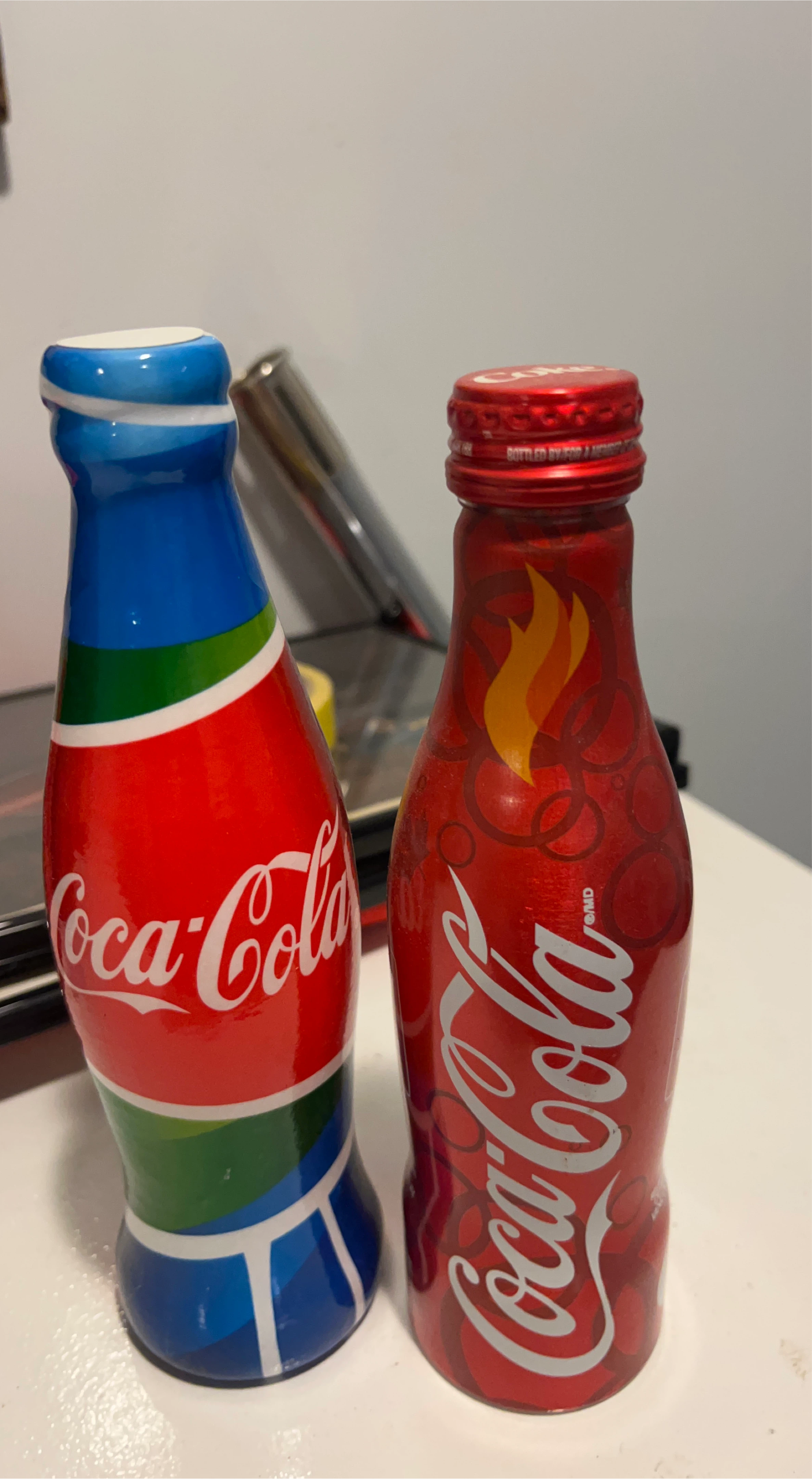 10Selling a set of two unique Coca-Cola bottles. One is red with a flame design from 2010 Vancouver Olympics - full unopened aluminum can. The other features a blue, green, and red design which is plastic and lights up Great for collectors or Coca-Cola enthusiasts!