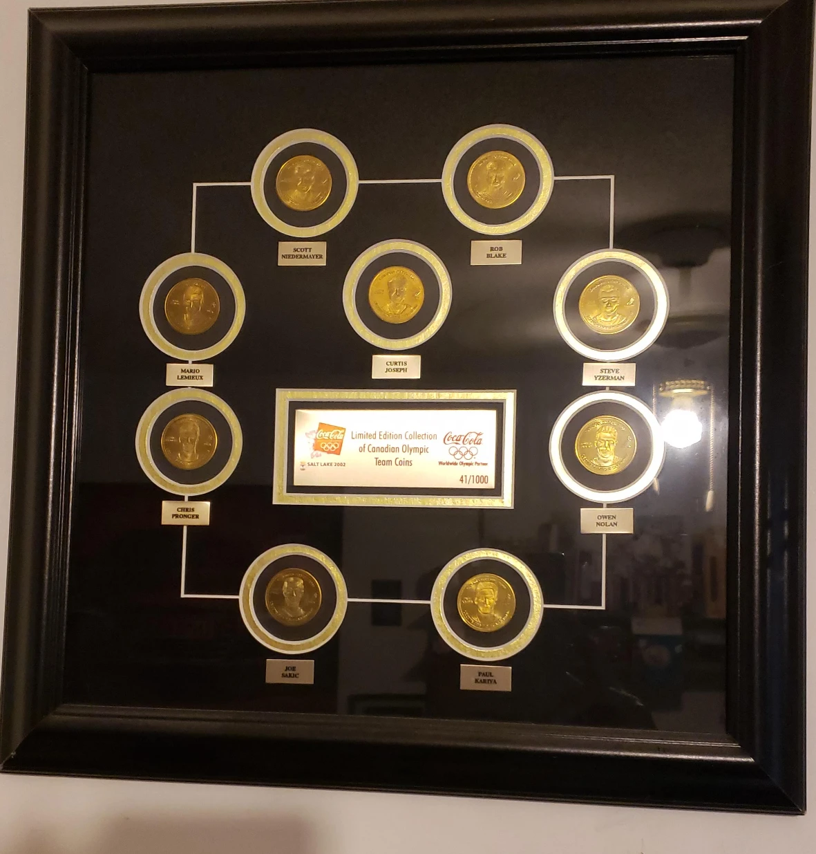 170Selling a framed limited edition Coca-Cola collection of Canadian Olympic Team coins form Salt Lake City 2002. It features Mario Lemieux, Chris Pronger, Scott Niedermayer, Rob Blake, Curtis Joseph, Steve Yzerman, Owen Nolan, Joe Sakic, and Paul Kariya. It's number 41 out of 1000. Message if interested.